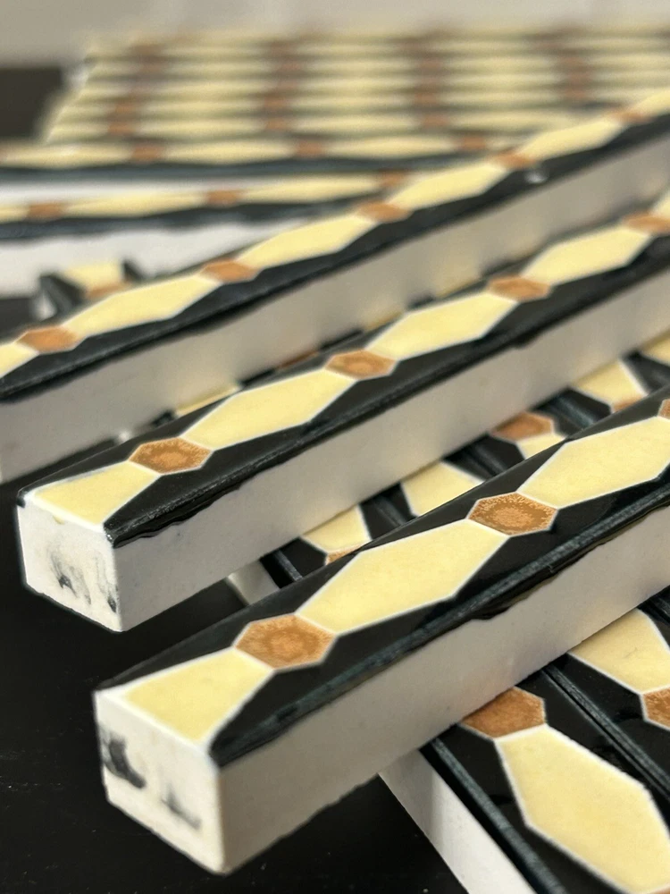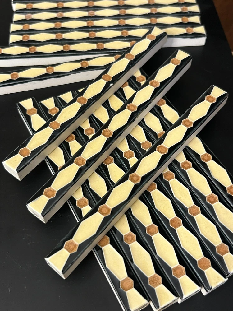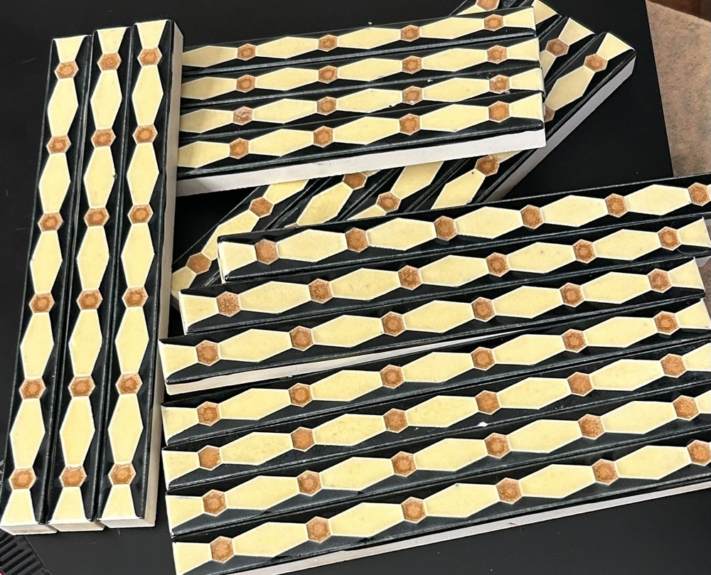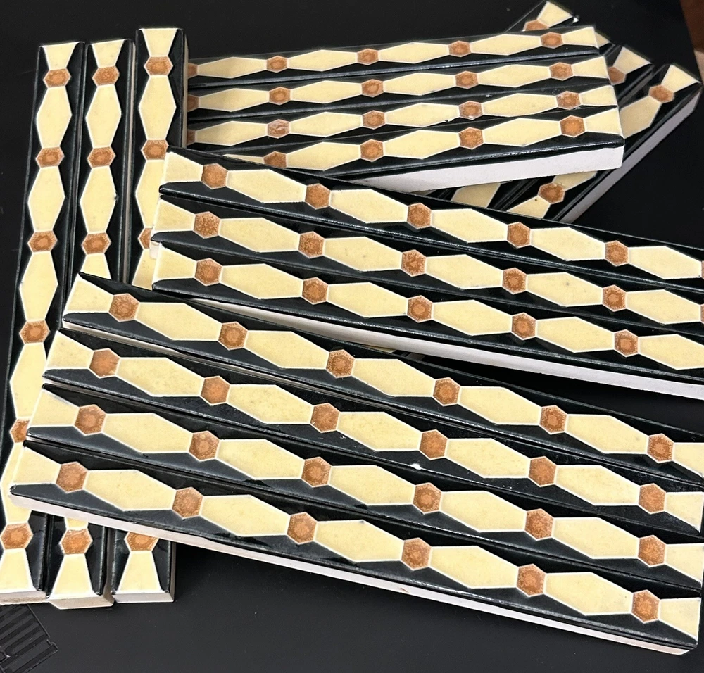 Real nice Franklin Liner Tiles, from a tile shop in the Philadelphia area that closed in the early years of the Great Depression, 1931-1932. One lot that contains 18 tiles. Black background and brown are glossy, beige has more of a satin, matte finish, nice contrast. 1/2" x 6" x 3/8". Shipping is $12.00 I combine shipping