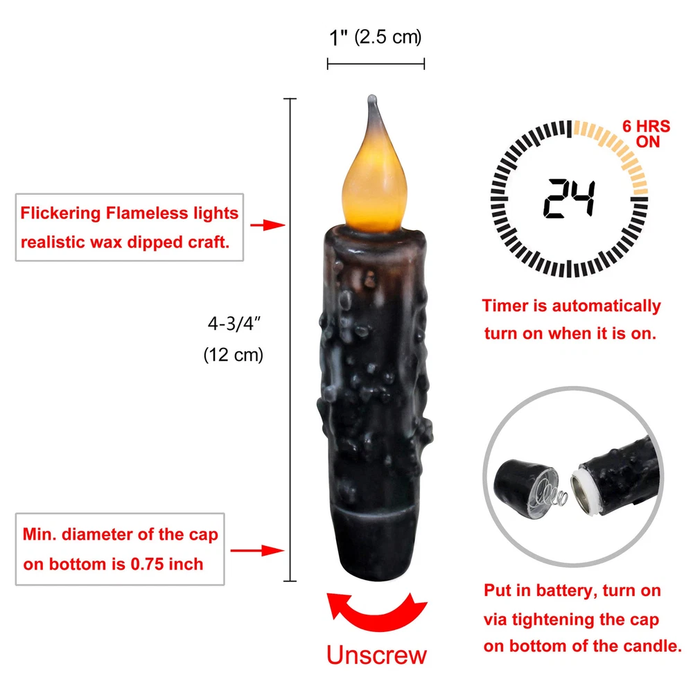 Made of vintage-inspired wax hand dipped handicraft and classic textured finished. The drips down like a real candle and look amazing Measures of flameless candle is 4-3/4"L x 1"D, each battery operated candle uses 1 AA batteries ( Not included ), tighten or loose the cap on bottom of the battery operated candles for ON/OFF, timer setting the candle to stay on for 6 hours and then go off for 18 hours The base of flameless candles is tapered, perfectly fit any standard taper holder and taper accessories The farmhouse tapers candle use as a decorative accent piece for countertop, tables, shelves, walls, windows, candlesticks or any room. You're sure to find lots of uses for these charming handmade candles, whether you adorn a room, use as accents piece for any crafts projects or make them to your gifts. Primitives texture wax coating and flickering candlelight, offers a softly and warm light. Perfect for home decor, holiday décor, Christmas decor, Thanksgiving present, Halloween decor, New Year, Valentine's Day, dinner parties, weddings decor, birthday party, churches, candle light vigils, floral arrangements, other festival celebrate and more