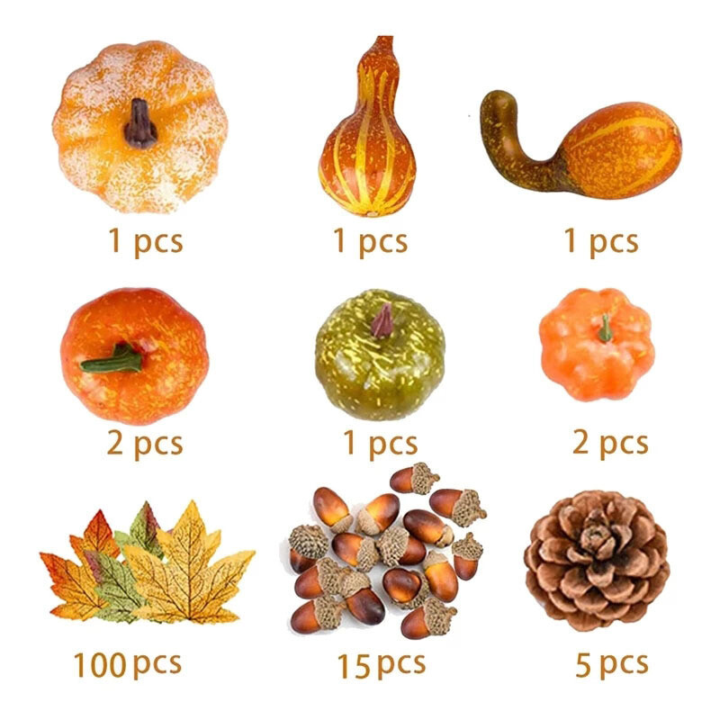 Features: Realistic Harvest Decor: Create a festive atmosphere with this set of artificial pumpkins, featuring a variety of sizes and realistic maple leaves for a charming autumn display. Versatile Decoration: Ideal for halloween, thanksgiving, or any autumn event, these faux pumpkins are perfect for wreaths, garlands, and festive party supplies. Durable and Lifelike: Crafted from premium-quality materials, these artificial pumpkins are designed to last season after season, adding a touch of autumn charm to your home decor. Easy to Customize: With assorted sizes and a variety of uses, these pumpkins and maple leaves allow for endless creative possibilities in crafting your own unique fall arrangements. Festive Ambiance: Whether adorning a fall garland or halloween display, these artificial pumpkins bring the warmth and spirit of autumn to any space. Notice: Please allow 1-3cm deviation due to manual measurement Actual color may be slightly different from the image due to different monitor and light effect Description: Material:TPE Size:as shown Package includes: 166pcs*Halloween Ornament