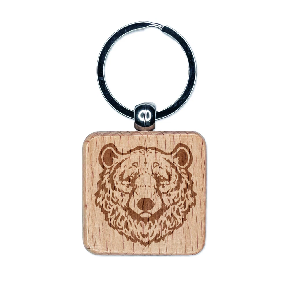 Realistic Black Bear Head Engraved Wood Square Keychain Tag Charm