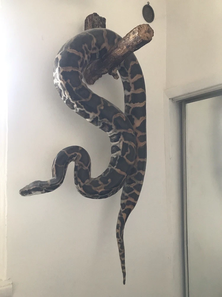 Contact before buying please! Gorgeous, unique, very real like sculpture of an Burmese Python 4’x2’ diameter. Life size sculpture, the snake is about 9’ long, head to tail . Fiberglass made in mold technique Snake and real wood trunk support base. This sculpture was a decor for a reptilian museum.
