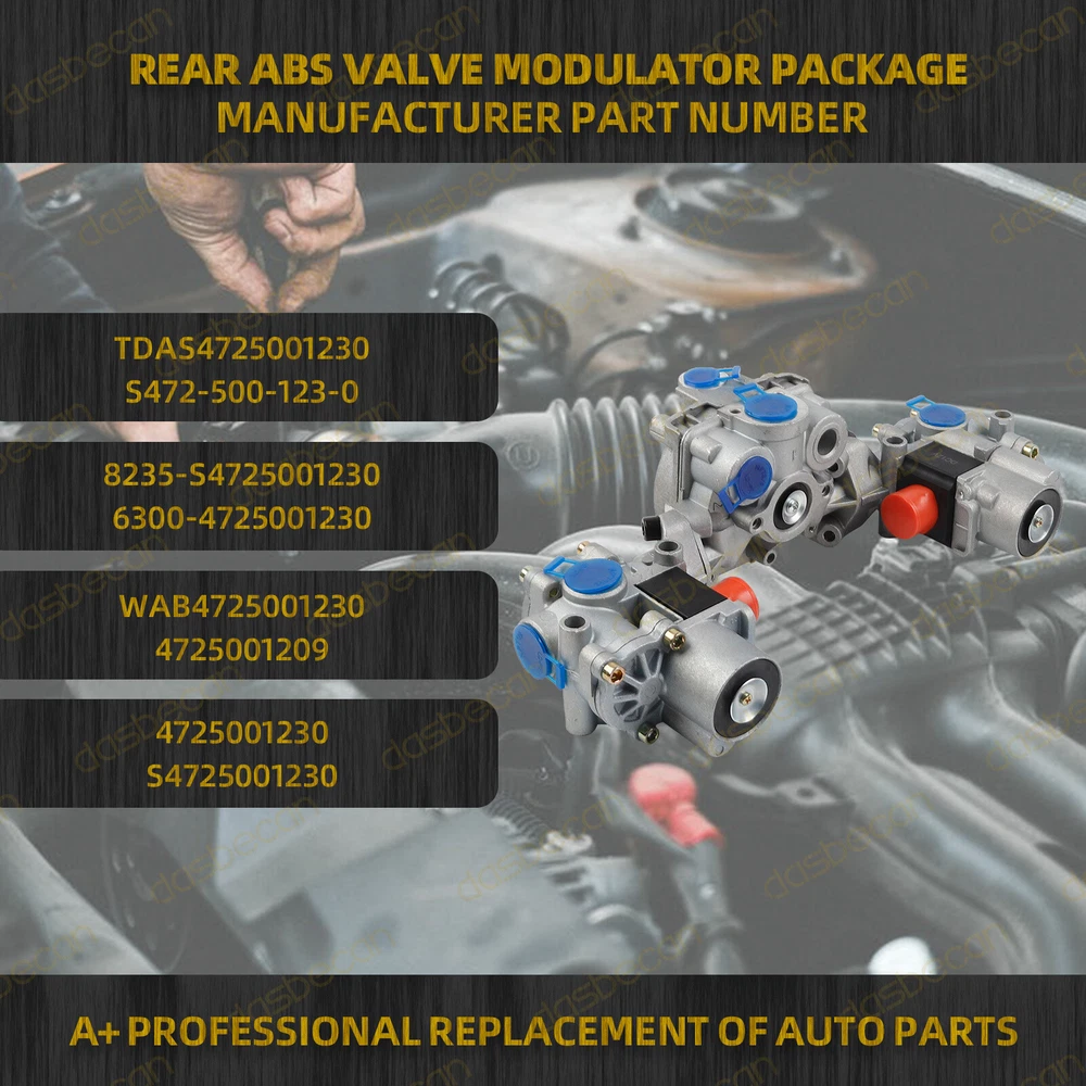 Features & details 【 Compatible With 】 Wabco Rear ABS Valve Modulator Package 【Replace OE Number】 TDAS4725001230, S472-500-123-0 8235-S4725001230, 6300- 4725001230 WAB4725001230, 4725001209 4725001230, S4725001230 【 Description 】 System: 4S/4M, 6S/4M Electrical connection: DIN 72585-A1-3.1-Sn/K1 Voltage: 12V Max. operating pressure: 11.0 bar Calculated Volume: 6.16 Response pressure: 0.38 bar Temperature range: -40°C to +80°C Port thread 1: 1/2 - 14 Dry Seal NPTF Port thread 2: 3/8 - 18 Dry Seal NPTF Port thread 2.1: 1/2 - 14 Dry Seal NPTF Port thread 2.2: 1/2 - 14 Dry Seal NPTF Port thread 3: Exhaust Port thread 4: 1/4" - 18 Dry Seal NPTF Protection Class: IP66, IP69K 【 Features 】 100% brand new, shown as pictured. Manufactured to strict OE standards, it works like the original components and is designed with the latest technology to ensure a longer product life. Enhances stopping power by reducing stopping distances for improved safety on the road. Prevents wheel lockup during hard braking, allowing for better control even in slippery conditions. Designed for simple installation, ensuring easy integration with most existing trailer air brake systems. Minimizes the risk of brake overheating and warping, extending the lifespan of your braking system. Provides increased confidence and safety for drivers by ensuring optimal braking performance. Weatherproof construction features durable and corrosion-resistant components for long-lasting performance. 【 Package Included 】 1 x ABS Valve Modulator ( as shown in pictures ) 【 Note 】 Please check both part number and models before you buy it to make sure this part will fit. 【Service & Warranty】 Purchase from DASBECAN, enjoy 1 year no worries-warranty, whenever you met issue when installing or using, please contact us via eBay Message, and we will reply within 24 hours and help solve the problem. System: 4S/4M, 6S/4M Electrical connection: DIN 72585-A1-3.1-Sn/K1 Voltage: 12V Max. operating pressure: 11.0 bar Port thread 1: 1/2 - 14 Dry Seal NPTF Port thread 2: 3/8 - 18 Dry Seal NPTF Port thread 2.1: 1/2 - 14 Dry Seal NPTF Port thread 2.2: 1/2 - 14 Dry Seal NPTF Port thread 3: Exhaust Port thread 4: 1/4" - 18 Dry Seal NPTF Calculated Volume: 6.16 Response pressure: 0.38 bar Temperature range: -40°C to +80°C Protection Class: IP66, IP69K Customer Question & Answers Q1: Will This Part Fit My Vehicle? We list all the compatiblity, if your vehicle does not show up on the compatibility table at the top of our listings, welcome you to contact us for free consulation before purchasing a product. Q2: Does they come with warranty? All of our product comes with 1-year warranty, but some times you need to pay the shipping fee. Q3: How to use it? If you don't know how to install this accessory, welcome to contact us, we will provide you with a video guide. Payment Shipping Warranty & Service Returns/Exchanges Contact us Payment Most of the payment methods are available, such as Paypal, Payoneer, Credit Card. Within 1 day of receiving your payment, we will start processing your order. Shipping All Items Will Be Ship Within 1working Days, and We Will Ship out All Orders As Soon As Possible After Payment Verified, Please Allow up to 1-6 Business Days for Delivery. Why Choose the Us Stock? 1. Us Local Shipping, No Extra Customs Cost. 2. Fast Delivery: 1-6 Working Days Delivery. Warranty & Service All the product in our store come with a 1-year-warranty. If there is a problem with the product you purchased within 1 year, please contact us, we will provide you with after-sale protection. Our job is not complete until each customer is satisfied! Receiving positive feedback is extremely important to us. We give all our buyers positive feedback as soon as payment is received Negative feedback and bad ratings do not solve the problem! If you contact us via eBay, we will be more than happy to work with you! Returns/Exchanges If you received an incorrect, damaged, defective, or item not as described , contact us for a partial/full refund or replacement on our costs. If we shipped you the wrong part, we pay for the return shipment and send you the correct part. If you ordered the wrong part, contact us for a return address and simply return it,give us a tracking number. We will send you the new item as soon as the returned package is received; If you simply don't want the part, ship it back and give us a tracking number. After we receive the item, we will refund the item price minus shipping costs. All returns must be done within 30 days after receiving the package. Parts must be new and unused in the original condition: including box, packaging and all other accessories,or we will charge you a partial costs. Contact us If you encounter any problems during purchase or use, please contact us via eBay message directly. On Jan 6, 2025 at 00:26:33 PST, seller added the following information: