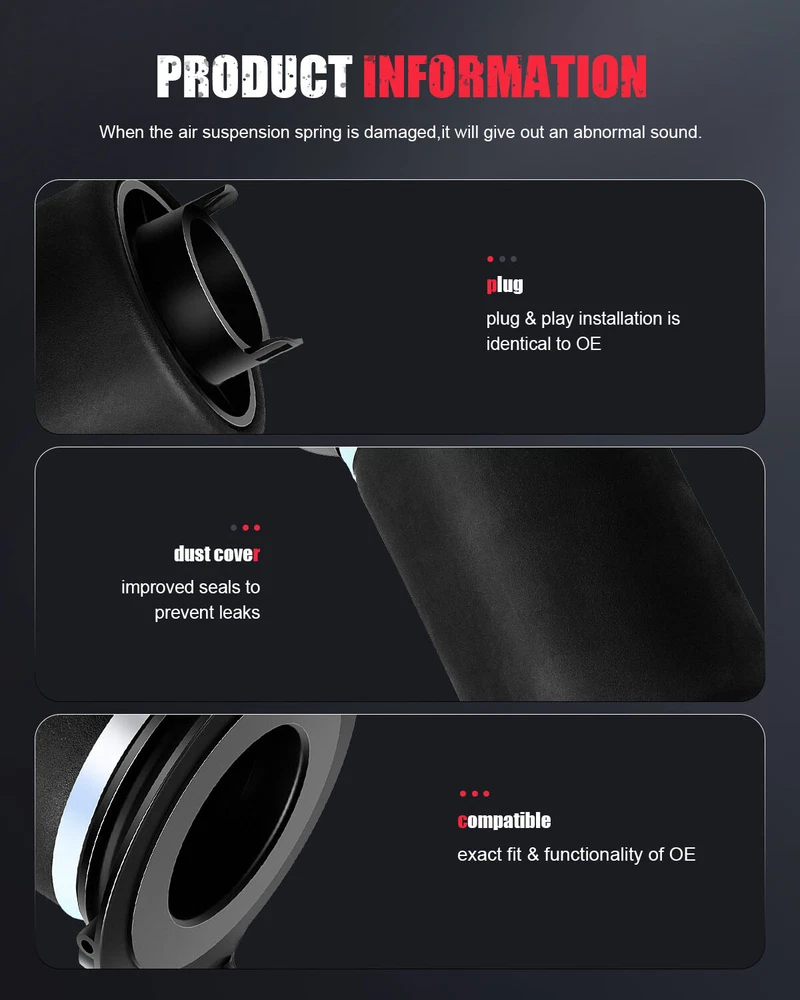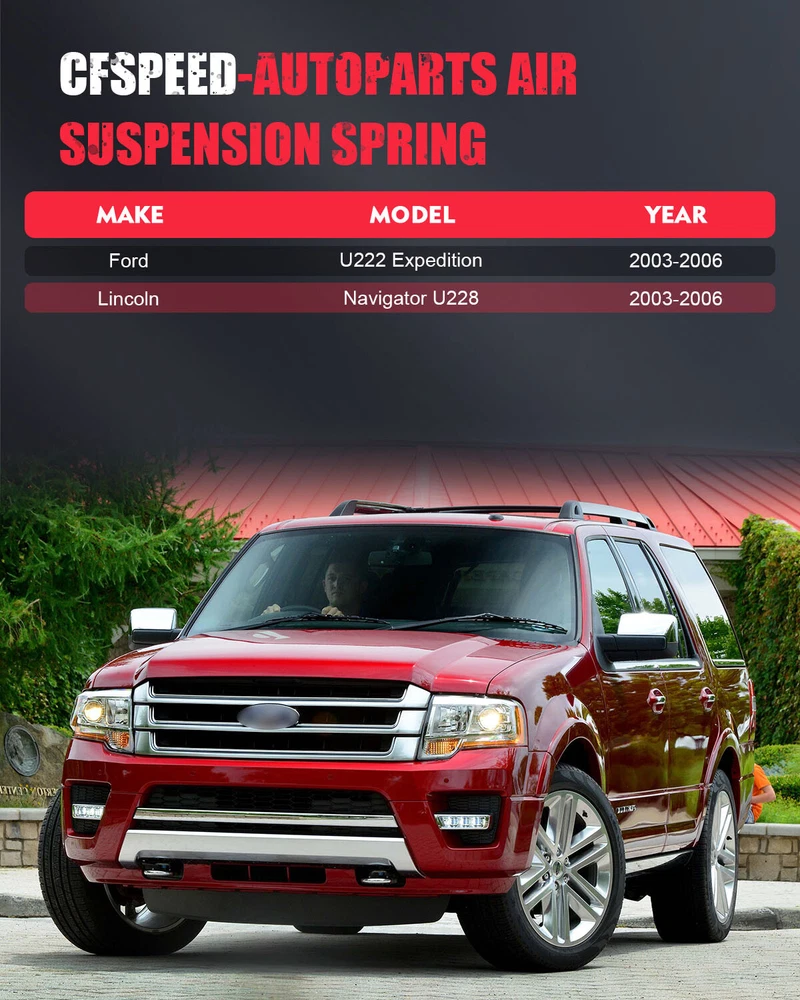 *OEM Part Number: 7L1Z5A891B,8L1Z5A891B *Item Specifications: Key Words: Rear Air Suspension Spring Bag For Ford Expedition U324 2007-2017 Lincoln Navigator U326 2007-2017 Package Includes: Single for Rear Left or Right Air Suspension Spring Bag Notes: Please double confirm the compatibility as well as the OEM number before purchasing. Instruction is not included. Professional installation is recommended. *Compatibility Chart: 1, You can distinguish specific model of an automobile by VIN(Vehicle Identification Number). 2, VIN(Vehicle Identification Number) consists of total 17 English letters and arabic digits. Rear Air Suspension Air Spring For Ford Ford Expedition Lincoln Navigator U324 *OEM Part Number: 7L1Z5A891B,8L1Z5A891B *Item Specifications: Key Words: Rear Air Suspension Spring Bag For Ford Expedition U324 2007-2017 Lincoln Navigator U326 2007-2017 Package Includes: Single for Rear Left or Right Air Suspension Spring Bag Notes : Please double confirm the compatibility as well as the OEM number before purchasing. Instruction is not included. Professional installation is recommended. *Compatibility Chart: 1, You can distinguish specific model of an automobile by VIN(Vehicle Identification Number). 2, VIN(Vehicle Identification Number) consists of total 17 English letters and arabic digits. 3, VIN does not include the letters I (i), O (o), and Q (q) (to avoid confusion with numerals 1 and 0). Ford Expedition U324 Eddie Bauer Max Sport Utility 4-Door 5.4L 2007-2008 Eddie Bauer Sport Utility 4-Door 5.4L 2007-2010 EL Eddie Bauer Sport Utility 4-Door 5.4L 2007-2010 EL King Ranch Sport Utility 4-Door 3.5L 2015-2016 EL King Ranch Sport Utility 4-Door 5.4L 2008-2014 EL Limited Sport Utility 4-Door 3.5L 2015-2016 EL Limited Sport Utility 4-Door 5.4L 2007-2014 EL Platinum Sport Utility 4-Door 3.5L 2015-2016 EL SSV Sport Utility 4-Door 3.5L 2016 EL XL Sport Utility 4-Door 3.5L 2015-2016 EL XL Sport Utility 4-Door 5.4L 2011-2014 EL XLT Sport Utility 4-Door 3.5L 2015-2016 EL XLT Sport Utility 4-Door 5.4L 2007-2014 Funkmaster Flex Edition Sport Utility 4-Door 5.4L 2008 King Ranch Sport Utility 4-Door 3.5L 2015-2016 King Ranch Sport Utility 4-Door 5.4L 2008-2014 Limited Sport Utility 4-Door 3.5L 2015-2016 Limited Sport Utility 4-Door 5.4L 2007-2014 Max Eddie Bauer Sport Utility 4-Door 5.4L 2007-2010 Max King Ranch Sport Utility 4-Door 5.4L 2009-2011 Max Limited Sport Utility 4-Door 3.5L 2015-2016 Max Limited Sport Utility 4-Door 5.4L 2007-2014 Max XL Sport Utility 4-Door 3.5L 2015-2016 Max XL Sport Utility 4-Door 5.4L 2011 2014 Platinum Sport Utility 4-Door 3.5L 2015-2016 SSV Sport Utility 4-Door 3.5L 2014-2016 XL Sport Utility 4-Door 3.5L 2015-2016 XL Sport Utility 4-Door 5.4L 2011-2014 XLT Sport Utility 4-Door 3.5L 2015-2016 XLT Sport Utility 4-Door 5.4L 2007-2014 Lincoln Navigator U326 Base Sport Utility 4-Door 3.5L 2015-2016 Base Sport Utility 4-Door 5.4L 2008-2014 L Executive Sport Utility 4-Door 5.4L 2013-2014 L Luxury Sport Utility 4-Door 5.4L 2007 L Reserve Sport Utility 4-Door 3.5L 2015-2016 L Select Sport Utility 4-Door 3.5L 2016 L Sport Utility 4-Door 3.5L 2015 L Sport Utility 4-Door 5.4L 2008-2014 L Ultimate Sport Utility 4-Door 5.4L 2007-2009 2013-2014 Limited Sport Utility 4-Door 5.4L 2013-2014 Luxury Sport Utility 4-Door 5.4L 2007 Reserve Sport Utility 4-Door 3.5L 2015-2016 Select Sport Utility 4-Door 3.5L 2016 Ultimate Sport Utility 4-Door 5.4L 2007-2014 * Generation & Evolution: Ford Expedition UN93 First generation (1997-2002) U222 Second generation (2003-2006) U324 Third generation (2007-2017) U553 Fourth generation (2018-present) Lincoln Navigator Based directly on the Ford Expedition UN173 First generation (1998-2002) U228 Second generation (2003-2006) U326 Third generation (2007-2017) U554 Fourth generation (2018-present) *Platform Drive Layout : Front Engine-Rear Wheel Drive Layout Front Engine-Four Wheel Drive Layout Item Specifics Placement on Vehicle Left Right Rear Type Air Suspension Air Spring Fitment Type Direct Replacement Size Single Dimension(CM) 31.75(Length)*20.32(Width)*20.32(Height) Single Weight(KG) 1.800 Upper Mounting Isolator Included No Isolator Required Lower Mounting Isolator Included No Isolator Required Upper Mount Type Base Cup Lower Mount Type Base Cup Included Hardware Mounting Hardware Drive Layout Front Engine RWD/2WD Platform U326 U324 Custom Bundle No Material Iron,Aluminium Alloy,Rubber Quantity Single Manufacturer Warranty 1 Year OE Spec or Performance/Custom OE Spec Adjustable Yes Features Sealed Brand cfspeed-autoparts Manufacturer Part Number C11007101APS Interchange Part Number Air Suspension Spring Bag, Air Ride Spring Bag Superseded Part Number 8L1Z5A891B Important Notice Just like the picture, Professional installation required Instruction Manual No Metal Fitting Connection Design Standard Hose Thread Payment PayPal preferred. Payments are expected within 7 days after the last winning auction is closed; Otherwise Unpaid Item Dispute will be filed with eBay. Shipping Product will be shipped within 2 business days after full payment is received and verified. Delivery Time is about 3-7 business days to most of countries. All domestic orders will be shipped via USPS, UPS or FedEx from our US warehouse and usually arrives to your door in about 3-5 business days. We ship the package to your shipping address in eBay instead of the one in PayPal. Please tell us your shipping address if it is different from the one in eBay. The tracking number will be given for the customer to check the shipping status online (registered or faster service only). We are not responsible for any wrong or undeliverable addresses. Please verify and update your shipping address on eBay during checkout. Returns WARNING : Cancer and Reproductive Harm - www.P65Warnings.ca.gov. We stand behind every product we sell. All of our brand new items come with a 60-Days money-back guarantee. We define the item as defective only if it doesn't function as described. It is the buy