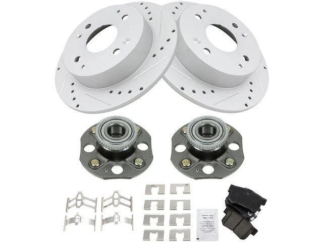 Rear Brake Pad and Rotor and Wheel Hub Kit fits Accord 1998-2002 33VMXC Rear Brake Pad and Rotor and Wheel Hub Kit fits Accord 1998-2002 33VMXC Position: Rear Brand: TRQ Brake Pad and Rotor and Wheel Hub Kit Condition: New Product Description Notes: Ceramic Performance Brake Pad & Rotor Kit with Pad Wear Sensor -- with 4 Wheel Disc Brakes Features: Ceramic Improved Stopping Power: Cross-drilled slotted to reduce brake fade Longer Lasting: True non-interference vane design for optimized cooling Positive Molded: Less dust resulting in cleaner wheels Multi-Layer Shim: Reduced noise and vibration Direct Replacement: No modifications necessary Product Specifications Coating: Premium G-Coated Grade Type: Performance Type: Performance Surface Type: Slotted X Drilled Package Contents: (2) Rear Wheel Bearing & Hub Assemblies; (1) Rear Ceramic Brake Pad Set with Contact Point Grease & Hardware; (2) Rear G-Coated Performance Brake Rotors Detailed Applications Years Vehicle Engine 1998-2002 Honda Accord 2.3L 4 Cyl Warranty Coverage Policy 12 Month Warranty 30 Day Return Policy Return shipping paid by: Buyer Item must be returned within: 30 Days Refund will be given as: Money Back DO NOT SEND RETURNS BACK WITHOUT A VALID RMA NUMBER If you have an issue after receiving your part, please email us directly through eBay