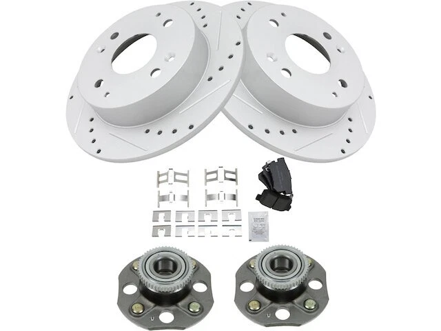 Rear Brake Pad and Rotor and Wheel Hub Kit fits Accord 1998-2002 39WQSC Rear Brake Pad and Rotor and Wheel Hub Kit fits Accord 1998-2002 39WQSC Position: Rear Brand: TRQ Brake Pad and Rotor and Wheel Hub Kit Condition: New Product Description Notes: Brake Pad & Rotor Kit -- with 4 Wheel Disc Brakes Features: Semi-Metallic Improved Stopping Power: Cross-drilled slotted to reduce brake fade Longer Lasting: True non-interference vane design for optimized cooling Positive Molded: Less dust resulting in cleaner wheels Multi-Layer Shim: Reduced noise and vibration Direct Replacement: No modifications necessary Product Specifications Coating: Premium G-Coated Type: Performance Package Contents: (2) Rear Wheel Bearing & Hub Assemblies; (1) Rear Semi-Metallic Brake Pad Set with Contact Point Grease & Hardware; (2) Rear G-Coated Performance Brake Rotors Detailed Applications Years Vehicle Engine 1998-2002 Honda Accord 2.3L 4 Cyl Warranty Coverage Policy 12 Month Warranty 30 Day Return Policy Return shipping paid by: Buyer Item must be returned within: 30 Days Refund will be given as: Money Back DO NOT SEND RETURNS BACK WITHOUT A VALID RMA NUMBER If you have an issue after receiving your part, please email us directly through eBay