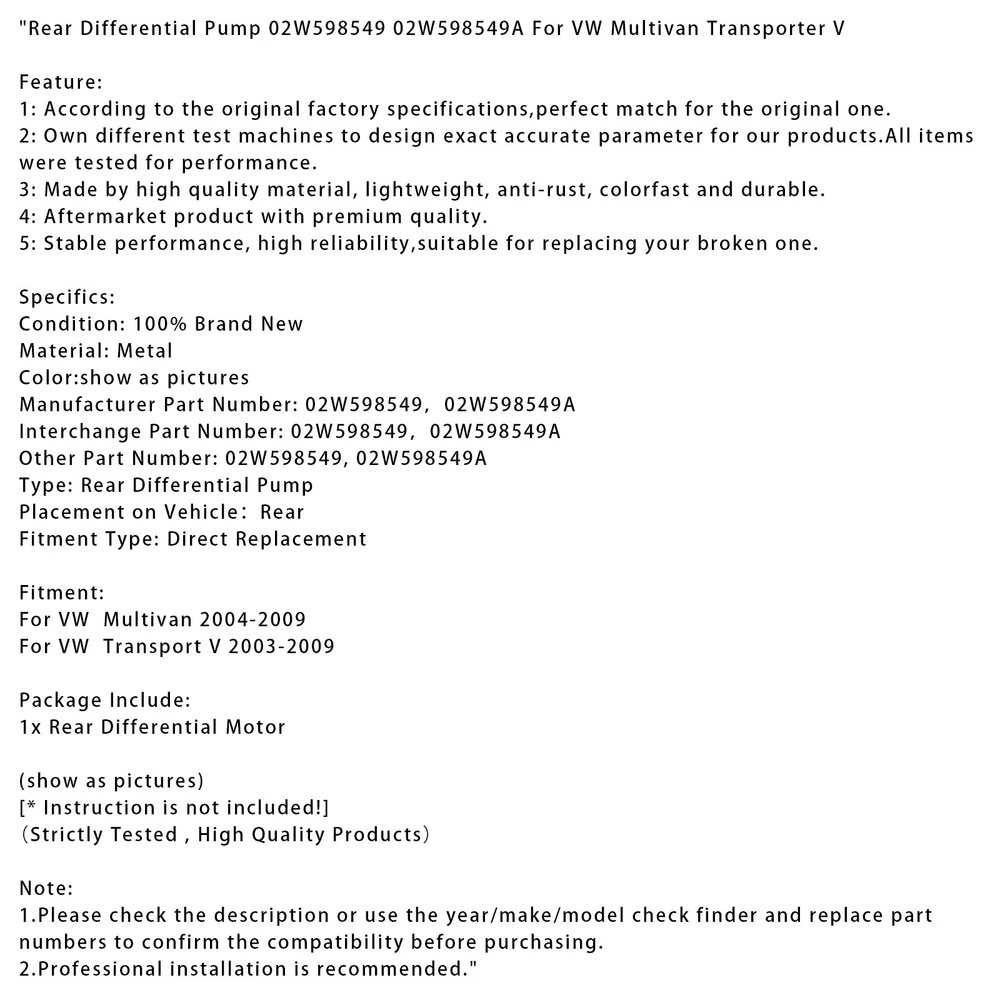 You may also like Front Differential Actuator 41400-34013 For Toyota Tacoma Tundra 2000-2006 132.69 USD Free shipping Rear Differential Drive Sprocket A2463506900 For Mercedes W246 CLA250 B25 A45 369.63 USD Free shipping Auto Trans Differential Case Cup 45822-3B250 For Santa Fe Sorento Sportage 15-22 193.63 USD Free shipping Rear Coupling Diff AWD Pump LR008958 For Land Rover Freelander 2 2009-2015 130.63 USD Free shipping Coupling Assembly Electric 38761JG20A 38761JG20B For Nissan Rogue 2008-2012 299.88 USD Free shipping Rear Differential Pump 9V4N4C019AA 1589740 For Ford Kuga 2008-2012 AWD 94.63 USD Free shipping Locker Axle SL D44-30 Posi 30 Spline For Dana 44 Yukon Spartan Locker🔩 222.78 USD Free shipping Rear Differential Lock Motor 68214628AA For Jeep Grand Cherokee Durango 14-2021 130.78 USD Free shipping Viscous Coupler DV614K004D CV6W4000AC For Ford Escape 2013-2019 319.88 USD Free shipping AWD Coupling Oil Pump 22765779 For Cadillac SRX 10-16 XTS 14-19 Buick LaCrosse 108.78 USD Free shipping Transmission A6LF2 A6LF3 AWD Differential Cover 45822-3B450 For Hyundai Kia 201.63 USD Free shipping Precharge Pump 8675234 AWD Generation I DS118577 For Volvo S60 132.63 USD Free shipping 8.8" Traclok Posi Clutch Pack Kit Lsd Spider Gears Fit Ford 8.8" Truck Rearend 99.88 USD Free shipping Differential Oil Pump 31256757 For Land Rover Freelander 2 Evoque Ford Kuga 92.63 USD Free shipping Rear Motor Differential Actuator Oil Pump Coupling Fits Kia Sorento Sportage AWD 85.88 USD Free shipping Rear Wheel Drive Module Clutch Kit 42769821 For Chevrolet Buick 2013-2022 651.63 USD Free shipping All Models For Honda For Suzuki For Kawasaki For Yamaha For BMW For Polaris For CFmoto For Ducati For Benelli For Trident For Triumph For Aprilia Other part You may also like Alternator Magneto Stator Fit Honda XR 250 R XR250 XR250R 1986-95 31120-KT1-004 46.78 USD Free shipping Diesel Exhaust Fluid DEF Heater for Ford F250 F350 F450 Super Duty BC3Z-5J225-KA 178.63 USD Free shipping 45MM Handle Bar Clip On For Honda CBR600RR 03~2004 CBR900RR Suzuki GSXR600 54.63 USD Free shipping NEW Short Clutch Brake Lever fit for DAYTONA 955i SRINT ST TT600 34.78 USD Free shipping 4x Rocker Arm SH09-12-150 for Mazda 3 BM/BN 6 GJ/GL CX-5 KF/KE 2.2 diesel 90.78 USD Free shipping PRODUCT DESCRIPTION Rear Differential Pump 02W598549 02W598549A For VW Multivan Transporter V Feature: 1: According to the original factory specifications,perfect match for the original one. 2: Own different test machines to design exact accurate parameter for our products.All items were tested for performance. 3: Made by high quality material, lightweight, anti-rust, colorfast and durable. 4: Aftermarket product with premium quality. 5: Stable performance, high reliability,suitable for replacing your broken one. Specifics: Condition: 100% Brand New Material: Metal Color:show as pictures Manufacturer Part Number: 02W598549,02W598549A Interchange Part Number: 02W598549,02W598549A Other Part Number: 02W598549, 02W598549A Type: Rear Differential Pump Placement on Vehicle:Rear Fitment Type: Direct Replacement Fitment: For VW Multivan 2004-2009 For VW Transport V 2003-2009 Package Include: 1x Rear Differential Motor (show as pictures) [* Instruction is not included!] (Strictly Tested , High Quality Products) Note: 1.Please check the description or use the year/make/model check finder and replace part numbers to confirm the compatibility before purchasing. 2.Professional installation is recommended. About Us Payment Shipping Returns Contact Us About VIPIH VIPIH is one of the international leading distributors specialized in distribution of motor parts of the world's prime motorcycle part suppliers on a global scale with the full responsibility in procurement, shipping, sales and marketing and after sales service. VIPIH fulfills all needs of its clients completely and on a timely basis with the know-how it has built up since it was established and the comprehension knowledge of the sectors standards. The perfectionist approach in product quality, high service availability, strict principle of business follow-up, reliability and the good reputation which has gained strength as a result of customer satisfaction are the most striking components of VIPIH's success. VIPIH is presently capable of supplying all demands for motor parts from the petrol pump to rectifier in a wide range. Free delivery with worldwide shipping options available. If you need any further information before ordering,please get in touch with expert advice. About Item All items sold by us are being described to the best of our abilities, as accurate as possible, and with utmost conscientiousness on our part. However, to avoid any potential oversights, I respectfully request your assistance in helping us to make this a mutually satisfactory transaction by THOROUGHLY reviewing item description and photos, and asking all questions PRIOR TO BIDDING. Customer Satisfactory 1.We back our commitment with superb service, 100% full money back and a customer satisfaction guarantee. 2.I am here and ready to assist you with any questions or concerns you might have before or after the purchase. 3.My goal is to make sure you are a happy customer and pleasant shopping with us. Feedback If you are satisfied with the purchase and our total service, your comment is very important in our business success. Please take a minute to leave us a positive feedback with an overall Detailed Selling Rating (DSR) of 5. Our eBay account setup auto feedback, so eBay system gives you automatically Positive feedback back after your positive feedback left. If you plan to give us a neutral/negative feedback Or open ebay/paypal case, please write to us immediately so that we can do our best to resolve your problem. 1.We only accept PayPal. 2.PayPal is the only online payment method we accept. Please make sure you have a valid/confirmed PayPal account prior bidding. 3.Payment must be made within 3 days of the auction end ti