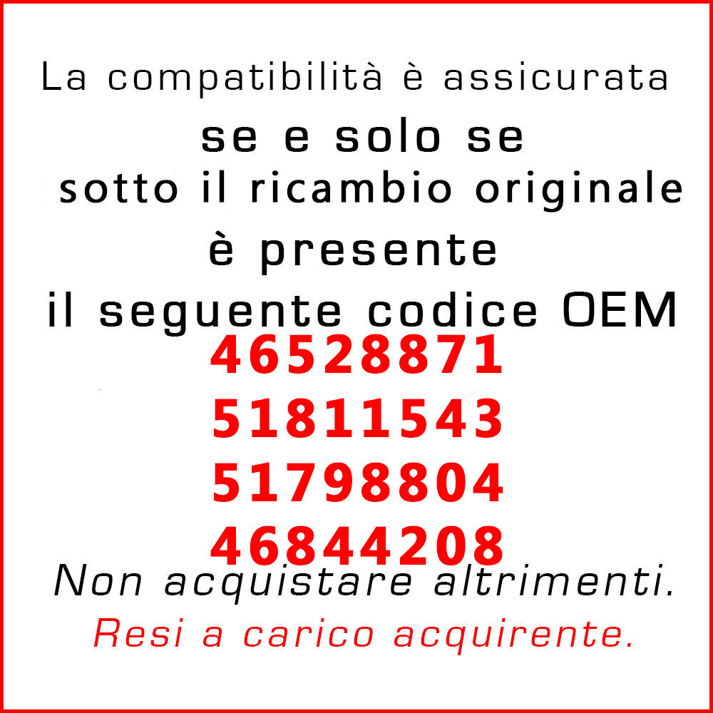 Vinciann Negozio Altre strepitose occasioni (clicca sull'immagine) Newsletter Rimani aggiornato su offerte e nuovi prodotti del nostro Store iscrivendoti alla nostra Newsletter. Iscriviti alla Newsletter Spedizioni Rapide Le spedizioni sono molto rapide. Spedisco sempre entro 24 ore dalla ricezione del pagamento. Spesso entro poche ore. Iscriviti alla Newsletter Aggiungimi ai venditori preferiti Supporto motore posteriore sospensione per Fiat e Lancia vari modelli B24D ✅ Ricambio di Alta Qualità – Sostituisce il supporto motore originale ✅ Codici OEM sostituiti: 46528871, 51811543, 51798804, 46844208 ✅ Materiale resistente: metallo e gomma ad alta resistenza ✅ Prodotto nuovo con spedizione immediata dall’Italia Compatibilità veicoli 🚗 🔹 FIAT Punto II Hatchback 1.2 16V 80cv (1999 - 2006) Punto II Hatchback 1.2 60cv (1999 - 2010) Punto II Hatchback 1.2 Bifuel 60cv (2007 - 2012) Punto II Hatchback 1.2 Bipower 60cv (2001 - 2003) Punto II Hatchback 1.2 Natural Power 60cv (2003 - 2012) Punto II Hatchback 1.2 Natural Power 52cv (2004 - 2006) Punto II Hatchback 1.4 95cv (2003 - 2012) Punto II Hatchback 1.4 97cv (2005 - 2012) Stilo Hatchback 1.9D Multijet 150cv (2005 - 2006) Stilo Multi Wagon 1.9D Multijet 150cv (2005 - 2008) Idea 1.2 16V 80cv (2004 - 2012) Idea 1.4 77cv (2005 - 2016) Idea 1.4 90cv (2003 - 2016) Idea 1.4 16V 95cv (2004 - 2012) Idea 1.4 Flex 82cv (2005 - 2016) Idea 1.4 LPG 78cv (2009 - 2016) Bravo II Hatchback 1.9D Multijet 150cv (2007 - 2014) 🔹 LANCIA Ypsilon II 1.2 60cv (2003 - 2011) Ypsilon II 1.2 80cv (2003 - 2011) Ypsilon II 1.2 69cv (2010 - 2011) Ypsilon II 1.4 78cv (2006 - 2011) Ypsilon II 1.4 16V 95cv (2003 - 2011) Ypsilon II 1.4 LPG 78cv (2010 - 2011) Musa 1.4 95cv (2004 - 2012) Musa 1.4 90cv (2007 - 2012) Musa 1.4 78cv (2005 - 2012) Musa 1.4 LPG 78cv (2010 - 2012) Caratteristiche Tecniche 🛠️ ✔ Materiale : Metallo e gomma per un’ottima resistenza alle sollecitazioni. ✔ Compatibilità garantita con i modelli sopra indicati. ✔ Perfetto per sostituire un supporto motore usurato o danneggiato. Codici OEM sostituiti 🔧 ⚙ 46528871, 51811543, 51798804, 46844208 📌 Attenzione! Verifica la compatibilità con il tuo veicolo prima dell'acquisto. Confronta immagini e codice OEM con il pezzo originale. Condizioni e Spedizione 🚀 ✅ Prodotto nuovo, in pronta consegna ✅ Spedizione immediata dall’Italia con Corriere Espresso ✅ Imballaggio bulk per la massima convenienza ed ecosostenibilità 📩 Hai dubbi? Contattaci per assistenza! Spedizioni sicure ed assicurate È un prodotto nuovo , disponibile in magazzino (in Italia) e pronto per la spedizione immediata, tracciabile . Il servizio di spedizione che vi offriamo è sicuro, garantito e - ribadiamo - tracciabile, a differenza di Posta Prioritaria, servizio tanto economico quanto inaffidabile circa la consegna dei prodotti. Con noi potete rilassarvi! Le nostre spedizioni sono tutte assicurate fino all'intera spesa effettuata. In caso di incidenti riceverete un rimborso completo o procederemo ad una nuova spedizione. Newsletter Clicca qui per iscriverti alla nostra newsletter e rimanere aggiornato su offerte e nuovi prodotti esclusivi del nostro Store. Contatti Per qualsiasi dubbio o domanda su questo ordine non esitare a contattarmi ed a chiedere ulteriori spiegazioni.