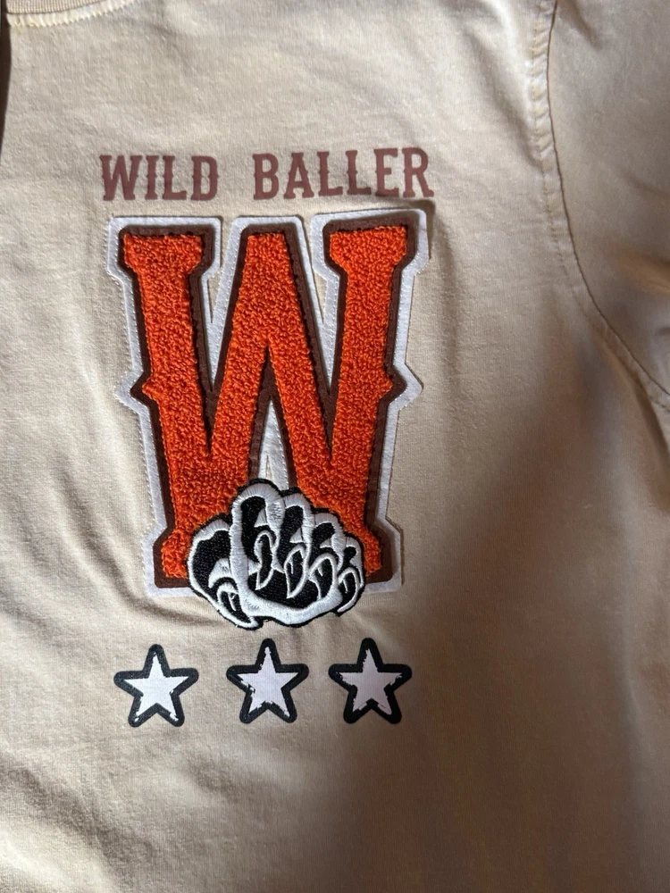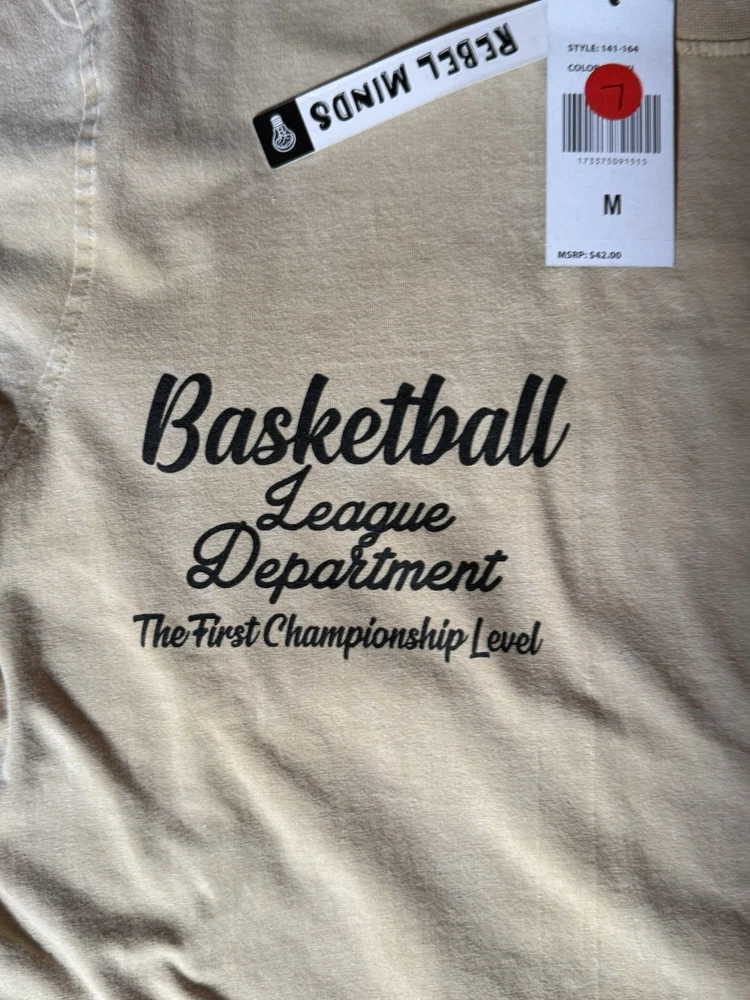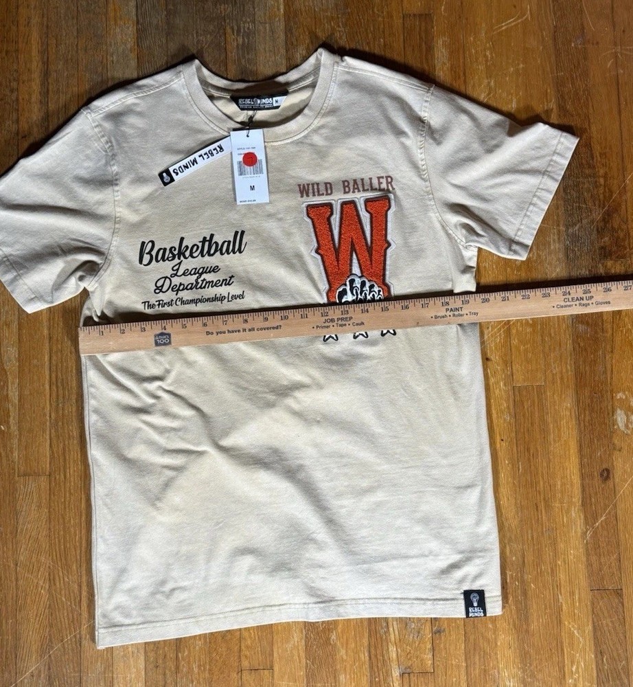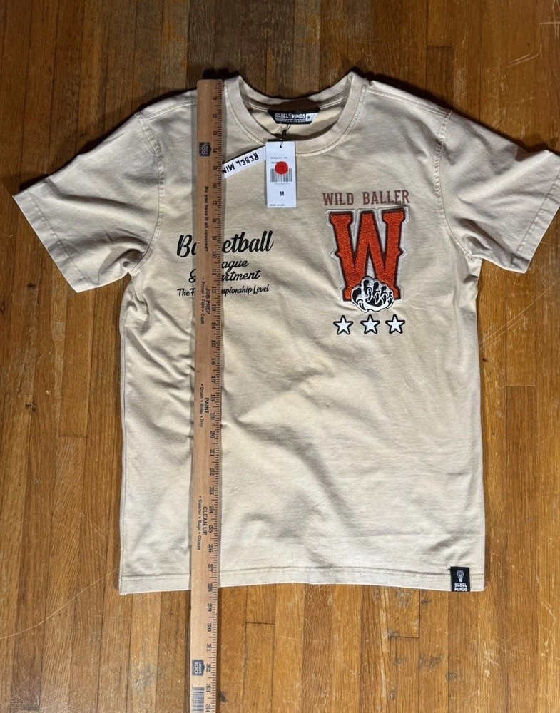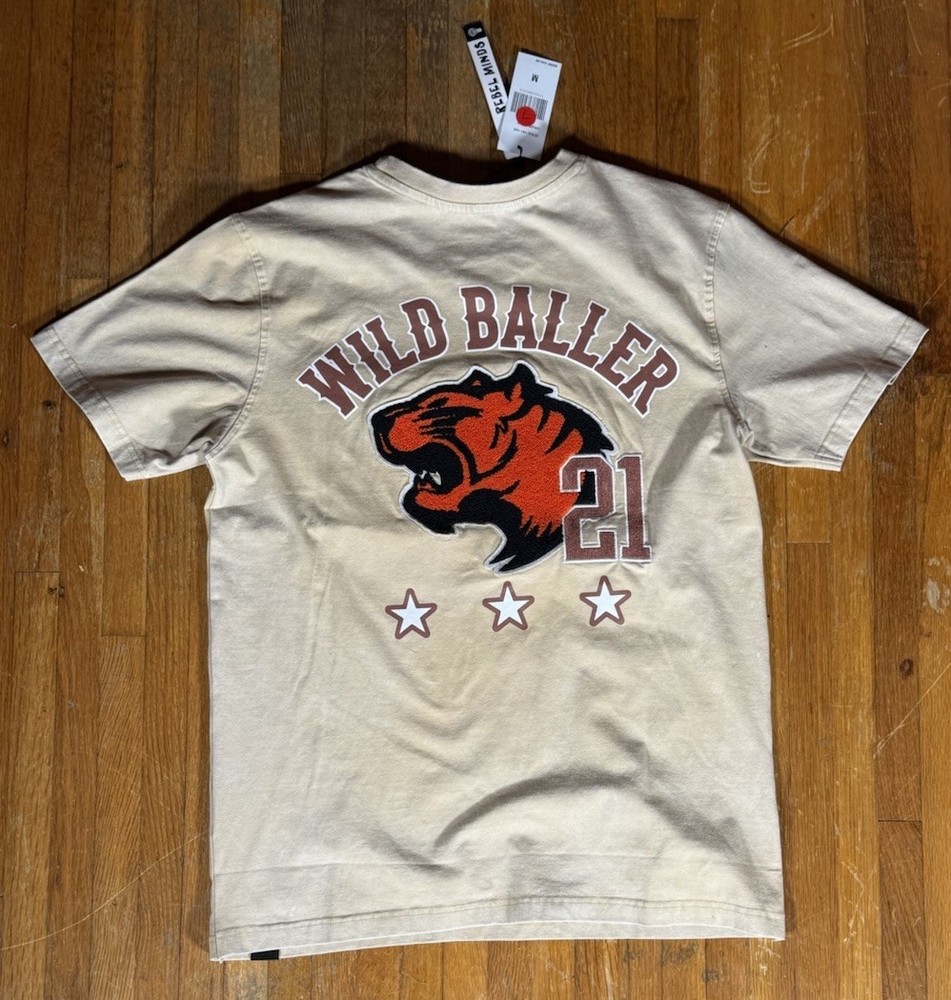 The Rebel Minds Beige Wild Baller Tiger Basketball Graphic Streetwear T Shirt in size M is a bold and stylish addition to any man's wardrobe. Made from comfortable cotton jersey fabric, this short sleeve shirt features a striking graphic print of a tiger, basketball, and stars, adding a touch of urban flair to your outfit. The crew neck and regular fit make it suitable for all seasons, perfect for casual wear in the summer, fall, or spring. Machine washable and easy to care for, this tee is a versatile choice for streetwear enthusiasts looking to make a statement.