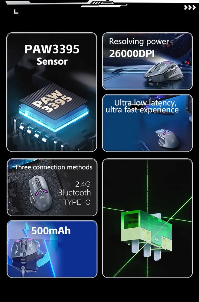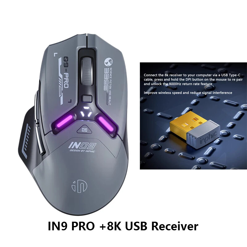 NOTE: Default configuration for 1K receiver, 8K receiver needs to be purchased separately Connect the 8k receiver to your computer via a USB Type-C cable, press and hold the DPI button on the mouse to re pair and unlock the 8000Hz return rate feature Improve wireless speed and reduce signal interference Product parameters: Product model: IN9 PRO Sensor: Primary phase PAW3395 Product size: 129x80x43mm Weight: 92 ± 3g Resolution: 800/1600/3200/6500/13200/26000DPI (DPI can be customized and adjusted by installing drivers) Chip: Shanghai Broadcom Return rate: 125/250/500/1000Hz (adjustable driver installation) Connection method: wired/2.4G wireless/Bluetooth 5.0 Micro motion: Huanuo Green Transparent White Spot 100 million times Rated working current: ≤ 8mA Foot patches: Teflon foot patches Battery capacity: 500mAH Charging interface: Type-C Operating system: Windows XP and above series, suitable for general-purpose mouse systems Packaging List: 1× Mouse 1×1K Receiver 1× Instruction Manual 1× Type-C Charging Cord Supports three connection methods: Wired connection、2.4G wireless、 Bluetooth 5.0 Ergonomic design, conforms to the palm, comfortable grip Original PAW3395 flagship optical sensor 50-26000DPI, from simple Word to intense FPS, meets delicate micro operations in various scenarios 500mAH high battery capacity, intelligent power-saving technology, with a maximum battery life of 120h 16.8 million color illusion RGB monochrome/breathing/multi-color switching 6-key custom macro programming, battery level display. The PTFE material foot patch allows for smooth movement without slipping, providing a stable and textured feel. Anti slip roller with clear markings, providing a better browsing experience up and down