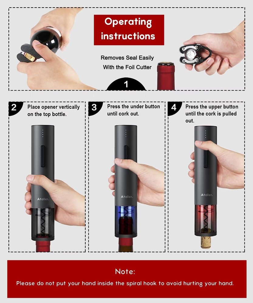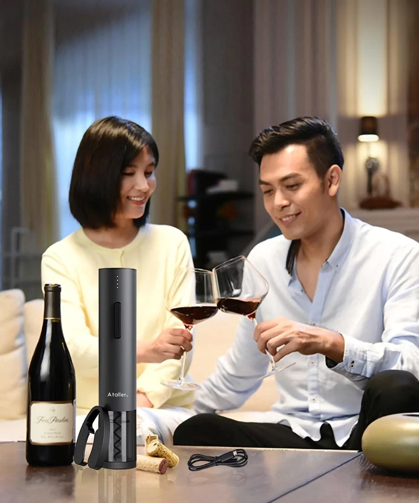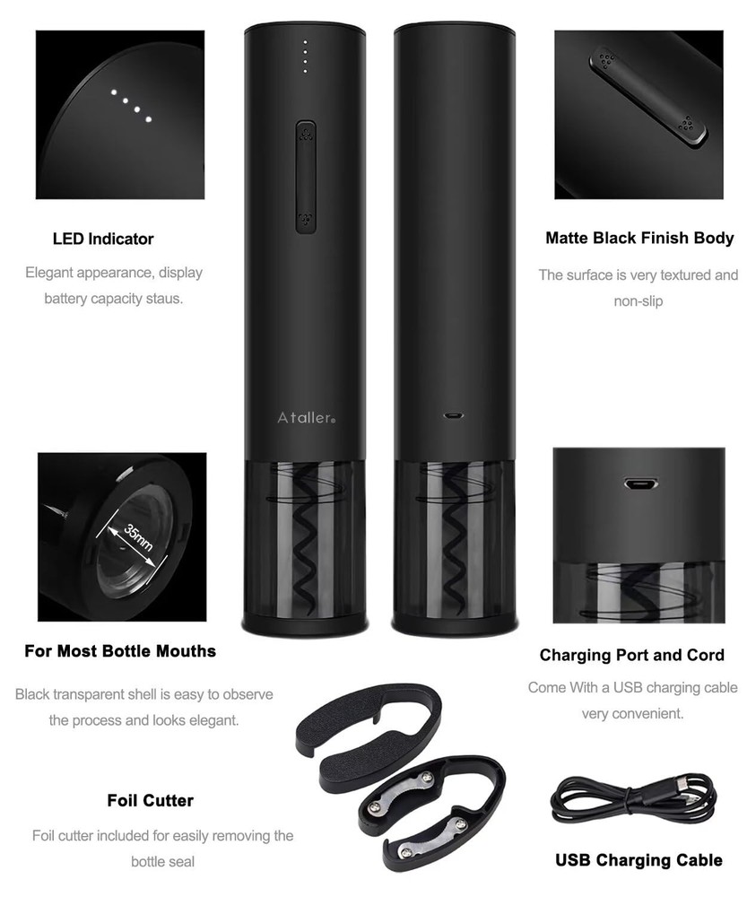 Easy open wine in 6 seconds: Foil cutter included for easily removing the bottle seal; Noiseless and fast, it can safely remove corks in just about 6 seconds, The best choice for wine enthusiast; Destined to become your favorite wine accessory Fashion design: cordless automatic corkscrew opener features a non-slip matte finish exterior with a black transparent shell surrounding the corkscrew mechanism; Blue led is on when removing the cork, Red led is on when exiting the cork, looks very stylish and elegant Powerful and USB rechageable: Built-in rechargeable lithium battery 550mAh battery capacity, Open up to 50-70 bottles on a single charge and charge quickly in 2.5 hours, you can reuse continuously User friendly design: Battery level reminder function displays the power level, you can control the power level and charging at any time; Note: Please charge your wine opener every three months when not in regular use, so as to extend the lifespan of the battery Perfect gift for any occasion: automatic wine opener is a great companion for wine. It's an elegant gift for wine lovers and drinkers at Birthday, New Year's Day, Valentine’s Day, Mother’s Day, Father’s Day, Halloween, Thanks Giving, Christmas, etc