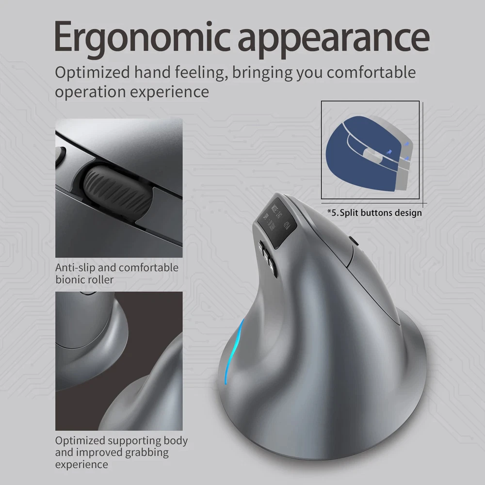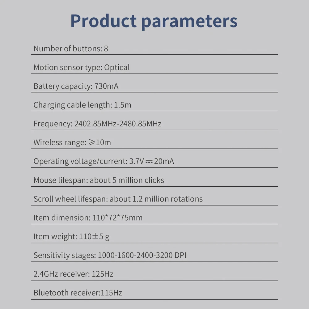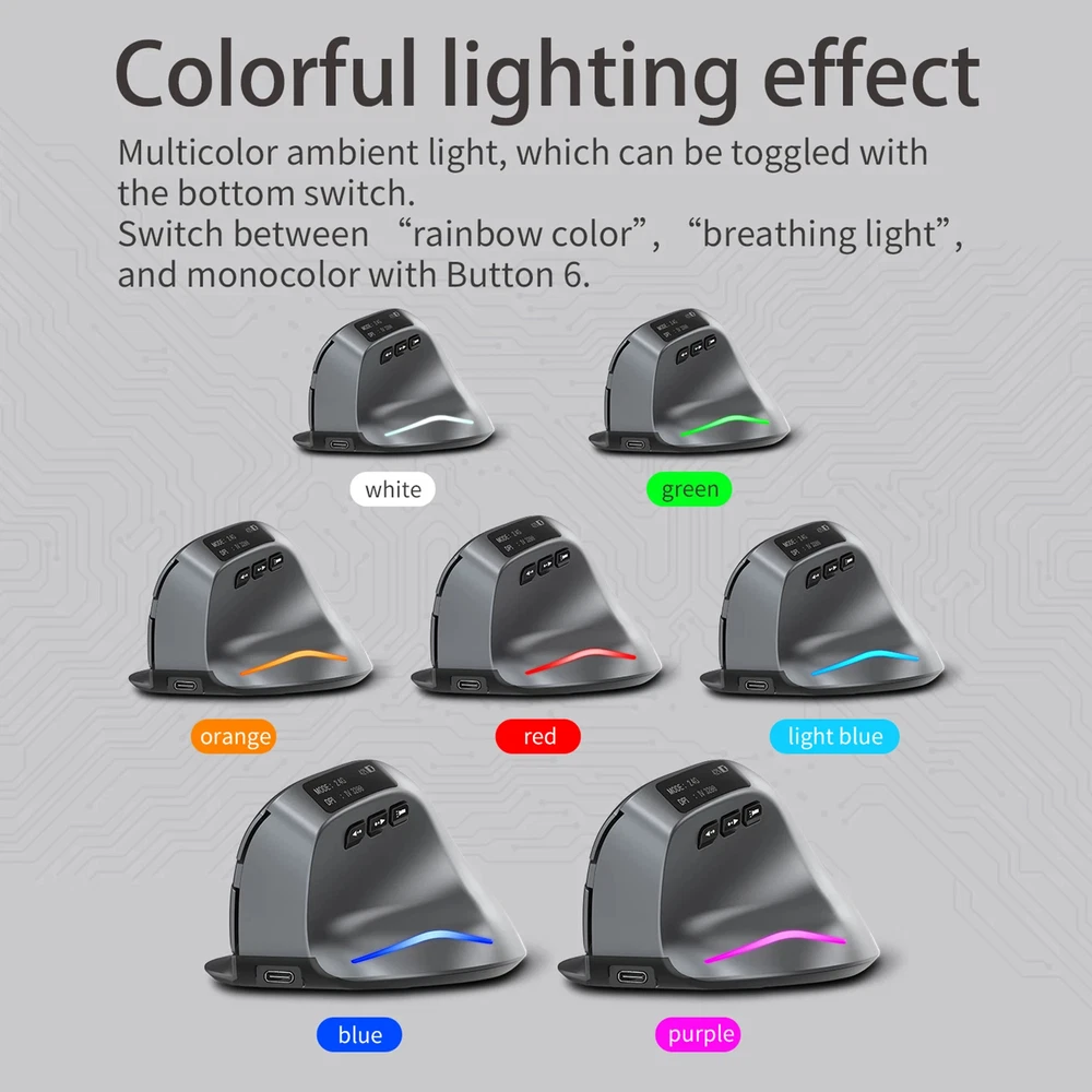 Features: Outstanding mute performance, eliminate unnecessary key sound, enjoy a quiet space. You can plug in the receiver and use the 2.4G wireless mode, or you can use the Bluetooth link to operate two devices at the same time Powerful optical engine provides accurate click, fast response and stable signal. Ergonomic design, suitable for the palm and fingers of the vertical mouse, reduce the use of discomfort, goodbye to the "mouse hand". The four adjustable DPI (1000-1600-2400-3200 DPI) are easy to switch, adapt to various material surfaces, and position accurately and reliably to meet your daily office and gaming needs. 7 color atmosphere light design, surface treatment is delicate, feel comfortable. Specification: ZELOTES F-26C Number of buttons: 8 Motion sensor type: Optical Frequency: 2402.85MHz-2480.85MHz Wireless range: ≥10m Operating voltage/current: 3.7V20mA Mouse lifespan: about 5 million clicks Scroll wheel lifespan: about 1.2 million rotations Item dimension: 110*72*75mm Item weight: 110±5 g Sensitivity stages: 1000-1600-2400-3200 DPI 2.4GHz receiver: 125Hz Bluetooth receiver:115Hz Supported Systems:Windows 2000/ME/XP(64位)/Vista/Win7/Win8/Win10/Win11/Mac OS/ios/Android. Item size:11*7.2*7.5cm/4.33*2.83*2.95 in Packing list: 1 * Mouse 1 * User manua 1 *TYPE-C usb cable