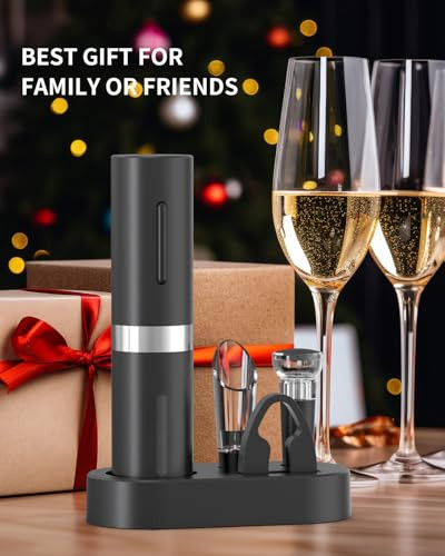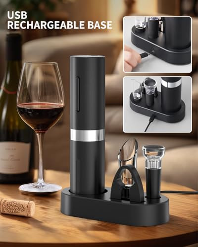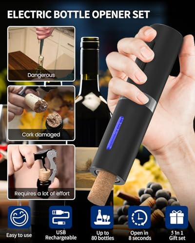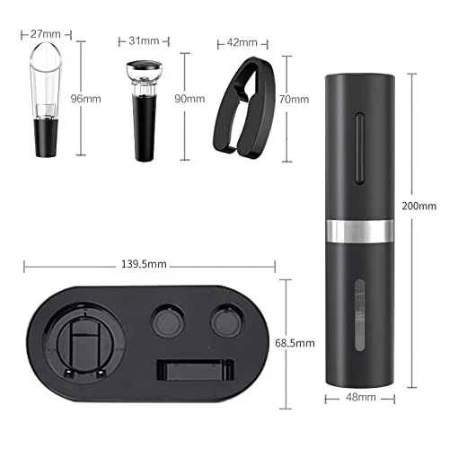✔️5 IN 1 WINE SET - Unveil a premium wine experience with our all-inclusive set. It boasts an electric wine opener, foil cutter, decanter, vacuum wine stopper, charging base, and a USB-C cable. This comprehensive set seamlessly integrates wine opening, pouring, and storing for a hassle-free wine tasting session. Ideal for family reunions or corporate banquets, it's your trusty companion on the wine table, elevating your wine-tasting joy ✔️EASE OF USE - Effortlessly remove the cork in a matter of seconds. Simply align the corkscrew vertically to the bottle neck, press the DOWN button to extract the cork, and hit the UP button to release it from the corkscrew. No more tugging, twisting, or broken corks ✔️ELEGANT DESIGN - Embodying classic elegance, our set flaunts a luxurious black hue and an exquisite charging base that ensures easy storage and keeps your electric opener fully charged. The integrated blue LED lights automatically illuminate, adding a touch of sophistication to your wine service ✔️PERFECT GIFT FOR WINE ENTHUSIASTS - Looking for the ideal gift? This set is it! Perfect for birthdays, anniversaries, Christmas, Hanukkah, Thanksgiving, Mother's Day, Father's Day, Valentine's Day, or any celebration ✔️100% SHOPPING GUARANTEE - It’s always important for us to make our customers 100% satisfied. If you have any questions during use, please feel free to contact
