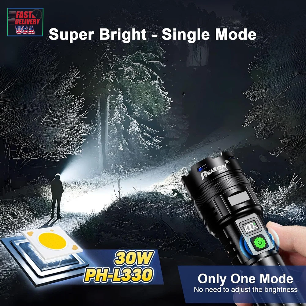 Store New Arrivals Add to Favorite View Feedback Contact Rechargeable Flashlights 1000000 High Lumens Single One Mode Super Bright, High Powered LED Flashlight USB C, High Beam 3280 Ft Long Lasting Powerful Heavy Duty Strong Flash Light for Security Hiking Description Item model number PH2403 Light Source Type LED Style Modern Power Source USB C Charging & Battery Powered Battery Cell Composition Lithium Ion Light Path Distance 3280 Feet Country of Origin China Warranty Type Limited Batteries Included? No Specification Met UL Battery Description Lithium-Ion Batteries Required? No Product Dimensions 1.77"D x 1.38"W x 6.45"H Material Aluminum Included Components 1x USB C to USB C Cable, 3x Alkaline Batteries, 1x PH2403 High Power Flashlight(Rechargeable battery included), 1x USB C Cable Item Package Quantity 1 White Brightness 1000000 Lumens Brightness 1000000 Lumen Water Resistance Level Water Resistant Item Weight 1.08 pounds Special Features Single One Mode -No need to adjust the brightness, Adjustable Focus - Wide to narrow beam, LCD Display - Showing the remaining power accurately, Long Range - Up to 3280 feet, High Power - Super high brightness 1000000 Lumens Special Feature function(f) {var _np=(window.P._namespace("DetailPageProductOverviewTemplatesJava"));if(_np.guardFatal){_np.guardFatal(f)(_np);}else{f(_np);}}(function(P) { P.when('A').execute(function(A){ A.on('a:truncate:po-attribute-truncate-0:updated', function(data) { var isTruncated = !data.truncateInstance.getIfTextFits(); var seeMoreElement = document.getElementById('po-attribute-see-more-id-0'); if(seeMoreElement) { seeMoreElement.style.display = isTruncated ? '' : 'none'; } }) }); })); Single One Mode -No need to adjust the brightness, Adjustable Focus - Wide to narrow beam, LCD Display - Showing the remaining power accurately, Long Range - Up to 3280 feet, High Power - Super high brightness 1000000 Lumens See more Bulb Base Flanged Color Black Part Number PH2403 Wattage 30 Watt Hours Recommended Uses For Product camping, hiking, night walking, night work, power failure, security [ ULTRA LONG RANGE - 3280 FT & ADJUSTABLE FOCUS ] The PHIXTON PH2403 rechargeable flashlights high lumens is made of improved PH-L330 30W LED which has the features of high concentration and ultra long range, you can adjust the focus from narrow to wide. It is a high concentration circle beam, it can be used as a spotlight to illuminate on objects up to 3280 feet away even if it is fog day or rainy day. It is quite ideal for camping, hiking, night walking or other emergency situations. [ SINGLE ONE MODE - HIGH BRIGHTNESS ] The PH2403 LED flashlight rechargeable USB C is single one mode, only one high mode, single click to turn on or turn off, NO NEED to take time to adjust the brightness any more. The brightness can be up to 1000000 Lumens, it can easily illuminate a whole room and backyard of 500 square meters. It is suitable for night work or power failure. [ MULTIFUNCTIONAL 2-IN-1 USB INPUT & OUT ] The super bright LED flashlight long range is built-in 2 USB interfaces, one is USB C input for charging, the other is USB output for emergencies. It supports various of USB devices such as smartphone, earphone, computer etc. It is convenient to get charged or discharged in indoor or outdoor activities. [LONG LASTING & IMPROVED LCD DIGITAL POWER DISPLAY] The PH2403 high powered flashlight long beam is equipped with 1pcs 6000mAh rechargeable battery, so it can provide up to 10 hours of powerful and non-diminishing brightness. Both the battery and flashlight are built-in a smart chip that has the overcharging protection to ensure safety. With compact handheld size, it looks quite cool and smart. The LCD power display shows remaining power exactly, you will get known when to charge it in advance. [PRACTICALLY INDESTRUCTIBLE & IPX7 WATERPROOF] The body of the high intensity flashlight long distance is made of super hard aviation-grade aluminum alloy, impact resistance, wear-resistant and drop-resistant. It is strong enough to withstand a 10 feet accident drop and even ran over by a truck, it still works! IPX7 waterproof flashlight long lasting has a built-in high tenacity seal rubber waterproof ring, so there is no any problem to be used in any bad weather, such as rain or snow day. [PACKING LIST & EXCELLENT CUSTOMER SERVICE] You will get 1x PH2403 flashlight, 1x 6000mAh rechargeable battery,1x USB C cable, 1x gift box. We are providing high quality products and the best customer service as our aims. You will be pleasantly surprised by the brightness, quality, longevity and performance of the most powerful flashlight. If you have any questions, please feel free to contact us. We will be happy to answer your questions. Product Description The video showcases the product in use. The video guides you through product setup. The video compares multiple products. The video shows the product being unpacked. Do I need to adjust the lighting mode NO need,the rechargeable flashlight high lumens is single mode, only one high mode, no need to adjust the lighting modes Is there any battery included Yes,the PHIXTON PH2403 LED flashlight rechargeable contains 1pcs 6000mAh rechargeable battery, it cay be cycled charging and discharging for more than 500 times, there is no need to replace another battery How long would the PHIXTON PH2403 super bright flashlight last? Once full charged,the PHIXTON high powered flashlight would last about 5-10 hours Is it a circle beam or a square beam The PH2403 powerful flashlight for camping is a high concentration circle beam, the illuminating range could be up to 3280ft What's the material of the heavy duty flashlight The PH2403 strong flashlight is made of super hard aviation-grade aluminum alloy, it is waterproof and shockproof, not like others which are plastic ABOUT US We offer the best prices around on high quality products. Our E-store includes media such as books, movies, music and games while offering electronics, toys, sp