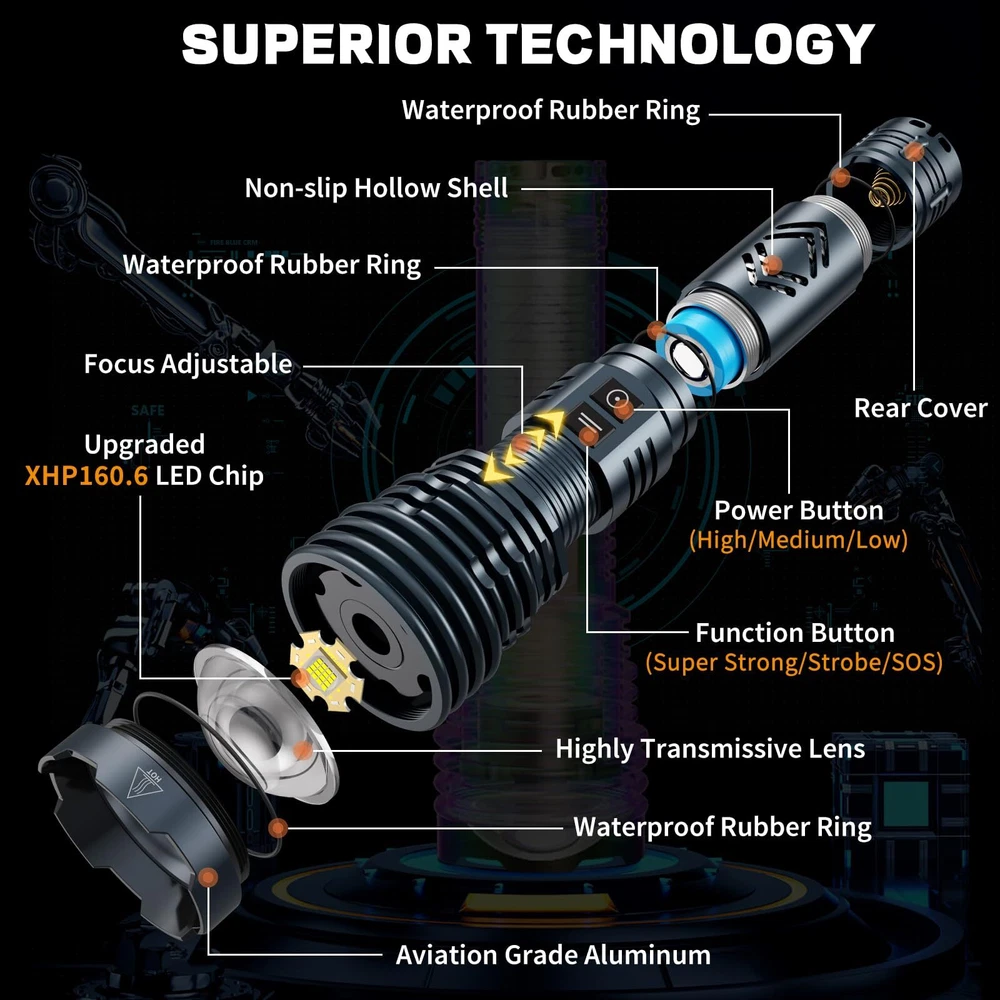 【BRIGHTEST FLASHLIGHT/Flashlights 1,500,000 LUMENS 】With 16 beads, the super bright Flashlights powered by XHP160.6 LED chip is not only brighter than Flashlight with fewer beads such as the XHP90, XHP70 and XHP50, but also brighter than Flashlights with 36 beads, whose light is dispersed across 36 squares. Our Rechargeable LED Flashlights High Lumens can support a maximum output of 1,500,000 lumens, which is about 30 times brighter than a regular LED Flashlights. 【WITH ZOOMABLE ADJUSTABLE & 6 LIGHTING MODES】Compared to the traditional Flashlights with only 5 modes (high/medium/low/sos/double flash), our powerful Flashlights with 1,500,000 lumens have a new super bright mode to meet the brightest lighting needs. In addition, we have set up a separate function key to the Super Bright Flashlight to make the sos and double flash functions more convenient to use. 【POWERFUL BATTERY & USB RECHARGEABLE Flashlight】Built-in fast charging chip, twice as fast as the charging speed of ordinary USB Flashlight rechargeable. This high-power Flashlight can work about 8-20 hours on a single charge. With circuit protection, such as overcharge protection, over-discharge protection, over-voltage protection, short-circuit protection, etc., which can extend the life of the Flashlight high lumens rechargeable up to 200000 times. 【IP67 WATERPROOF & SHOCKPROOF TACTICAL FLASHLIGHT】The Super Bright rechargeable Flashlight is specially made of aviation grade aluminum alloy all over. With the thick rubber ring can do IP67 level of waterproof, dust-proof, drop-proof. There is no problem to use the rechargeable Flashlights in extreme weather such as heavy rain and snowstorm. We also customize the tactical Flashlights with five parts of heat dissipation area, so the bright flashlight has good heat dissipation performance. 【WIDELY USED & OUTDOOR ESSENTIAL HANDHELD FLASHLIGHTS】This rechargeable Flashlight for emergencies can be used as an emergency energy source to charge some common USB devices, such as cell phones, headphones, etc. Powerful Flashlights high lumens are not only suitable for daily use such as camping, night dog walking, night running, night fishing, night riding, hiking, but also for police night patrol, car maintenance and other workplace such as gas stations, charging stations, chemical labs, airports, warehouses, etc. 【FLASHLIGHT PACKAGE】: What you get: 1 x LED Flashlights High Lumens, 1 x 5000mAh Battery, 1 x Charging Cable and 1x Manual and 1 x Gift box. We have carefully checked all flashlight rechargeable before shipment and ensured that the products are working properly. Most importantly, we provide 7*24 hours customer service. If you have any questions, please to contact us.