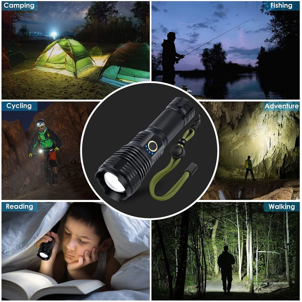 High brightness flashlight 【990,000 Lumens Flashlights】Rechargeable Flashlights is built in 2024 newest upgrade XHP70.2 LED lamp beads, which supports a maximum output of 990,000 lumens and a maximum irradiation distance of 1000m.The High Lumens Flashlights is about 10 times of the brightness of an ordinary P50 flashlight. When you go camping, hiking, hunting, or in emergency situations, you can use it to illuminate the entire area without worrying about getting lost in the darkness. 【USB Rechargeable & Power Display】This flashlight uses a Type-C charging interface, which is 30% faster than a regular USB. The charging time only takes 4 hours. Full charge can last up to 20 hours. There are four battery indicator lights, indicating 25%, 50%, 75%, and 100% of the battery. 【Long Running Time】Bright Flashlight can support our rechargeable led flashlight to work for 12 hours. Built in reverse connection protection, Over-voltage protection and short-circuit protection. Choose led flashlights high lumens to avoid inconvenience and pain caused by running out of power too quickly, ensuring reliable use when needed it. 【Heat Dissipation and Anti-slip】LED Flashlight is made of aviation-grade aluminum alloy. Our Flashlights is the heaviest under the same size and the smallest under the same weight. So that it provides a better heat dissipation effect to this rechargeable flashlight. The whole body with non-slip design is very suitable to be tactical flashlights, which could protect ourselves well in emergency situations. 【10 Light Modes 】rechargeable flashlights high lumens is with a convex lens and a telescopic head. Stretch to expand the irradiation distance and pull back to expand the irradiation range. One-button design is simple to between the 10 modes. Spotlight :High-Medium-Low-Flash-SOS. Floodlight :High-Medium-Low-Flash-SOS. Please note that the brightest flashlight is in high mode every time once turned on. You could turn off the high lumen flashlight after cycling through all the five modes or press and hold on the switch button for 5 seconds in any mode. 【Points for Attention】Package contents one super bright flashlight, one product manual, one tail rope. (The tail rope can be adjusted according to the size of your wrist for easy carrying.) Attention please, check the manual before use. Avoid unnecessary damage to the 990,000 lumens flashlight. 【After-sale Services】In terms of technical support and after-sales services, we always adhere to our consistent quality management policy, adhere to the principle of "service first", and ensure to provide customers with comprehensive and thoughtful technical support and after-sales service. Our company's service tenet is always to provide customers with professional, standardized, and diversified services.