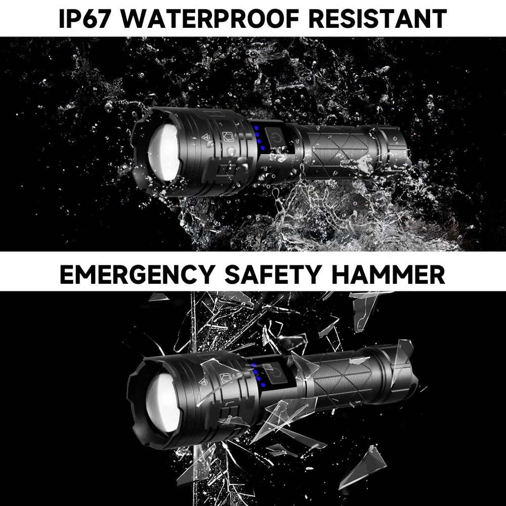 flashlights high lumens rechargeable flashlights led flashlight rechargeable tactical flashlights flash light flash lights brightest super bright flashlight high powered flashlight powerful flashlights handheld flashlights emergencies camping hiking Flashlights High Lumens: rechargeable flashlights are equipped with a super bright P70.2 LED chip, to produce up to 990,000 lumens brightness. With high powered flashlight, meeting your various illumination needs, lighting up to 1300ft² area or 1500ft distance, for emergencies, camping, hiking. LED Flashlight Rechargeable: Equipped with an upgraded large capacity battery, tactical flashlights high lumens can work for 12hours after fully charged. There are fast-charging Type-C port to ensure high efficiency charging for led flashlight. And four power indicators assist you to know the battery level of the rechargeable flashlight. Adjustable & 5Mode Flash Light: Super bright flashlight has adjustable focus function as floodlight for wider area when zoom in or spotlight for longer distance when zoom out by stretching the top of the tactical flashlight. Flashlights high lumens rechargeable have five lighting modes as high/medium/low/strobe/SOS for multifunctional use. Waterproof & Multi-Function: Flashlight rechargeable is made of aviation grade aluminum alloy and sealed design, achieving IP67 waterproof and shatter-resistant. With multi-functional design: (1) With USB output port, brightest flashlight can be used to charge electronic device. (2) With head cusp design, tactical flashlight can be used as safety hammer. (3) With dry battery function, flash light can be used for emergencies. Flashlight Package: Flashlights are packed with 1* led flashlight, 1* rechargeable battery, 1* type-c charging cable, 1* dry battery fix bracket, 1* carrying lanyard and 1* packing box. If you have any flash lights problems, such as not working, lack of accessories, broken package, please message us via amazon, has one-year replacement policy for your use without worry.