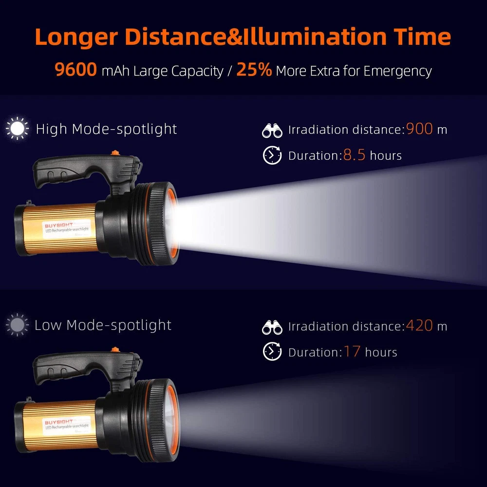 is professional to do high-quality LED lights. Choosing is to buy the sight. Specification: Brand : Name : Rechargeable flashlight Item No : AL-953 Materials : ABS Brightness : 2 dimming mode Bulb type: High-lumen LED Emitting Color: White Input Voltage : 110V/220V Product Weight : 0.618g (21.8oz) Battery Type : lithium battery Charging Time : about 8 hours Lighting time: 16 hours Color : Golden Power Source:9000mA battery Features: -Super bright LED Portable light(9000mA battery inside). -USB Port design, it can charge your mobile phone,camera, digital product etc. -High quality LED can be used for more than 100,000 hours, which eliminates the trouble of replacing the lamp. -Suitable for home maintenance and outdoor activities,like camping, fishing,hiking, night fishing, sailing, caving and hunting etc. Package Including: 1 x Portable light 1 x 110V-240V Charger 1 x shoulder straps Tips: -Please make it fully charged before the first use for the possible charge-depleting in transit. -Do not immerse it in the water for prevention of short circuit. Large Capacity Rechargeable batteries&Emergency Portable power supply: Battery capacity up to 9000mAh can give you a long outdoor working time . Smart multiple protection (overcharge/ over discharge protection) can keep it safe and steady when you use it as a mobile power to charge your smart devices. A Rechargeable Spotlight with Serious Lasting Power - Over 20 Hours(High Brightness).NO need to endlessly pay for batteries. This Updated spotlight is made with a long-lasting, rechargeable battery with large capacity (9600 mAh),lasting 50% longer than any other last generation spotlights. Impact Resistant & Waterproof: Made from tough, impact resistant ABS and Rubber waterproof plug to protect the system from scratch,drops,bumps and splash. Should you meet rains while hiking, camping, sailing or hunting, no worries - it's IPX 6 waterproof! Easy to hold & Handiness Design : Comfortable handle together with adjustable length shoulder strap, makes it pretty handy.The weight low to 0.618g gives you a long handiness experience without tiredness. No-Worries Guarantee:There is an ongoing soldering issue that prevents a small percentage of spotlights from working properly. We have managed to reduce the rate of these faulty units considerably, but not yet completely. We feel very bad about it and are actively working on solutions. If you receive a defective product, contact us and we will immediately send you a replacement unit for free. No Return Required.Contact us!