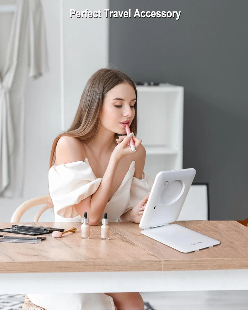 A 3-inch 10X Magnifying Mirror for Close-up: This lighted mirror is a regular mirror, coming with a 10x magnifying mini round mirror that clicks magnetically to the center, helping you with close-up tasks like tweezing eyebrows or applying liquid eyeliner or mascara coat. However, the round 10X zoom mirror blocks a big portion of the lighted mirror, so using it separately instead of always tacking it onto the glass is highly recommended. It can be hidden on the mirror back while not used. Super Bright Desk Mirror: Even illumination with 70 LEDs, the lighted vanity mirror softly illuminates every part of your face equally. With 3 color lights to pick from, a warm white light is best for applying makeup for a night out; a bright daylight setting for makeup for outdoor activities; and a cool light for a day spent in an office or classroom. This lighted beauty mirror will allow you to toggle between light temperatures to suit a variety of looks and situations. Book-Size Mirror Perfect Lightweight Travel Lighted Mirror: The mirror itself is only 0.7 pounds, 5.3 inches by 7.6 inches in width and height, and less than an inch thick, making it easy to packed in a bag or store in a luggage. Sufficient for makeup application and touch-ups for commute and 2-3 day business trip. The lighted makeup mirror is bright enough for daily use on vanity while it only takes up a small space. Rechargeable Lighted Compact Mirror: The mini LED mirror is rechargeable with 1000 mAh battery, you can use it cordlessly. If you need something for on-the-go use, this lighted travel mirror is highly recommended. You don't have to struggle with lighting but honestly it did help makeup application much more then a hotel mirror. USB-C cable is included, charger is not. The lid of the lighted makeup mirror works as a stand while used as a light-up tabletop mirror, and doesn't wobble when placed on a flat surface. You can use it as a compact travel makeup mirror with lights as well.