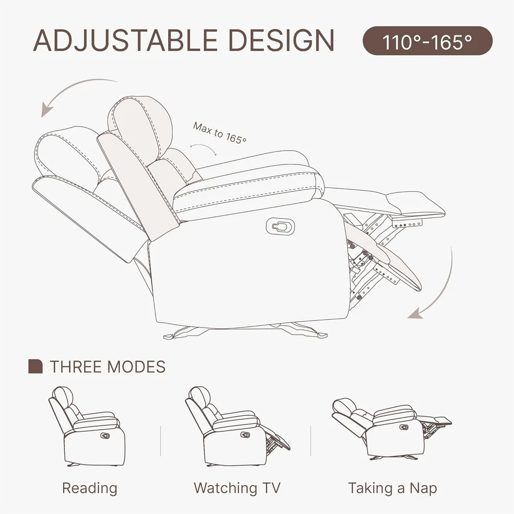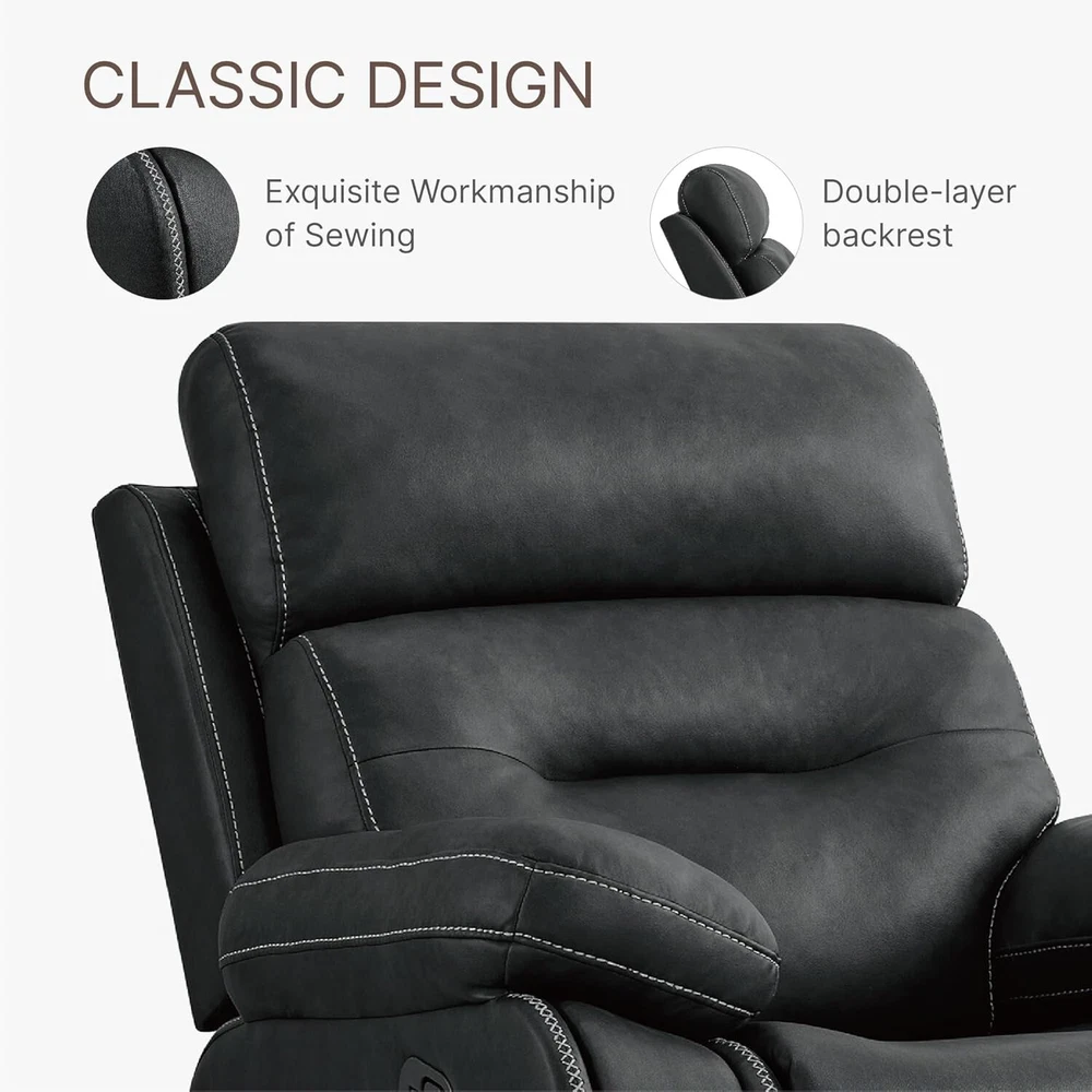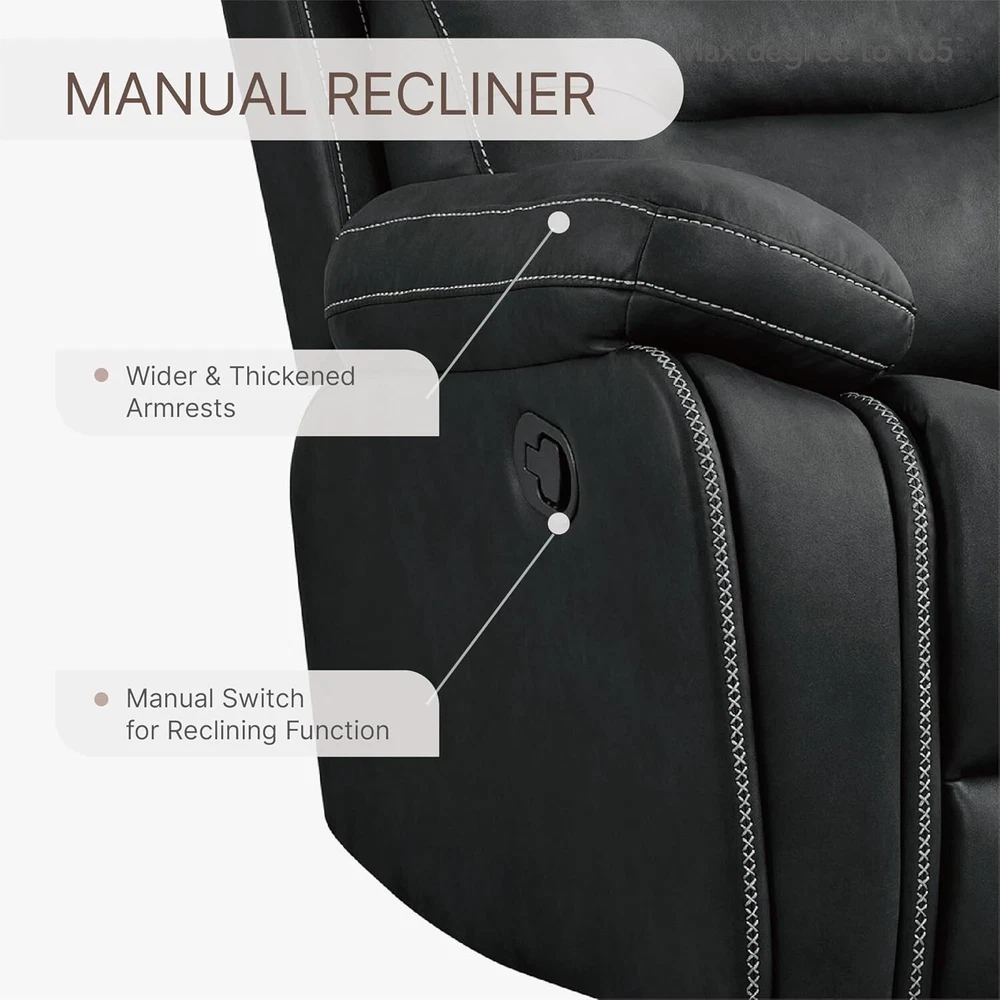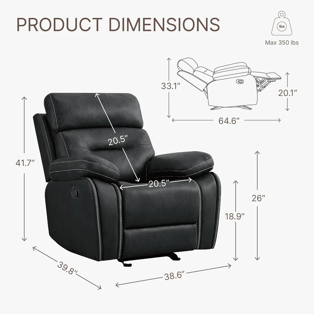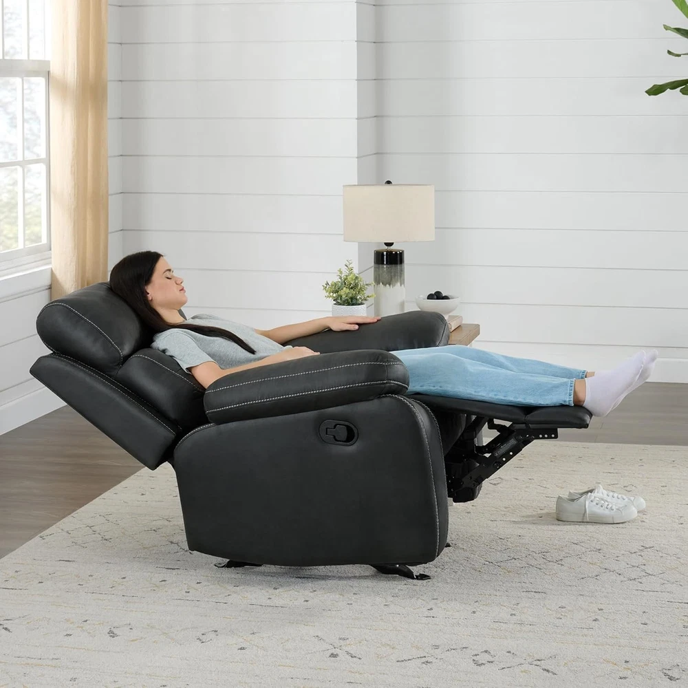 KISLOT recliner is designed with a thick cushion and soft faux leather.The high quality metal reclining mechanism and EPA certified actuator offer comfort and stability. The manual recliner offers flexibility and versatility for maximum comfort. Our large rcliner is ergonomically designed to fit seamlessly with the body for unrivaled comfort and support for your neck, back, lumbar and feet, helping to relieve pressure and promote correct sitting habits. The glider rocker recliner is designed with your comfort in mind.The bottom is equipped with a metal base, makes the rocking experience smoother and more stable.The smooth gliding and function can provide better relaxation for your family. This 2-in-1 recliner design can make the limited living room or bedroom can also have multifunctional furniture!This glider recliner sofa is perfect for reading, watching TV, or simply relaxing. Experience the convenience and versatility it brings to your life. Setting up the chair is easy and requires NO TOOLS! Just push back against the backrest for a comfortable recline.For any questions or concerns, our professional customer support team is readily available to assist you. Brand KISLOT Color Black Product Dimensions 39.8"D x 38.6"W x 41.7"H Back Style Upholstere Back Special Feature Upholstered Leather, Reclining, Ergonomic, Arm Rest, Head Support