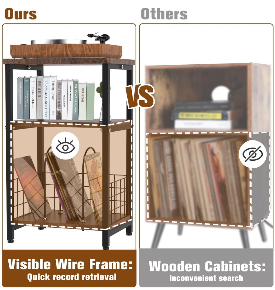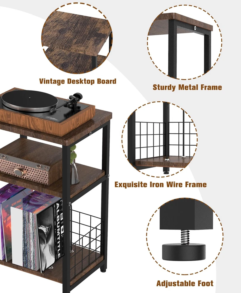 3-tier record player stand features vinyl record storage, which can be used to store your turntable, speakers, albums, CDs, books, magazines, collectibles, etc. The large storage space can fulfill all your diverse needs. It's an excellent gift for those who love vinyl records! On the wooden phonograph stand, it allows you to separate the items on each tier, making it more convenient to access them. The modern and minimalistic style matches home decor, making it an ideal choice for a turntable stand, vinyl record storage cabinet, bedside table, or coffee table in living rooms, bedrooms, and offices. Specification: Material: Durable Metal + Wood Product Size: 11.8’’ D x 15.8’’ W x 26.2’’ H Product Weight: 14.8 lbs Max Load Capacity:75 lbs CD Storage Quantity: Hold up to 100 albums Package Contents: 1 x Record Player Table 1 x Screw Package 1 x User's Manual Warm Tips: Children are not allowed to climb on or play with the product! Don't sit on the table! If you find the table a little wobbly after assembly, please adjust the foot pads to improve stability. Multi-Functionality: This record player table boasts an expansive range of applications due to its multifunctional design. Measuring 11.8’’ D x 15.8’’ W x 26.2’’ H, it serves as an efficient record storage table that seamlessly organizes all your vinyl records, albums, and CDs. Not only can it function as a vinyl record display table or a record player cabinet, but it also doubles as a turntable stand, nightstand, or end table - perfect for any living room or bedroom setting. 3 Layer Record Player Stand: Besides being a stand for your turntable, the table helps keep your precious vinyl records well-organized. The second and third tier can easily store up to 100 albums in total. The designated compartments or shelves allow for convenient categorization based on genres, artists, or release years. This feature ensures easy access to your records and enables you to maintain an orderly collection. High-Quality Material: The table is crafted from high-quality wooden and metal to ensure durability and longevity. The robust construction can withstand max load weight 75 lbs of turntables and substantial record collections. This end table comes with 4 adjustable foot pads which can be easily adjusted to fit the height of your needed. Additionally, the foot pads can protect your floors from scratches and scuffs. Irrespective of the frequency of use, it promises to stay stable and stylish. Aesthetic Appearance & Practical: This record player table is a visual masterpiece that blends into any interior setting. With its vintage design and modern accents, it enhances the aesthetic appeal of your room, while complementing modern décor trends seamlessly. The second layer has an open design, which is convenient for access. It can store snacks, books, or other items within reach. The third layer Iron wire frame and U-shaped wire can protect your vinyl records from falling or slipping. Easy Assembly: The record player table prioritizes the user's convenience with easy assembly instructions. All necessary tools are included, allowing even those with minimal DIY skills to set it up effortlessly. By opting for this table, music lovers who prefer a quick and hassle-free setup can start enjoying their favorite tunes without a long, complicated assembly process.