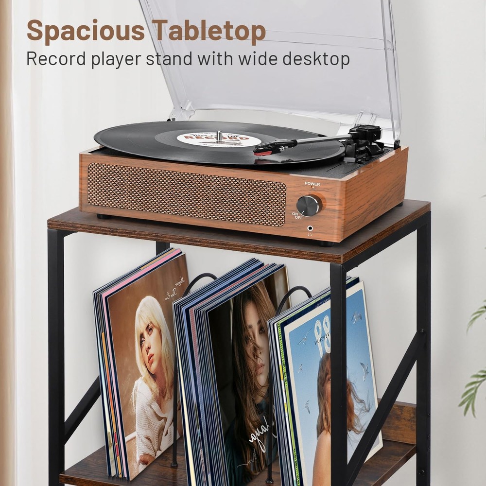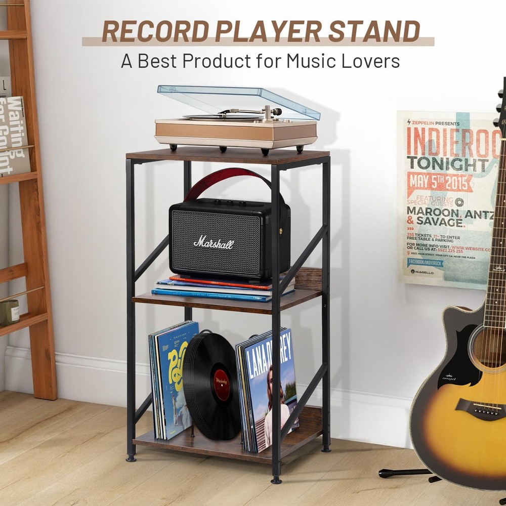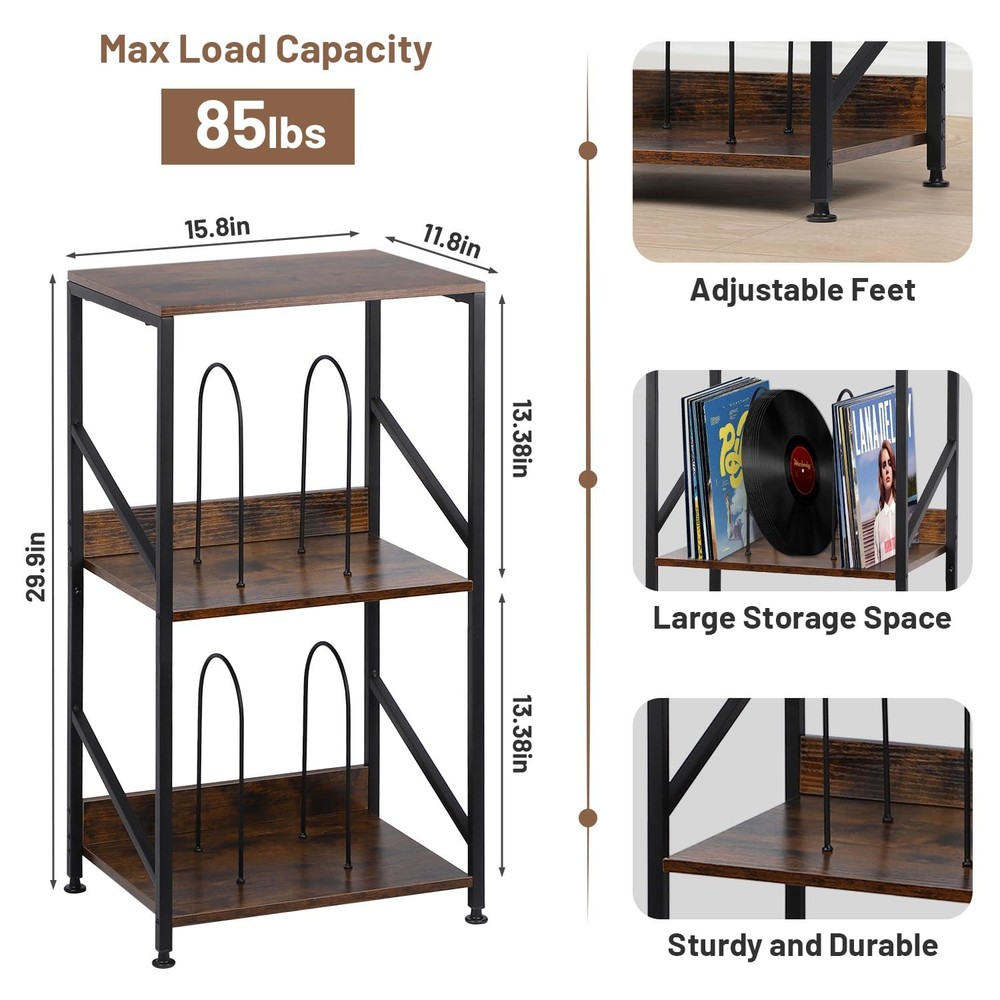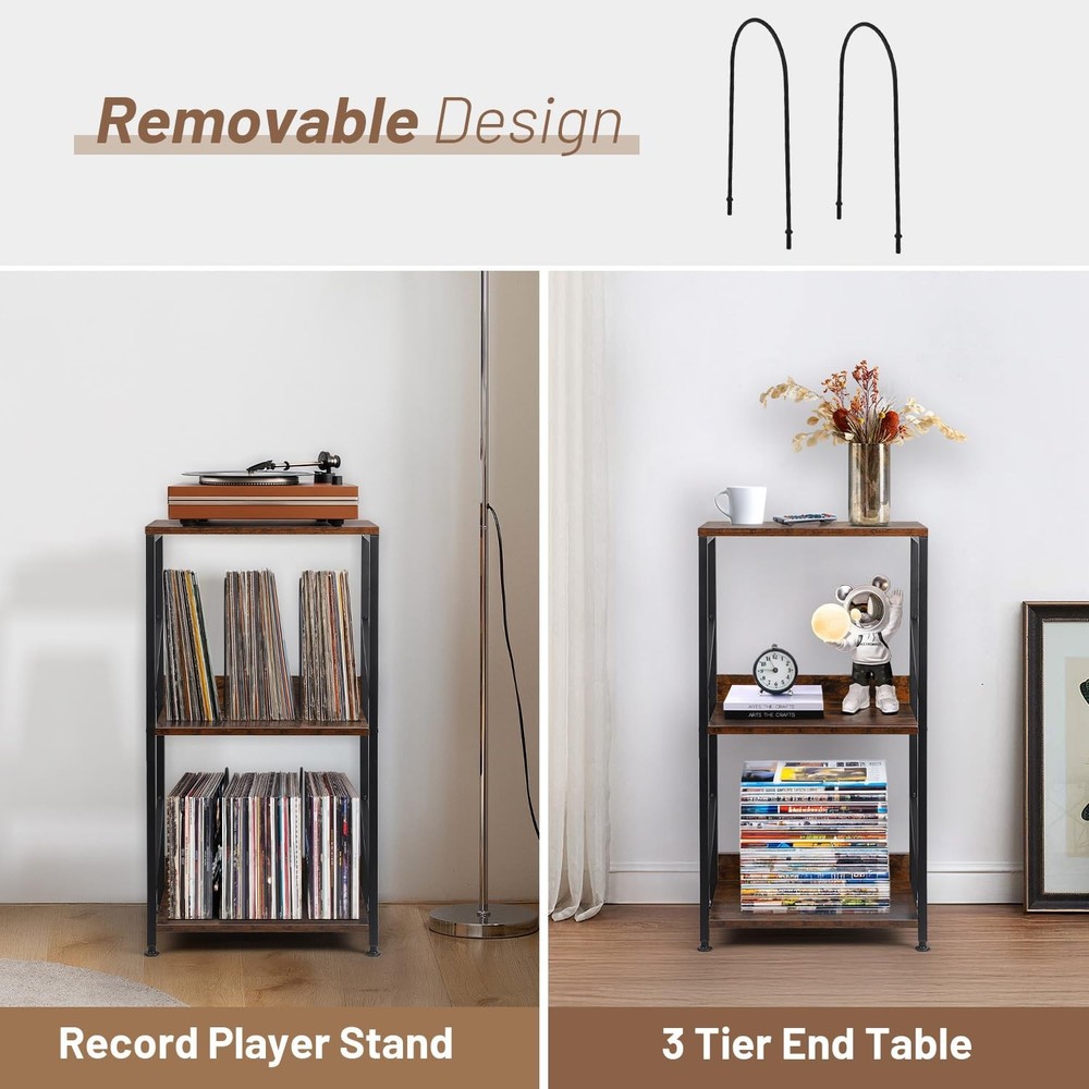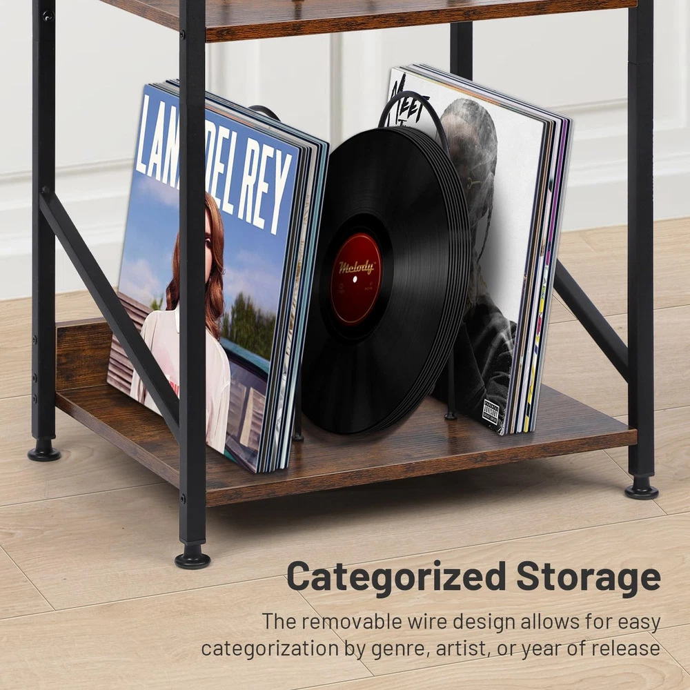 This record player table has sturdy and durable solid wood, anti-corrosion and rust-resistant metal frame .The vinyl record stand is not only suitable for placing your record player, but can also be used to display other audio equipment or decorations. 【3 Tier Record Player Stand】This both practical and beautiful record shelf has 3 tiers, the top tier has a spacious tabletop for multiple sizes of record players, the 2nd and 3rd with removable u-brackets can be organized and placed in an orderly fashion according to genre, artist or year of release. Vinyl record player stand large capacity for storage up to 200 albums of different sizes 【MULTIFUNCTIONALITY】The vinyl record stand is not only suitable for placing your record player, but can also be used to display other audio equipment or decorations. Turntable stand for bedroom, study, music room or other places where you need reading materials. Vinyl record storage can be used as a stylish small space side table, shelf or bedside table with suitable height for you to enjoy your afternoon tea and so on. Album holders for vinyl records offer you to provide a variety of choices 【Sturdy and Durable】This record player table has sturdy and durable solid wood, anti-corrosion and rust-resistant metal frame for long life. The premium materials provide you with reliable and long-lasting products to enhance your shopping experience. Record player accessories adjustable feet can adjust the height as needed, uneven ground can also be well adapted to maintain balance and protect the ground from being scratched 【Detailed Design】Table for record player the 2nd and 3rd have wooden boards and iron shelf dividers on the side, no need to worry about falling items. Removable u-shelf gives you a variety of options, even if you don't put records, you can also use it as a shelf for headphones, keys, wallet, remote control, books and magazines, to meet the demand for multifunctional use. Height-optimized, the table for record player provides an ergonomic listening experience, allowing you to enjoy your music comfortably 【Easy to Install】The record holder comes with concise instructions to make assembly quick and hassle-free, so you can start enjoying your records without waiting
