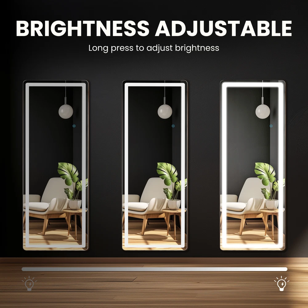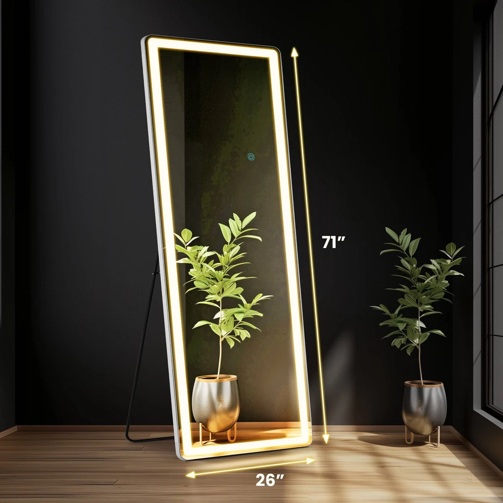 1. The arched full body LED lighted mirror features a sleek and modern design, adding a touch of elegance to any room decor. 2. Measuring 26"x71", the large mirror provides a full-body reflection, making it ideal for checking your outfit or makeup before heading out. 3. The mirror offers dimming and 3 color lighting options, allowing you to adjust the brightness and choose the lighting that best suits your needs. 4. The mirror can be used as a floor standing, leaning, or wall-mounted mirror, providing versatility in how you choose to display and use it in your space. 5. The LED lighting provides bright and even illumination, making it easy to see yourself clearly in the mirror for grooming, styling, or outfit selection.