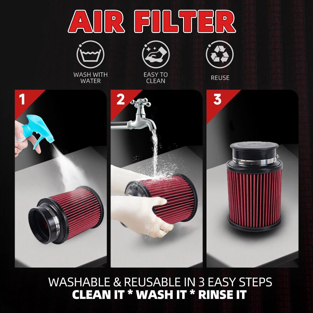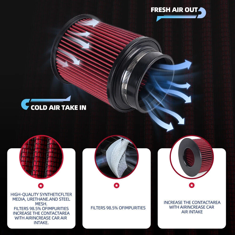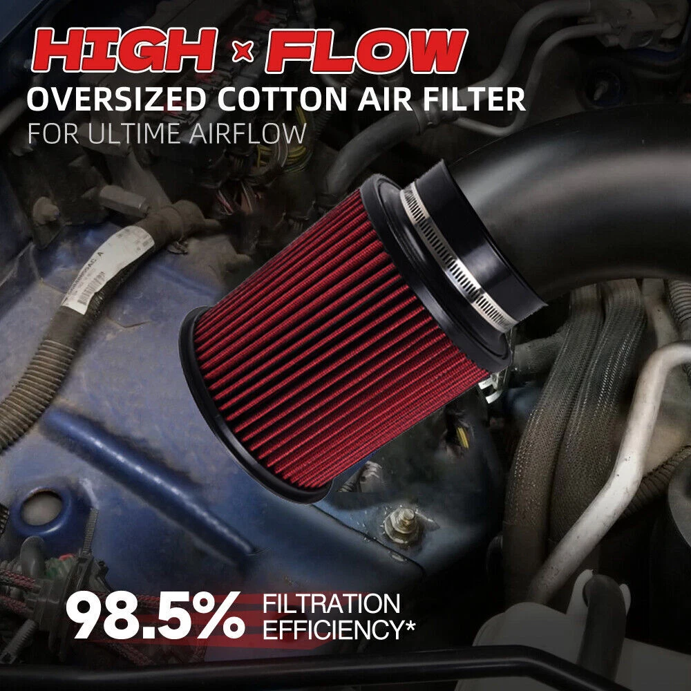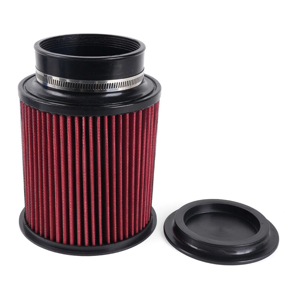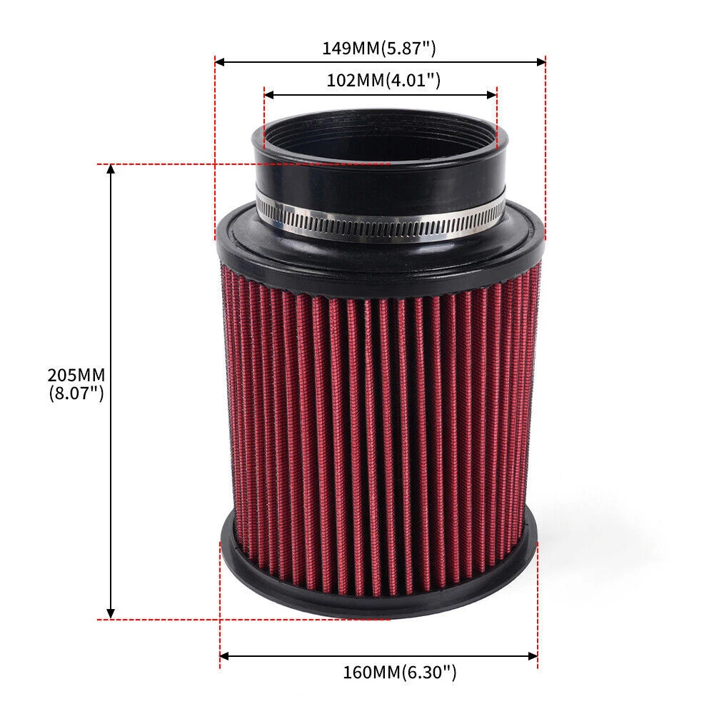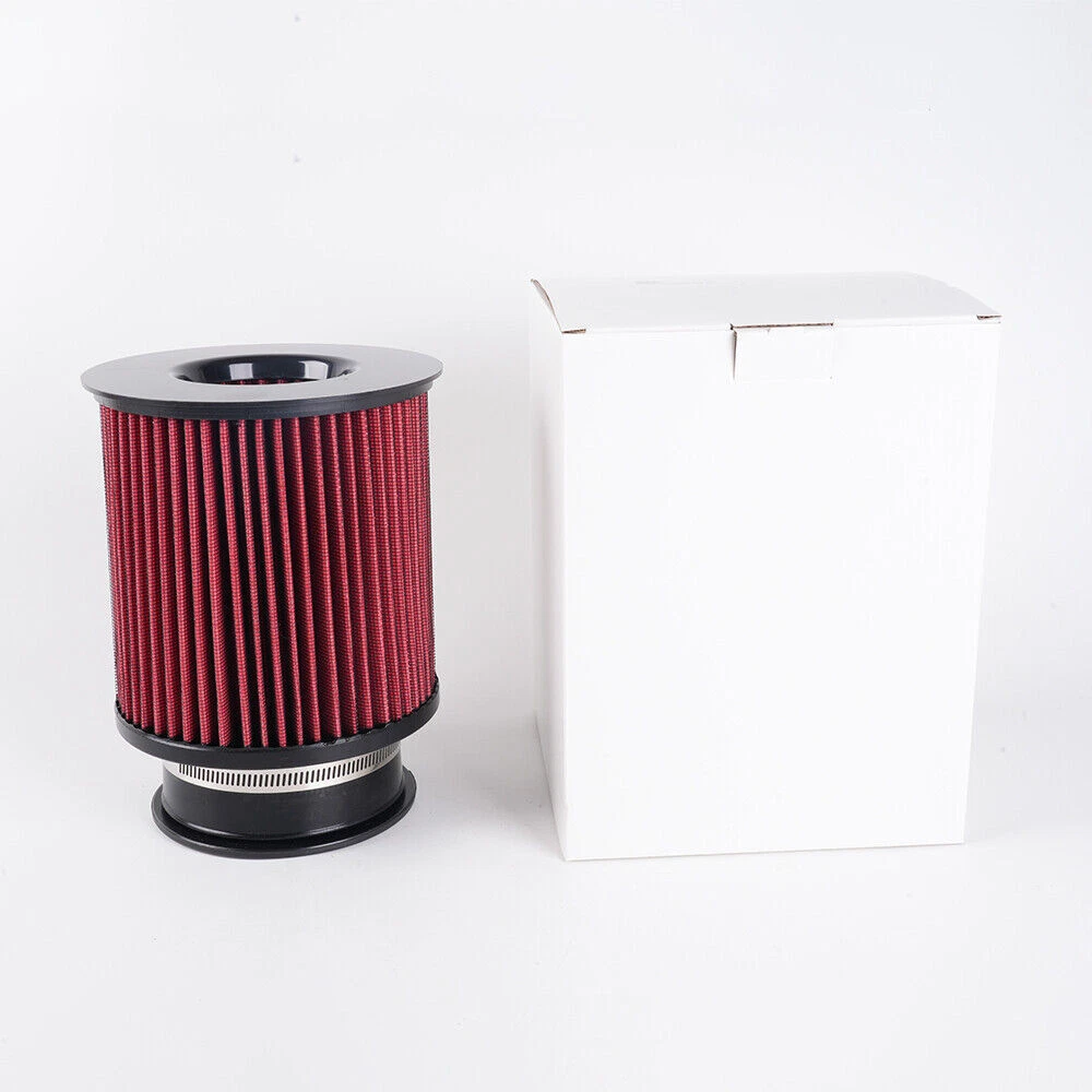 Red 4" 102mm High Flow Inlet Round Dry Air Filter Cold Air Intake Replacement SPECIFICATIONS: Type: Air Filter Material: Plastic + Metal + Filter Paper Inlet Diameter: 4" / 102mm FEATURES: 100% Brand New and Never Used or Installed Increase horsepower, torque and improve the gas mileage. The high flow air filter help engine to draw more cooler air resulting in better throttle response & higher explosive horsepower output. It comes with a washable and reusable cone air filter and a clamp. Filter consisted of 2 layers to double the filtration efficiency. [How often should air intake filter be replaced?] It should be inspected once a year or every 15,000 to 30,000 miles, but this can varybased on the car and driving environment. If you often drive through dusty terrain oron unpaved roads, you may need to change it more frequently. PACKAGE INCLUDE: 1 x Air Filter Kit All accessories in the picture are included. NOTE: 1. Please allow 0.5-1 inch difference due to manual measurement. (1 inch=2.54cm) 2. Please check the size measurement and the picture carefully before makingpayment. 3. Due to the difference between different monitors, the picture may not reflect theactual color of the item. Please understand, Thank you. SHIPPING INFORMATION PAYMENT WARRANTY ABOUT US CONTACT US SHIPPING INFORMATION We will only ship this item to buyers by Normal Mail, please confirm your address is correct, and if you want to change the delivery address, just feel free to contact us when you purchase. Usually, we will ship the orders out and upload the tracking number within 1-2 business days(Monday to Saturday from 8:30am-5:30pm) after you complete the payment. PAYMENT We will only accept eBay payment. Please pay using eBay payment ONLY within 7 days from the date of transaction be made. WARRANTY Please inspect your order upon receipt.No damage claims will be honored after 14 days of delivery. All item we sold come with 90 days defective warranty from the date. ABOUT US We are a powerful factory producing auto parts,and we have a professional sales and after-sales team that can provide you with excellent products and services. CONTACT US For any reason you want to contact us,We aim at satisfying every visitor, no matter what kind of situation you meet with, we will be right here to serve you. Please contact our team. If you are happy with the transaction with us, leaving us an ALL-5-STAR positive feedback would be greatly appreciated. Have a good shopping.