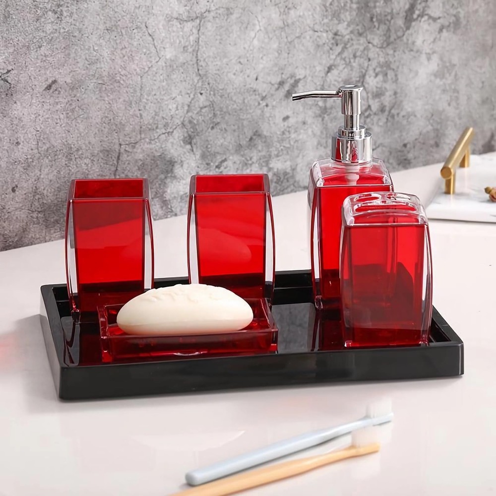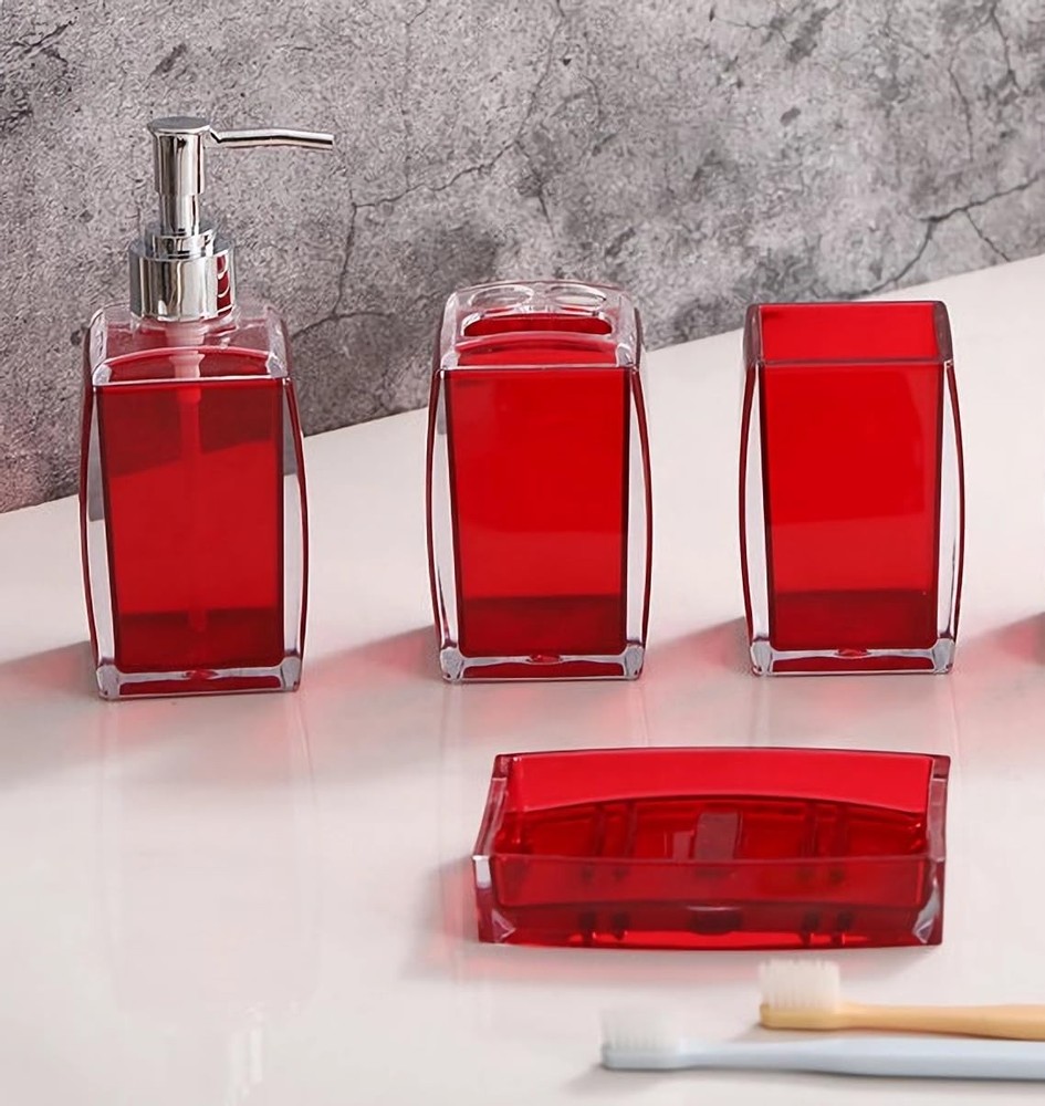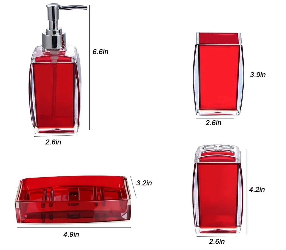 Luxury Premium Craftsmanship Our bathroom accessory set is made of a top-grade acrylic material, which is stronger and more durable than glass and ceramic, that inhibits water damage, leaks. A breeze to polish, just wipe its surface using a clean damp cloth. We masterfully created each of our products with user satisfaction and durability in mind, so you can purchase in confidence. 【High-Quality Acrylic Material】: bathroom accessory set uses high-quality acrylic to provide glass-like clarity and greater durability. Stylish, functional , durable ,easy to clean. which has a very high transmittance.It eliminates any sense of cheap plastic 【Elegant Design】:Unique, visually-appealing design complements any bathroom decor. The toothbrush holder and soap dispenser set for modern, farmhouse and boho styles, also suitable for bathroom, kitchen, bedroom decor, etc 【Easy to Clean】: bathroom accessories set has a smooth surface and is easy to clean.Simply wipe away any stains or smudges for a pristine and hygienic appearance every time. 【Fully function Completed Set】:Bathroom Accessory Set Complete Include toothbrush holder, toothbrush cup, lotion dispenser, soap dish, which equips everything you will need to organize your toiletries. 【Perfect gfit set 】: bathroom soap dispenser set is the perfect gift for your friend, family, business partner or anyone who wants to equip their bathroom with a set of practical accessories. suitable for modern, country, farmhouse and many other styles, also suitable for bedroom, bathroom, Spa,kitchen,home decorations and so on.