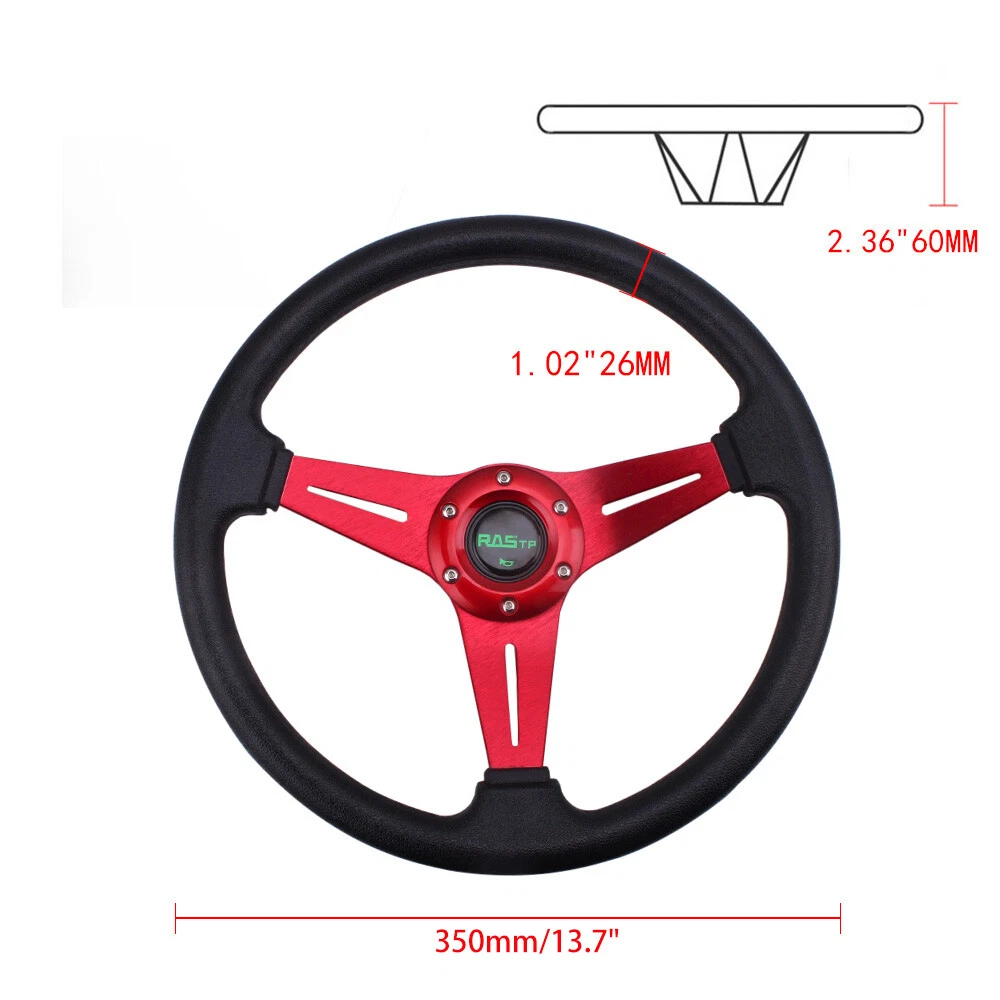 Red 350mm Racing Steering Wheel Drifting Deep Dish +Ball Quick Release Adapter Specifications: 【Steering Wheel】 Diameter: 13.5 Inches / 345mm 3.7inches / 95mm Deep Dished Light Weight & Durable Alloy Spoke Standard 6 Bolt Fitment 【Quick Release Adapter】 Billet Aluminum Body, Good Bearing Capacity, Durable in Using. With 6 Long Screws and 6 Short Screws for Various Snap off Needs, Ball-lock Type Mechanism for Best Locking Fit and Usability. Easy to Operate, Direct Bolt-on, Fast Detach Allows Steering Wheel to Be Removed Quickly. Compatible with 6-Hole Steering Wheel Hub Kit, Designed for Many Aftermarket Racing Steering Wheel. Package Include Only a Steering Wheel and a Quick Release Adapter, Must Be Installed with Hub Adapter (Not Include, Need Purchase Separately). Package Included: 1 X Steering Wheel Kit 1 X Quick Release Adapter Kit All Items Are Brand New Unless Stated Otherwise on the Listing. We Sell Diy (Do It Yourself) Items with a Few Exceptions. We Take No Responsibility in Teaching You How to Install. Professional Installation Is Strongly Recommended. SHIPPING INFORMATION PAYMENT WARRANTY ABOUT US CONTACT US SHIPPING INFORMATION We will only ship this item to buyers by Normal Mail, please confirm your address is correct, and if you want to change the delivery address, just feel free to contact us when you purchase. Usually, we will ship the orders out and upload the tracking number within 1-2 business days(Monday to Saturday from 8:30am-5:30pm) after you complete the payment. PAYMENT We will only accept eBay payment. Please pay using eBay payment ONLY within 7 days from the date of transaction be made. WARRANTY Please inspect your order upon receipt.No damage claims will be honored after 14 days of delivery. All item we sold come with 90 days defective warranty from the date. ABOUT US We are a powerful factory producing auto parts,and we have a professional sales and after-sales team that can provide you with excellent products and services. CONTACT US For any reason you want to contact us,We aim at satisfying every visitor, no matter what kind of situation you meet with, we will be right here to serve you. Please contact our team. If you are happy with the transaction with us, leaving us an ALL-5-STAR positive feedback would be greatly appreciated. Have a good shopping.