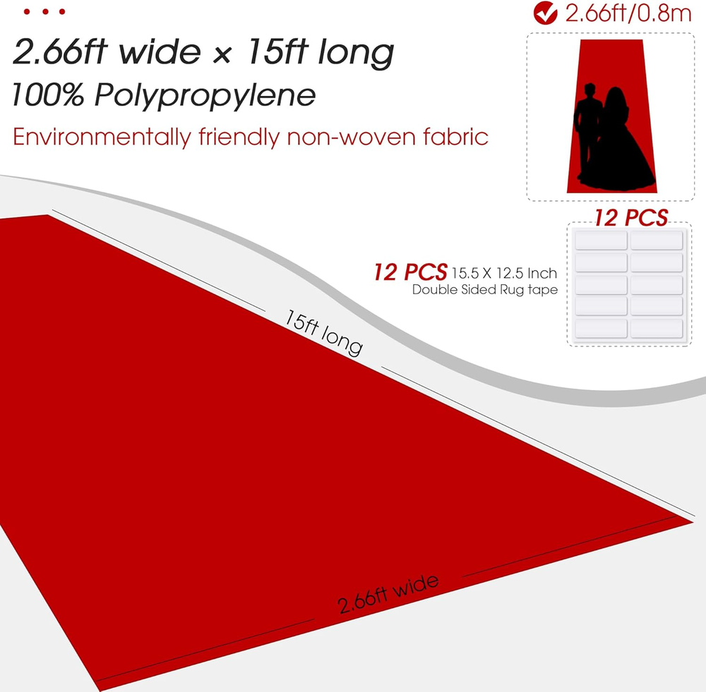 Store New Arrivals Add to Favorite View Feedback Contact Fast deliveries to the customer's home Quality customer service John Make the customers happy! Red Carpet Runner for Party,140Gsm 2.6Ftx15Ft Carpet Party Decorations Runway Rug for Prom Felt Non-Woven Fabric, Runner Rug for Wedding Ceremony Hollywood Theme Party Description 【Eco-Friendly Material】: Made from 140GSM polyester, soft, durable, tear-resistant, and comfortable for safe use. 【Ideal Size】: Measures 2.6 ft wide x 15 ft long, allowing two adults to walk side by side, perfectly accentuating event spaces. 【High Value】: Bright, 140gsm felt with a needled non-woven process for balanced thickness and vibrant color. 【Customizable】: Easy to cut without fraying; can be stacked for double thickness or joined with Velcro/tape for extended length. 【Versatile Use】: Suitable for indoor/outdoor events like proms, weddings, parties, and graduations; recommended for one-time use. 140gsm weight is industry-leading The texture is absolutely leading 2.6FT width is enough for 2 adults to walk side by side There are two lengths to choose from One is 15FT and the other is 30FT Please feel free to purchase. Item model number Red Carpet--A0035 Style Modern Weave Type Carpet Pattern Solid Is Stain Resistant No Theme Christmas Number of Pieces 1 Room Type Hallway Material Carpet Model Name Red Carpet--001 Rug Form Type Runner Indoor/Outdoor Usage Both Item Weight 0.58 Kilograms Pile Height Medium Pile Construction Type Carpet Material Feature Heavy-duty and superior texture Special Feature Industry-Leading Weight & Texture Color Bright Red Shape Rectangular Back Material Type Carpet Recommended Uses For Product Proms, Weddings, Parties, Graduations, Indoor/Outdoor Events Product Dimensions 180"L x 32"W Size 2'8" x 15' (Rectangular) ABOUT US We offer the best prices around on high quality products. Our E-store includes media such as books, movies, music and games while offering electronics, toys, sporting apparel, clothing, tools, general home, garden items and more. SHIPPING We are always working hard to ensure your package arrives as soon as possible. Please understand that some factors like weather, high postal traffic, and the performance of shipping companies are outside of our control. We offer free shipping to the lower 48 states and ship within 2 business days of payment, usually sooner. We do not accept P.O. Boxes. Please provide a physical address. For shipping outside of the continental USA, we only use eBay's Global Shipping Program. The item is shipped to KY and then sent to the rest of the world. International customers are responsible for all duties and taxes. Continue to 'check out' to calculate costs for shipping the item to your country. Messages regarding eBay's Global Shipping Program MUST be directed at eBay EXCLUSIVELY. RETURNS We offer a 30-Day Return Policy on items in which you are not completely satisfied with. You have the option of a full-refund or an exchange of the item. No returns are available on items shipped outside of the USA PAYMENT We accept PayPal. CONTACT US This page content is yet to come Please ad us to your favorite seller and visit again later Thank You CUSTOMER SATISFACTION We try our very best to make sure every customer is completely satisfied. If there's a problem, message us! We're happy to help. WE ACCEPT