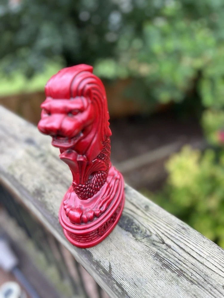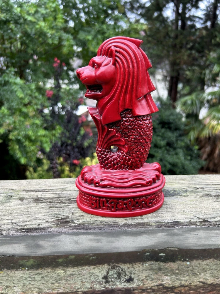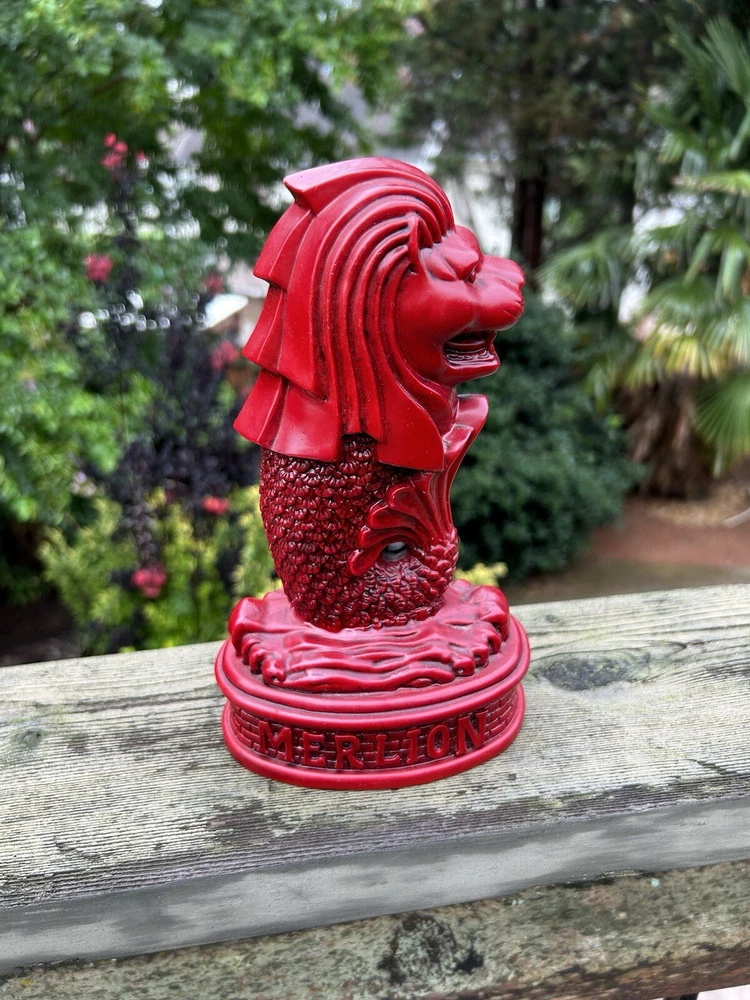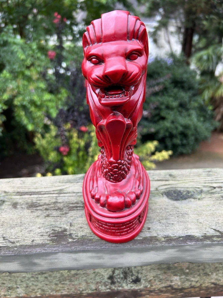This exquisite statue sculpture figurine is a stunning piece of art that captures the essence of Singapore's unique culture and heritage. Crafted with intricate details, a vibrant sea lion design, this Red Carved Singapore Merlion Sea Lion Statue is a must-have for collectors and enthusiasts alike. Originating from Southeast Asia, Singapore. This is 10” tall. It has a small chip in the back.