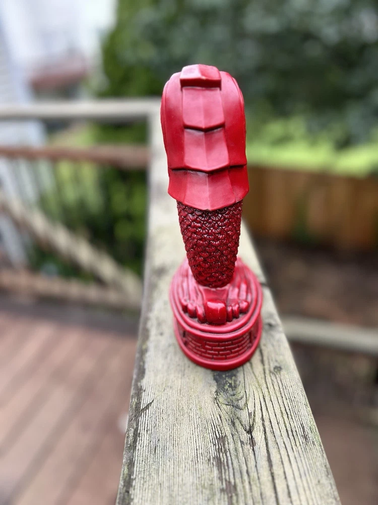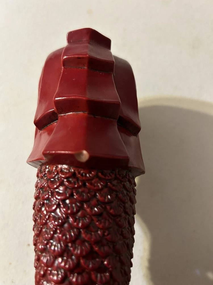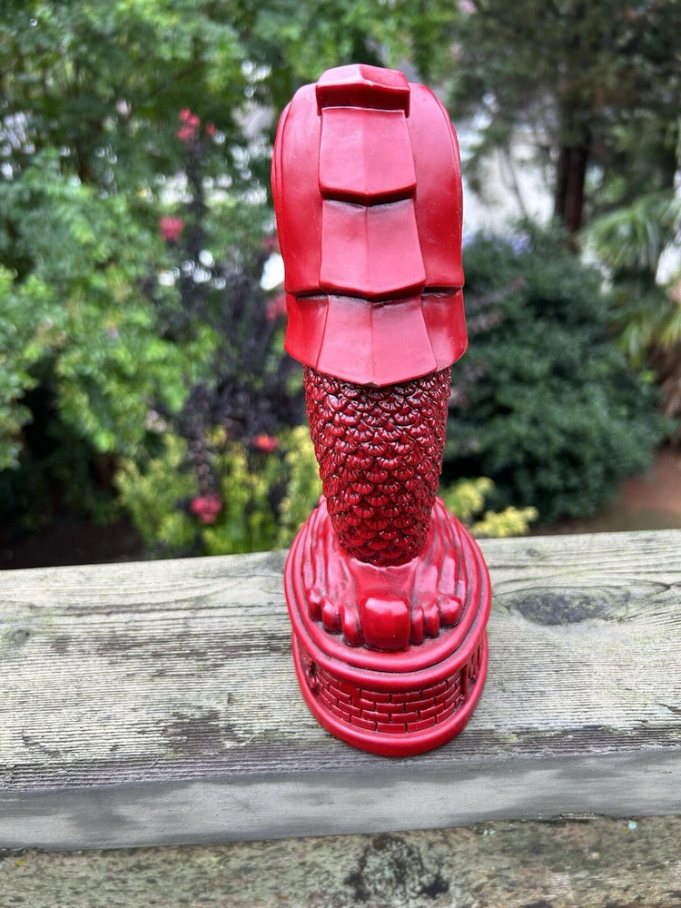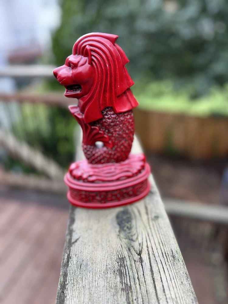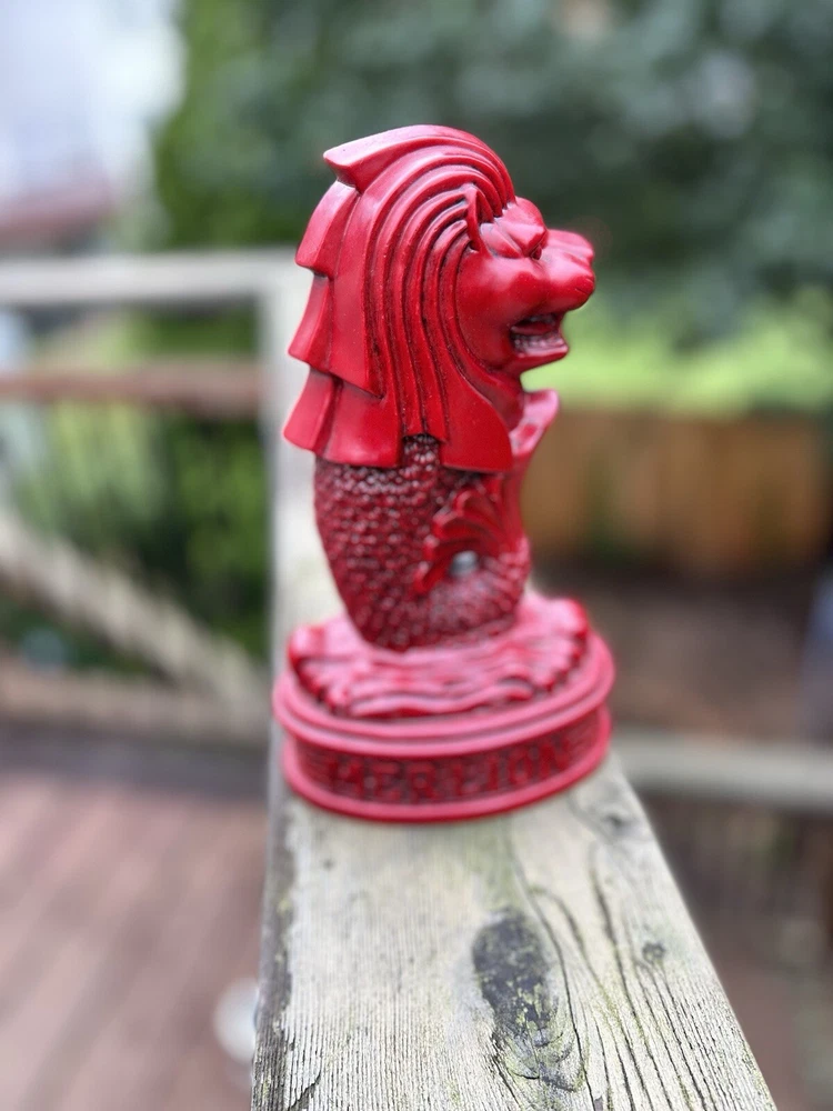 This exquisite statue sculpture figurine is a stunning piece of art that captures the essence of Singapore's unique culture and heritage. Crafted with intricate details, a vibrant sea lion design, this Red Carved Singapore Merlion Sea Lion Statue is a must-have for collectors and enthusiasts alike. Originating from Southeast Asia, Singapore. This is 10” tall. It has a small chip in the back.