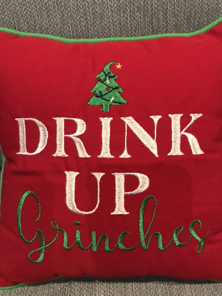 Drink Up Grinches Red Christmas Holiday Throw Pillow 9 Inches. Red pillow with green piping. Words and Christmas Tree are embroidered. Brand New no tags. Great quality. See photos as they are a part of my description USPS First Class Mail