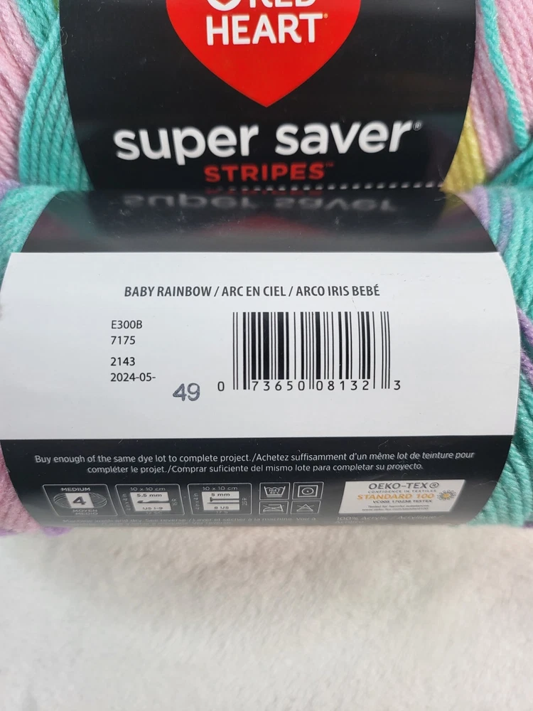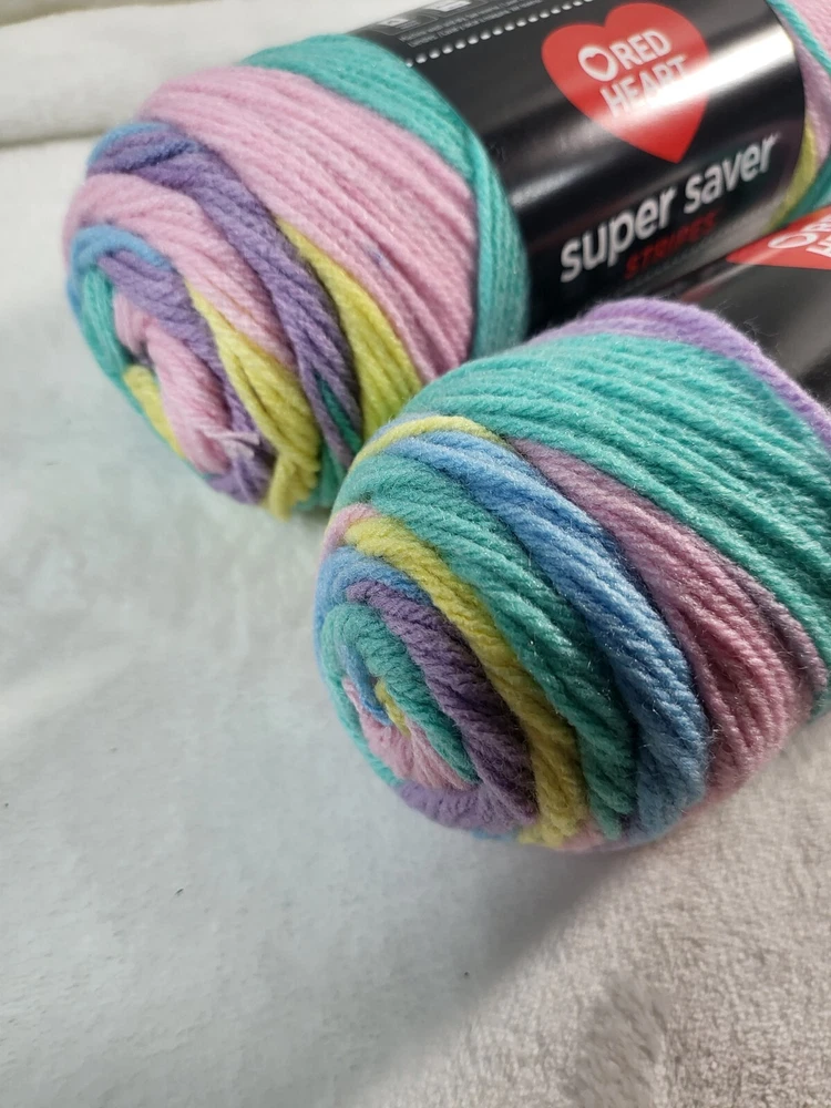 Add some vibrant color to your knitting or crocheting with this lot of Red Heart Super Saver striping yarn. The baby rainbow design is perfect for creating cute and playful pieces, while the acrylic fiber content ensures warmth and comfort. The medium/worsted weight yarn is versatile and easy to work with, making it a great choice for both beginners and experienced crafters. This lot includes two skeins of multicolor yarn, each measuring approximately 100 yards. Get creative and let your imagination run wild with this fun and stylish Red Heart Super Saver Lot of 2 Stripes Yarn!