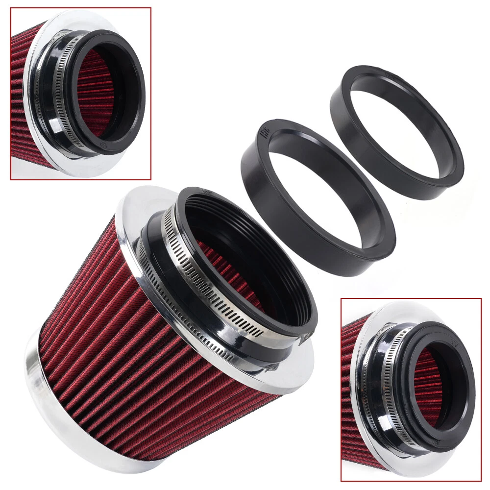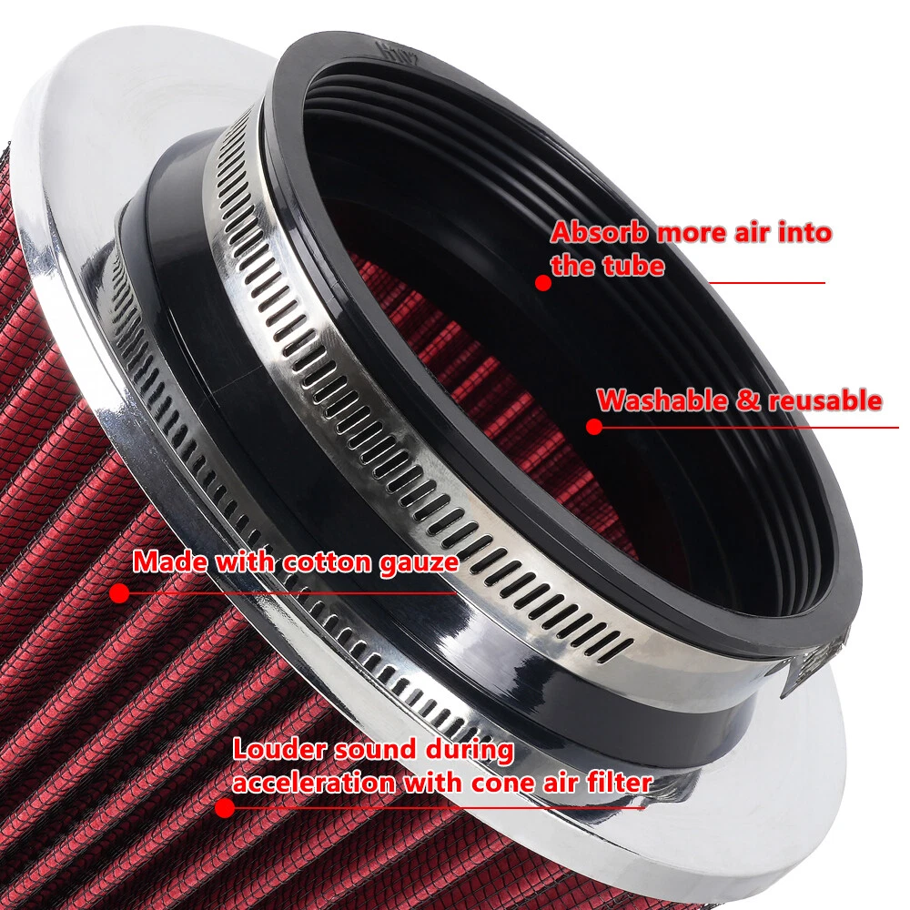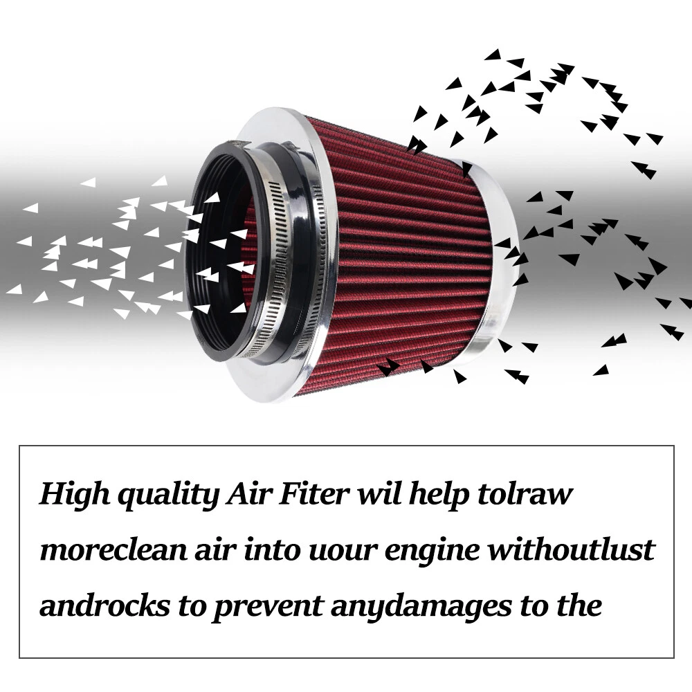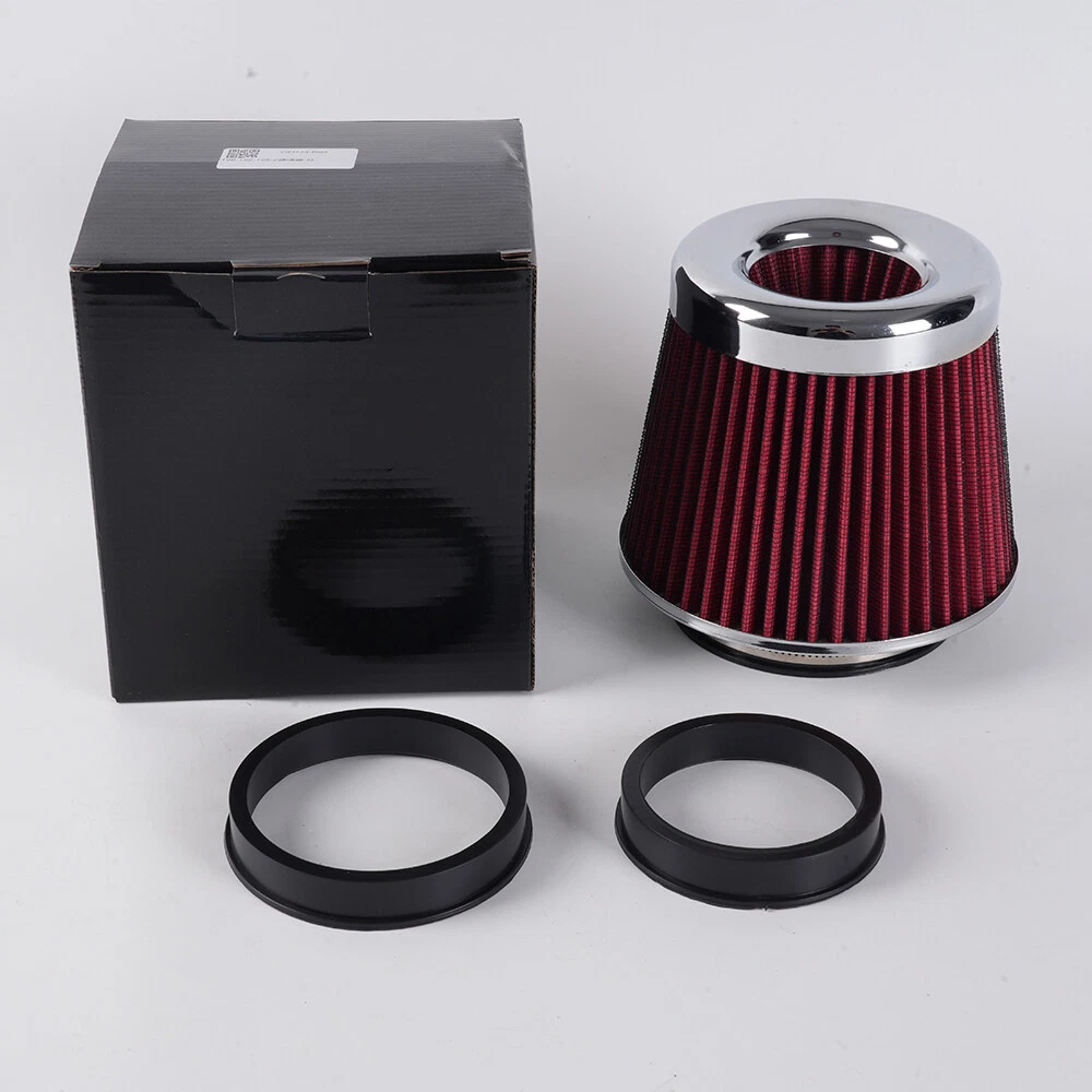 Red High Flow Performance Cold Air Intake Air Filter 3"/3.5"/4" Inlet 5" Tall SPECIFICATIONS: Type: Air Filter Material: Non-woven Fabric + Rubber + Metal Air Filter Type: Dry Air Filter Style: Round Tapered Air Filter Length (in.): 5" Air Filter Bottom Measurement: 6" Inlet Flange Inside Diameter (in.): Caliber:102mm(4")/ Caliber:89mm(3.5")/ Caliber:76mm(3") FEATURES: 100% Brand New and Never Used or Installed Increase horsepower, torque and improve the gas mileage. It universally fit for any 3inch/3.5inch/4inch air intake hose. The high flow air filter help engine to draw more cooler air resulting in betterthrottle response & higher explosive horsepower output. It comes with a washable and reusable cone air filter and a clamp. Filter consisted of 2 layers to double the filtration efficiency. [How often should air intake filter be replaced?] It should be inspected once a year or every 15,000 to 30,000 miles, but this can varybased on the car and driving environment. If you often drive through dusty terrain oron unpaved roads, you may need to change it more frequently. PACKAGE INCLUDE: 1 × Air Filter 1 × Clamp 2 × Rubber Ring Adapters All accessories in the picture are included. SHIPPING INFORMATION PAYMENT WARRANTY ABOUT US CONTACT US SHIPPING INFORMATION We will only ship this item to buyers by Normal Mail, please confirm your address is correct, and if you want to change the delivery address, just feel free to contact us when you purchase. Usually, we will ship the orders out and upload the tracking number within 1-2 business days(Monday to Saturday from 8:30am-5:30pm) after you complete the payment. PAYMENT We will only accept eBay payment. Please pay using eBay payment ONLY within 7 days from the date of transaction be made. WARRANTY Please inspect your order upon receipt.No damage claims will be honored after 14 days of delivery. All item we sold come with 90 days defective warranty from the date. ABOUT US We are a powerful factory producing auto parts,and we have a professional sales and after-sales team that can provide you with excellent products and services. CONTACT US For any reason you want to contact us,We aim at satisfying every visitor, no matter what kind of situation you meet with, we will be right here to serve you. Please contact our team. If you are happy with the transaction with us, leaving us an ALL-5-STAR positive feedback would be greatly appreciated. Have a good shopping.