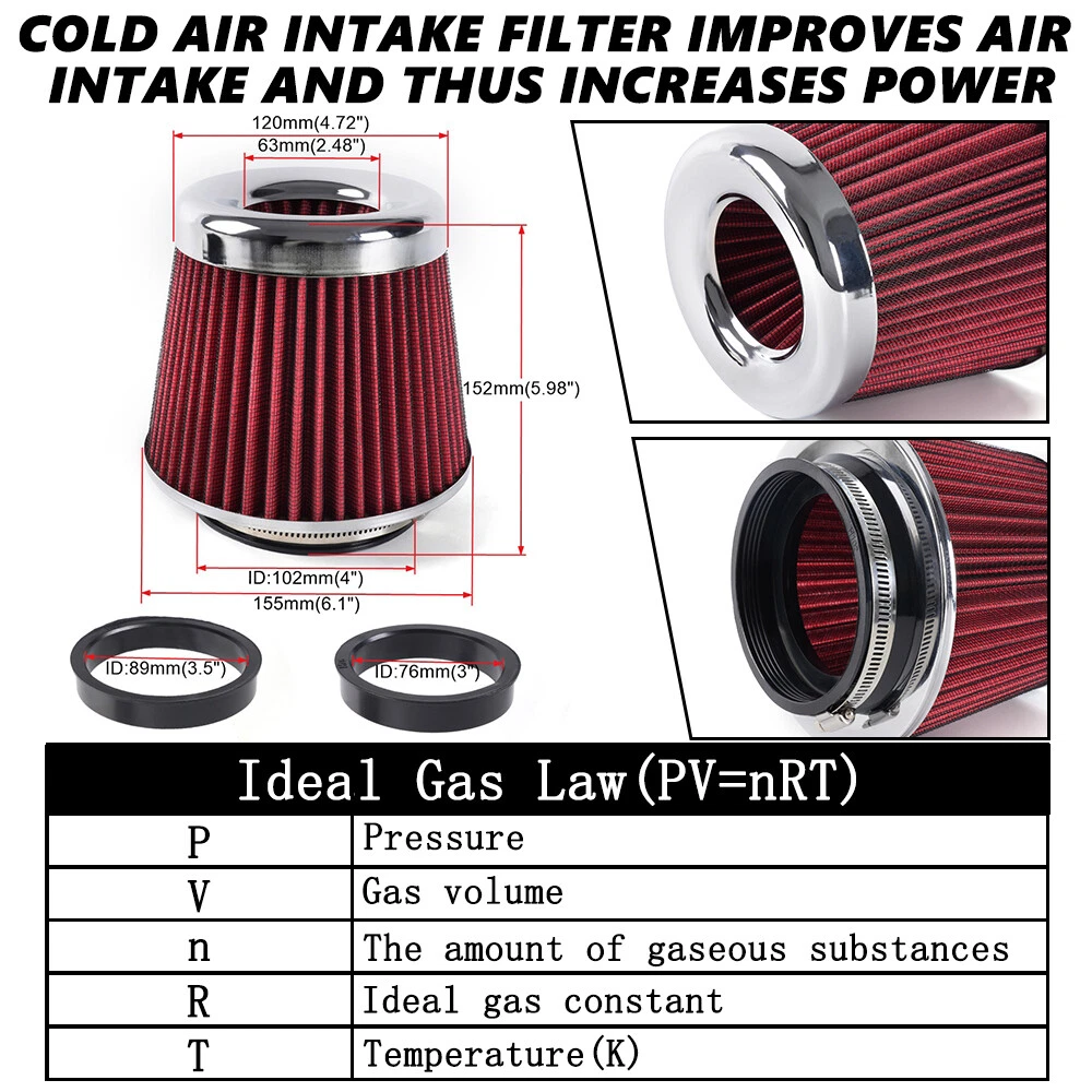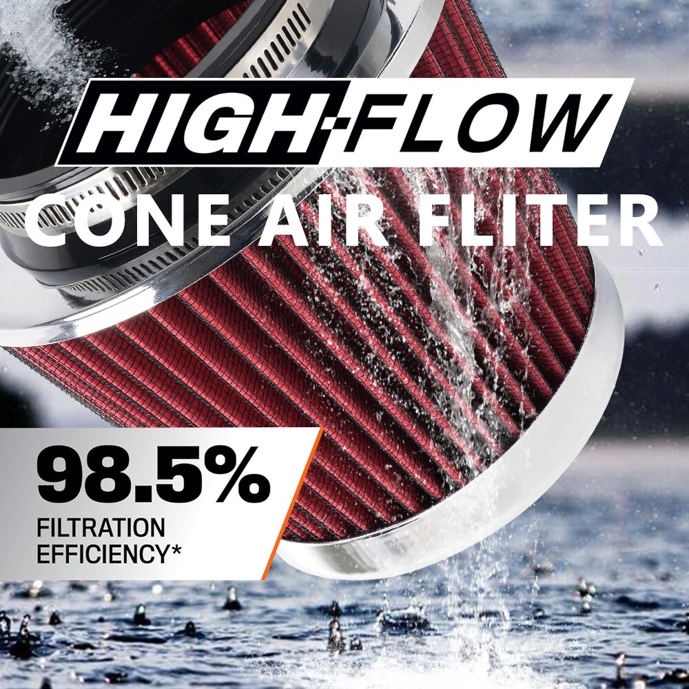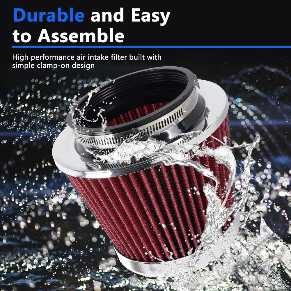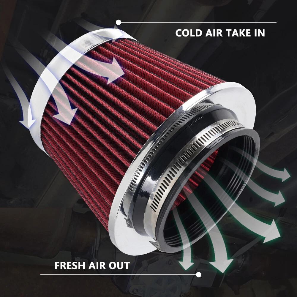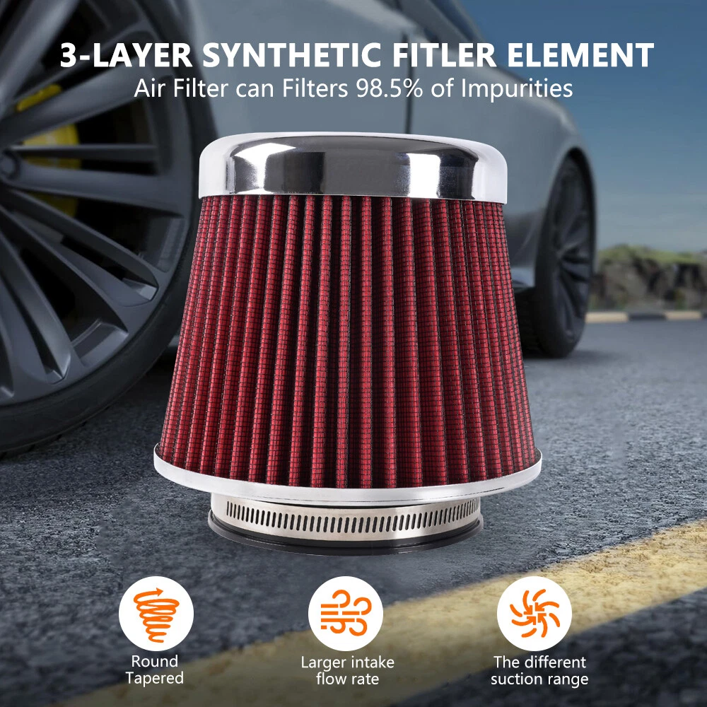 Red High Flow Performance Cold Air Intake Air Filter 3"/3.5"/4" Inlet 5" Tall SPECIFICATIONS: Type: Air Filter Material: Non-woven Fabric + Rubber + Metal Air Filter Type: Dry Air Filter Style: Round Tapered Air Filter Length (in.): 5" Air Filter Bottom Measurement: 6" Inlet Flange Inside Diameter (in.): Caliber:102mm(4")/ Caliber:89mm(3.5")/ Caliber:76mm(3") FEATURES: 100% Brand New and Never Used or Installed Increase horsepower, torque and improve the gas mileage. It universally fit for any 3inch/3.5inch/4inch air intake hose. The high flow air filter help engine to draw more cooler air resulting in betterthrottle response & higher explosive horsepower output. It comes with a washable and reusable cone air filter and a clamp. Filter consisted of 2 layers to double the filtration efficiency. [How often should air intake filter be replaced?] It should be inspected once a year or every 15,000 to 30,000 miles, but this can varybased on the car and driving environment. If you often drive through dusty terrain oron unpaved roads, you may need to change it more frequently. PACKAGE INCLUDE: 1 × Air Filter 1 × Clamp 2 × Rubber Ring Adapters All accessories in the picture are included. SHIPPING INFORMATION PAYMENT WARRANTY ABOUT US CONTACT US SHIPPING INFORMATION We will only ship this item to buyers by Normal Mail, please confirm your address is correct, and if you want to change the delivery address, just feel free to contact us when you purchase. Usually, we will ship the orders out and upload the tracking number within 1-2 business days(Monday to Saturday from 8:30am-5:30pm) after you complete the payment. PAYMENT We will only accept eBay payment. Please pay using eBay payment ONLY within 7 days from the date of transaction be made. WARRANTY Please inspect your order upon receipt.No damage claims will be honored after 14 days of delivery. All item we sold come with 90 days defective warranty from the date. ABOUT US We are a powerful factory producing auto parts,and we have a professional sales and after-sales team that can provide you with excellent products and services. CONTACT US For any reason you want to contact us,We aim at satisfying every visitor, no matter what kind of situation you meet with, we will be right here to serve you. Please contact our team. If you are happy with the transaction with us, leaving us an ALL-5-STAR positive feedback would be greatly appreciated. Have a good shopping.