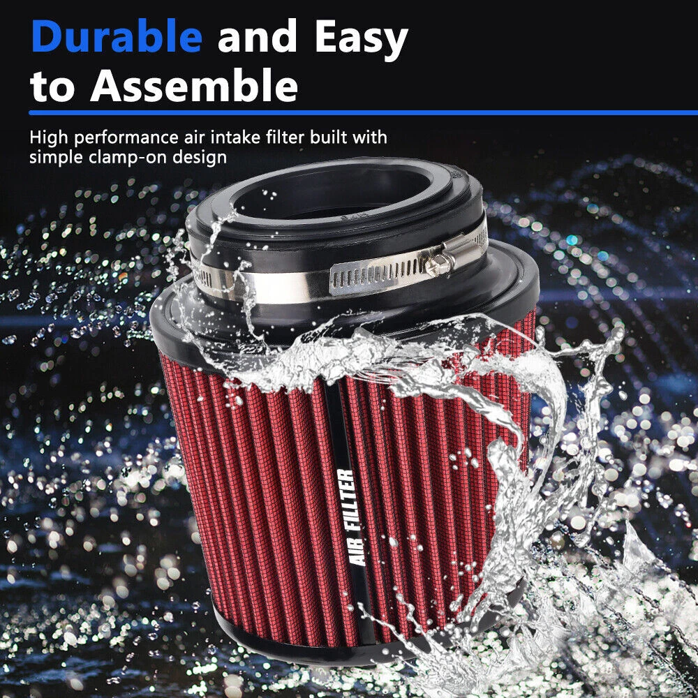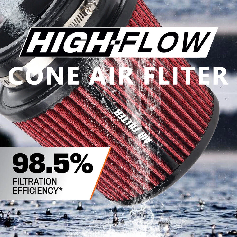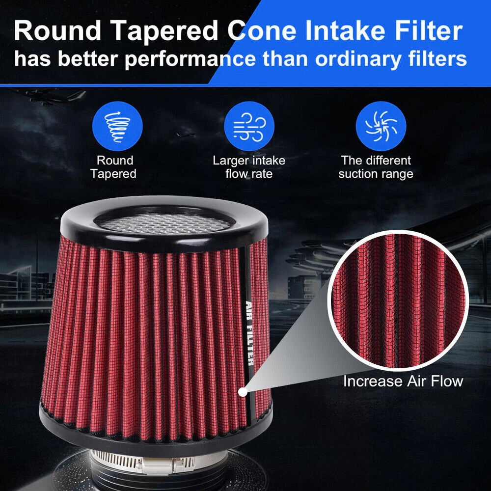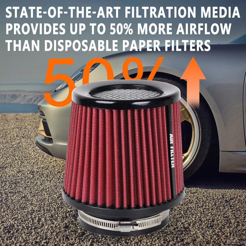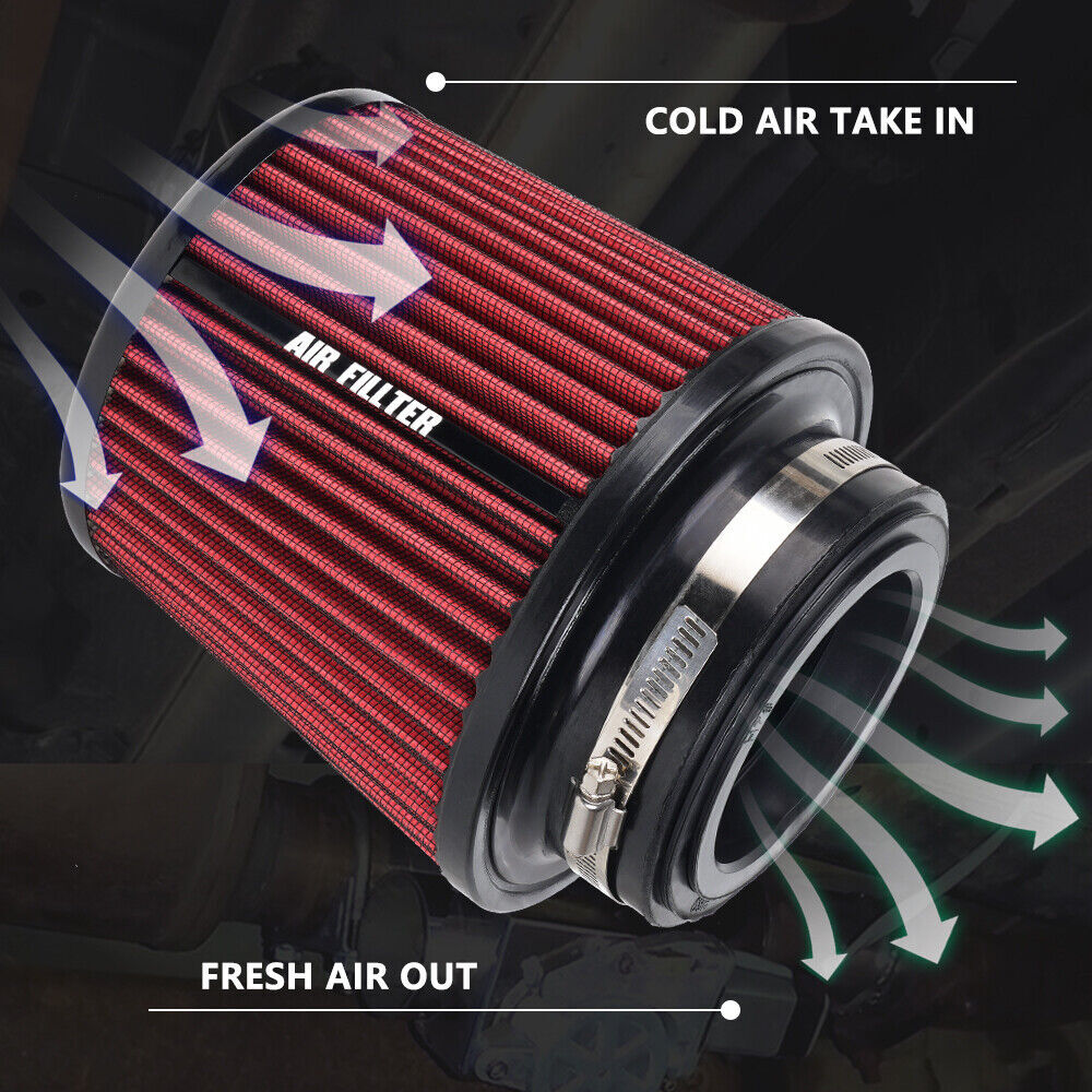 Red High Performance Cold Air Intake Air Filter 3", 3.5", 4" Inlet, 6.5" Tall SPECIFICATIONS: Type: Air Filter Material: Non-woven Fabric + Rubber + Metal Air Filter Type: Dry Air Filter Style: Round Tapered Inlet Flange Inside Diameter (in.): 3" / 3.5" / 4" FEATURES: 100% Brand New and Never Used or Install ed Increase horsepower, torque and improve the gas mileage. It universally fit for any 3inch/3.5inch/4inch air intake hose. The high flow air filter help engine to draw more cooler air resulting in better throttleresponse & higher explosive horsepower output. It comes with a washable and reusable cone air filter and a clamp. Filter consisted of 2 layers to double the filtration efficiency. [How often should air intake filter be replaced?] It should be inspected once a year or every 15,000 to 30,000 miles, but this can varybased on the car and driving environment. If you often drive through dusty terrain oron unpaved roads, you may need to change it more frequently. PACKAGE INCLUDE: 1 × Air Filter 1 × Clamp 1 × 3" ID Rubber Ring Adapters 1 × 3.5" ID Rubber Ring Adapters All accessories in the picture are included. SHIPPING INFORMATION PAYMENT WARRANTY ABOUT US CONTACT US SHIPPING INFORMATION We will only ship this item to buyers by Normal Mail, please confirm your address is correct, and if you want to change the delivery address, just feel free to contact us when you purchase. Usually, we will ship the orders out and upload the tracking number within 1-2 business days(Monday to Saturday from 8:30am-5:30pm) after you complete the payment. PAYMENT We will only accept eBay payment. Please pay using eBay payment ONLY within 7 days from the date of transaction be made. WARRANTY Please inspect your order upon receipt.No damage claims will be honored after 14 days of delivery. All item we sold come with 90 days defective warranty from the date. ABOUT US We are a powerful factory producing auto parts,and we have a professional sales and after-sales team that can provide you with excellent products and services. CONTACT US For any reason you want to contact us,We aim at satisfying every visitor, no matter what kind of situation you meet with, we will be right here to serve you. Please contact our team. If you are happy with the transaction with us, leaving us an ALL-5-STAR positive feedback would be greatly appreciated. Have a good shopping.