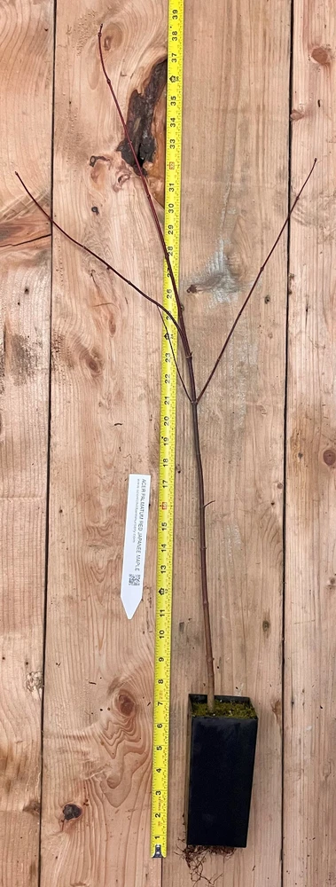 Red Japanese Maple -Acer palmatum atropurpureum Available as 24-30+ inch potted trees - Shipped fully rooted in soil in pot. Ships with leaves in Spring and Summer and dormant without leaves in Fall and Winter. This Japanese Maple a relatively slow growing tree, growing 1-2 ft a year. Mature height is 15-25 foot tall and 10-15 foot wide. Our Red Japanese Maples are grown from seed from the "Bloodgood" variety. They are selected for their bright/dark red leaf color. Since they are seeded and not grafted, they make an excellent bonsai tree, growing true to their red color even if pruned close to roots. Also an ideal choice for an specimen tree, or woodland under story in USDA zones 5-9. Japanese maples should be protected from drying winds and direct sun in the Southern part of their range. More sun can be tolerated in Northern States. Good drainage is important, so do not plant in a low boggy area. Keep grass and weeds away from around the tree to reduce competition. Very tolerant to pruning. Second photo shows a dormant 2 year old tree. *Pots may be removed prior to shipping Free Shipping to most locations . We cannot ship to AK, HI, APO, US Territories, or areas considered remote without a freight surcharge. If your temperature is warmer than 89 degrees or colder than 20 degrees, we will hold order until temperature improves. Please put your desired ship date in Special Instructions to Seller at checkout. All plants are inspected for quality prior to shipment. Let us know upon arrival if you have any concerns regarding your plant's condition. Please message us prior to placing your order if you have any questions. Scenic Hill Farm is a licensed Oregon Nursery 10/24