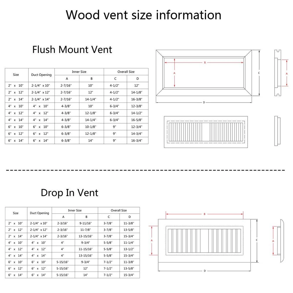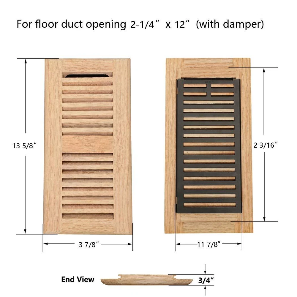 The oak floor register vent cover is fit for 2-1/4x12 inch duct opening on flooring. The floor register vent can drop in duct opening on existing floor. It sits on top of flooring, surface mounted on flooring. Louvered design is easy for air flow. With adjustable sliding damper on backside to control air flow easily. Please kindly check the size detail chart carefully before you buy the oak floor register.