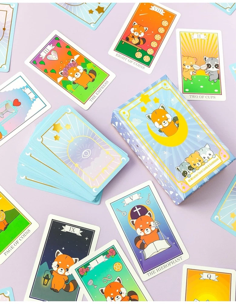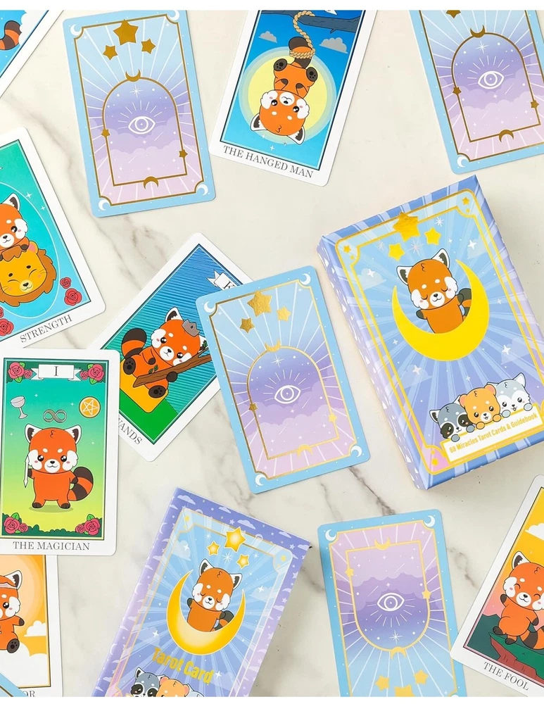 Red Panda & Friends 88 Miracles Tarot Card & Guidebook (NEW). Enchanting Design - Enter the mystical world of tarot with Red Panda & Friends Tarot Cards. These oracle cards offer vibrant prints and imagery that evoke a sense of mystery, serenity, and anticipation. Crafted by spiritual artists from the USA, each card is a window to accurate symbolic interpretation. Premier Quality & Durability - Constructed with the intention to accompany you through countless sessions of introspection and guidance, these tarot cards are made from high-quality materials. Their beautiful colors, refined edges, and the tactile pleasure they provide during shuffling and handling are a treat to inspire and endure. Comprehensive Guidebook Included - Improve your understanding of tarot with our guidebook, offering three times the insight found in typical manuals. This compendium of symbolic meanings delves into the past, present, and future, enriching your readings and expanding your interpretative skills with detailed explanations of each oracle card's significance. Instant Access to Online Course & Community - Whether you're a beginner eager to learn the art of tarot reading or an advanced practitioner looking to deepen your knowledge, our exclusive online course and community offer a space for growth and connection. Engage with fellow enthusiasts, share insights, and enhance your practice with the support of a like-minded collective. Perfect Gift of Mystical Insight - In the realm of tarot, the tradition holds that a deck received as a gift carries special energy and positive karma. Embrace this belief by gifting the Red Panda & Friends Tarot Cards to someone special or treating yourself with love and intention. It's an invitation to embark on a personal journey of discovery and enlightenment.