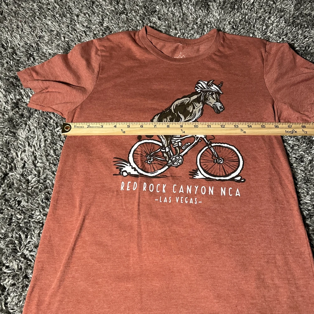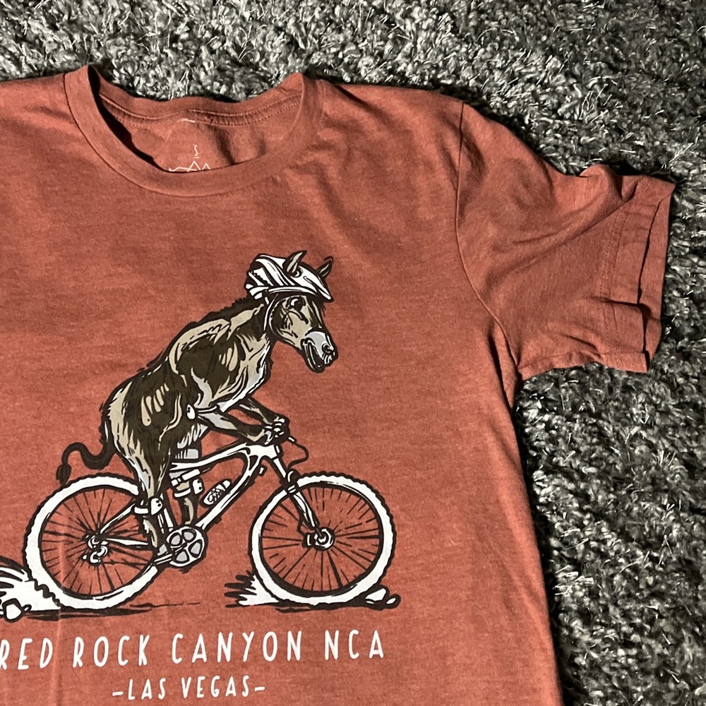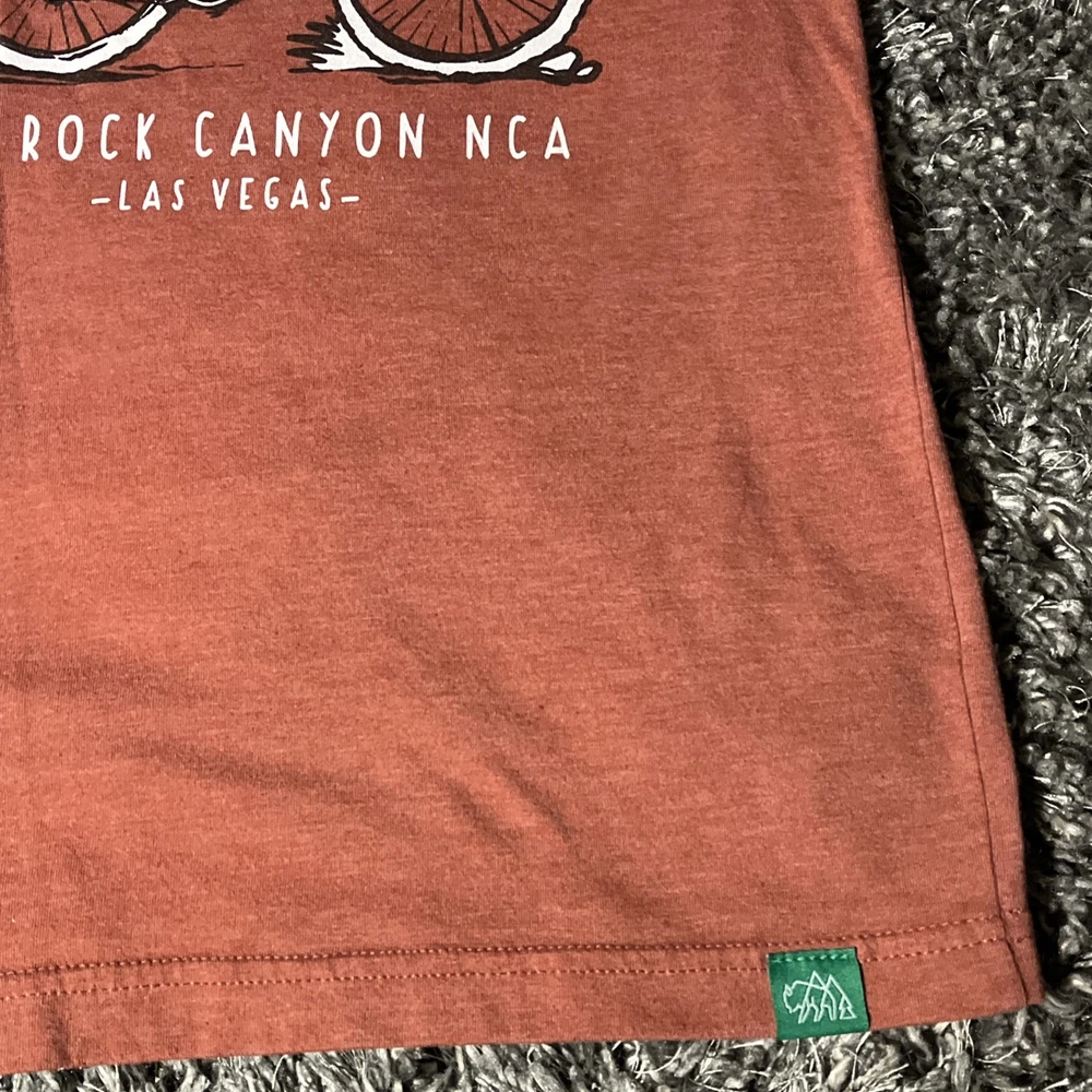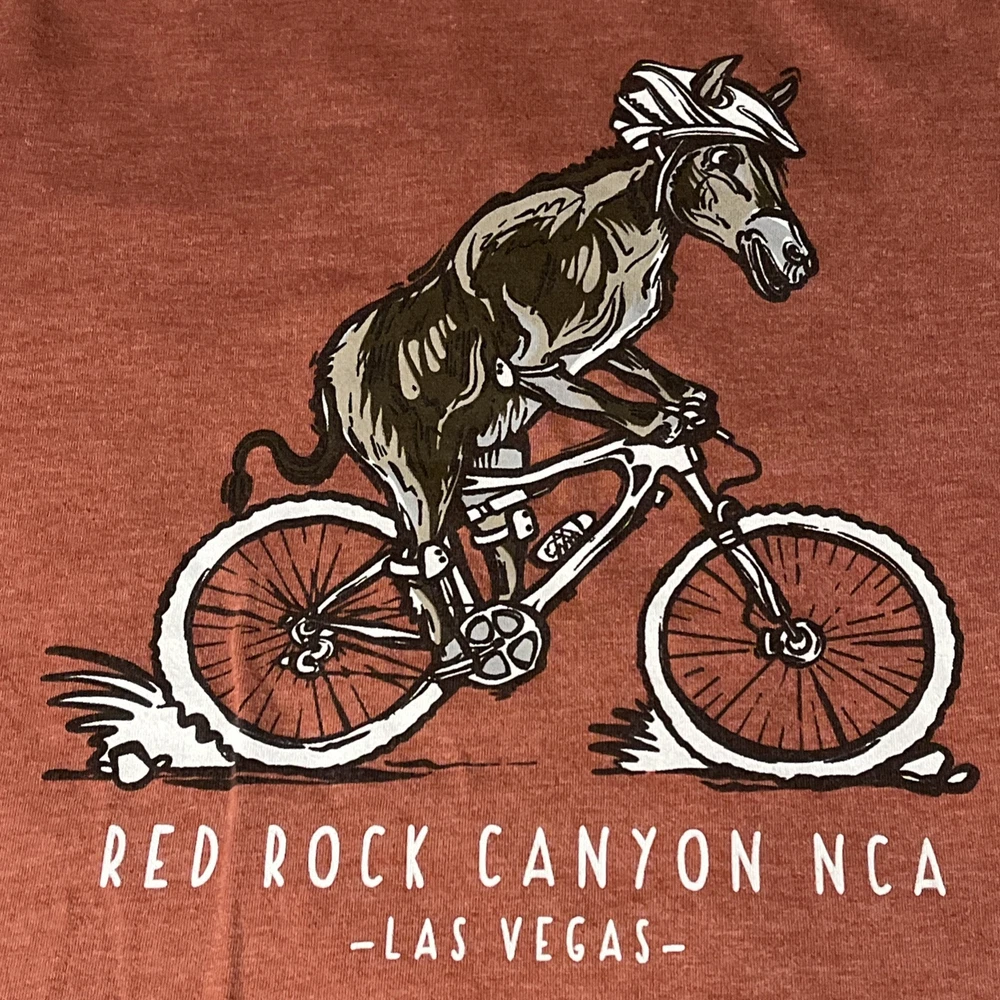 This is a men's size small red T-shirt featuring a graphic print of Red Rock Canyon NCA in Las Vegas. The shirt has a crew neck and short sleeves, made of a polyester and cotton knit fabric that is lightweight and easy to care for. The design includes a donkey and bike illustration, with accents of the Wild Tribute 4 The Parks logo, embodying themes of nature, national parks, camping, biking, and the outdoors. This athletic fit shirt is suitable for all seasons and is a souvenir for those who enjoy travel and wilderness destinations.