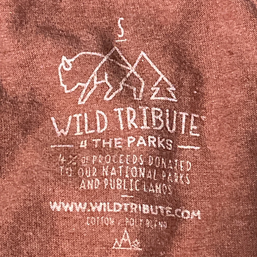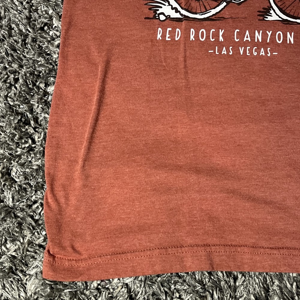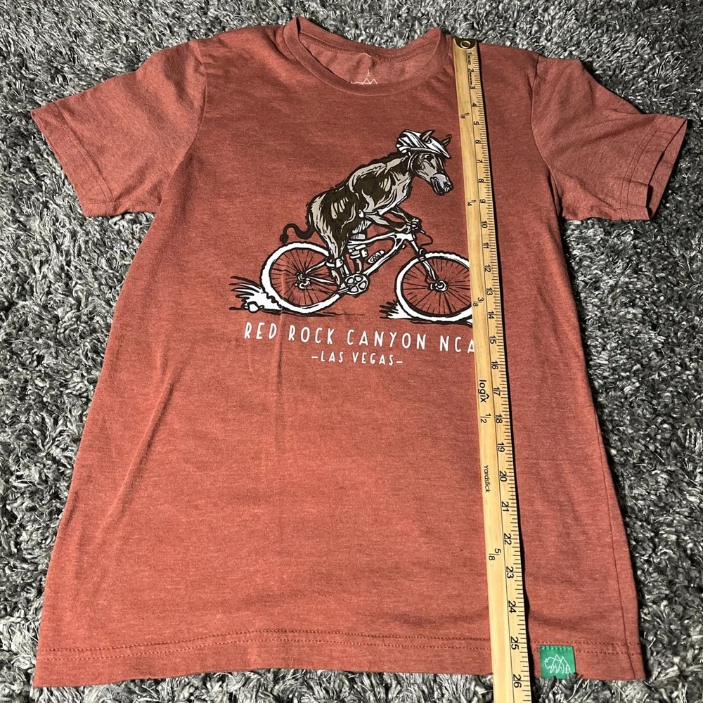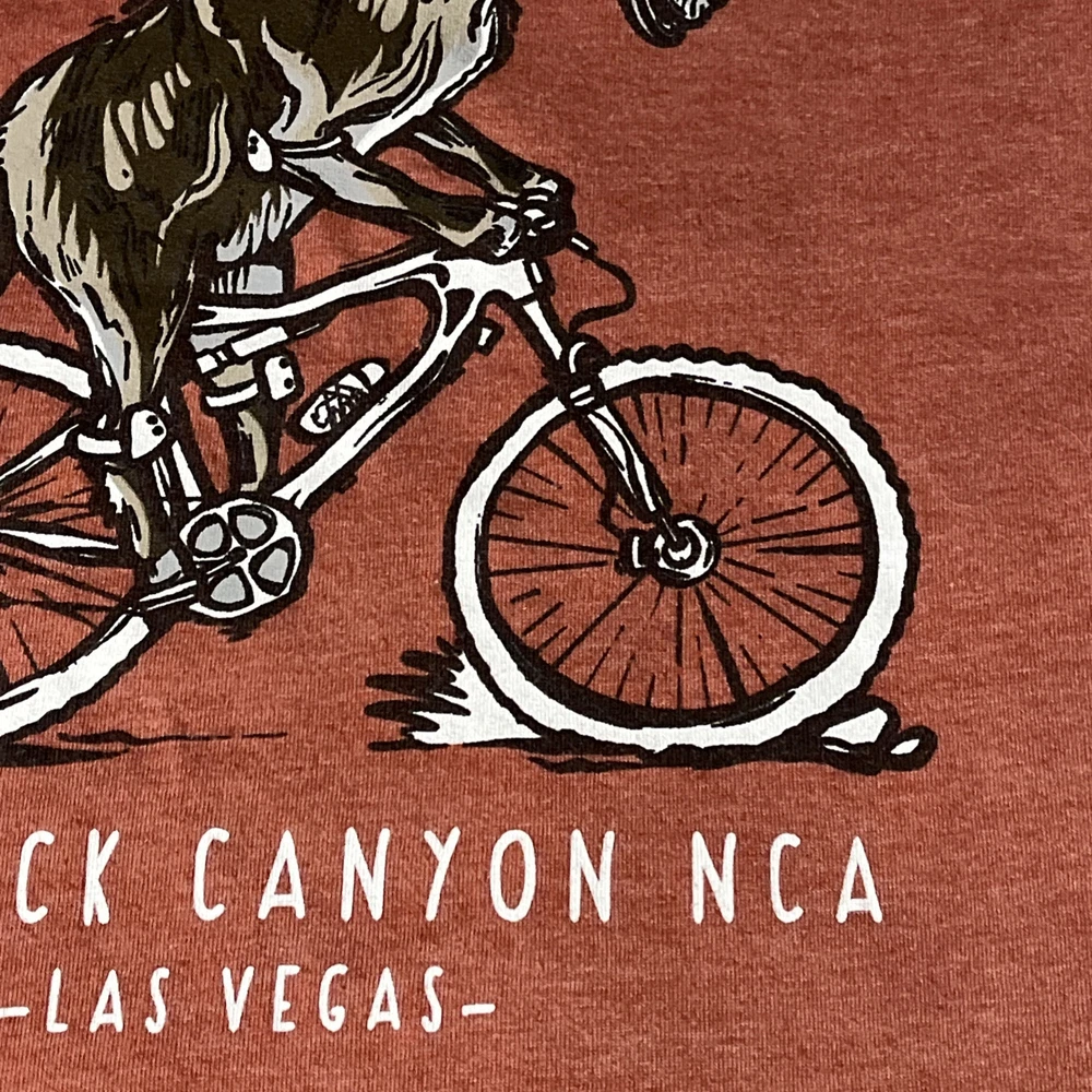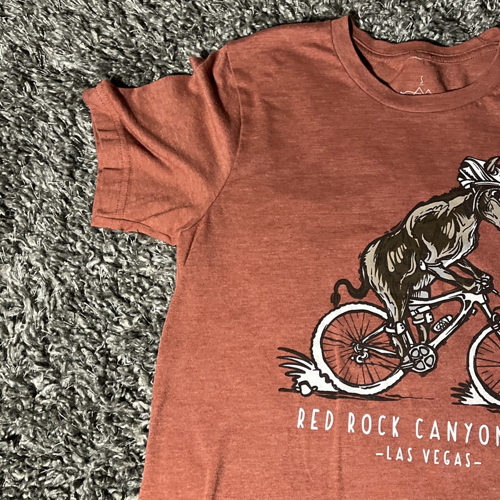 This is a men's size small red T-shirt featuring a graphic print of Red Rock Canyon NCA in Las Vegas. The shirt has a crew neck and short sleeves, made of a polyester and cotton knit fabric that is lightweight and easy to care for. The design includes a donkey and bike illustration, with accents of the Wild Tribute 4 The Parks logo, embodying themes of nature, national parks, camping, biking, and the outdoors. This athletic fit shirt is suitable for all seasons and is a souvenir for those who enjoy travel and wilderness destinations.