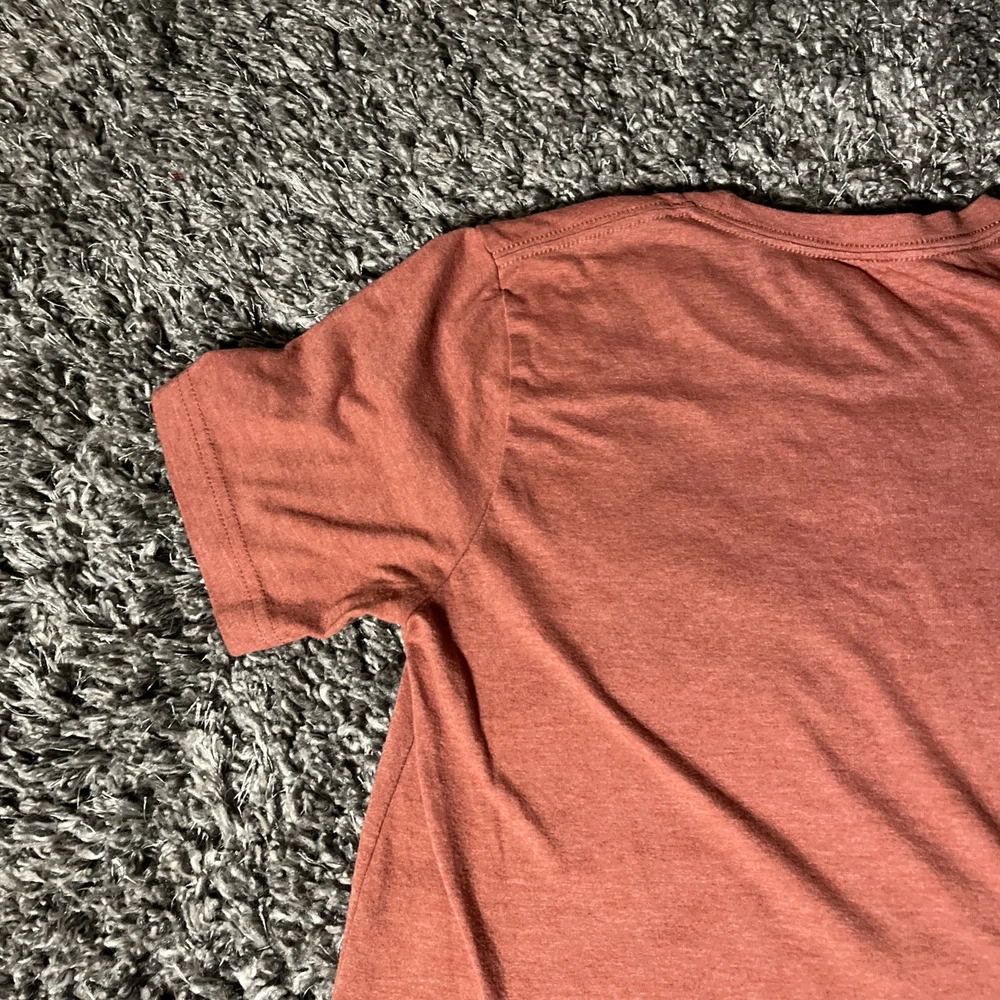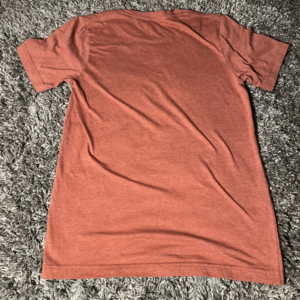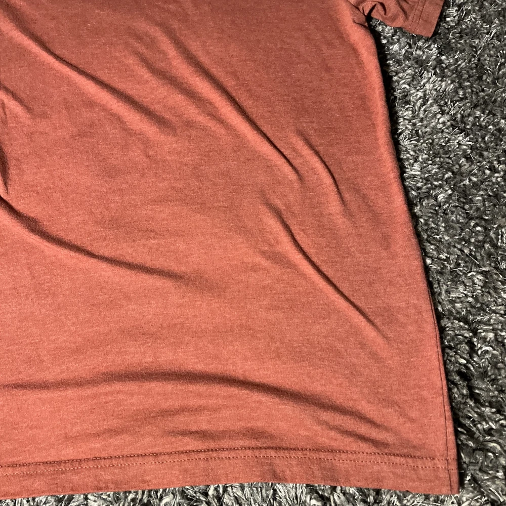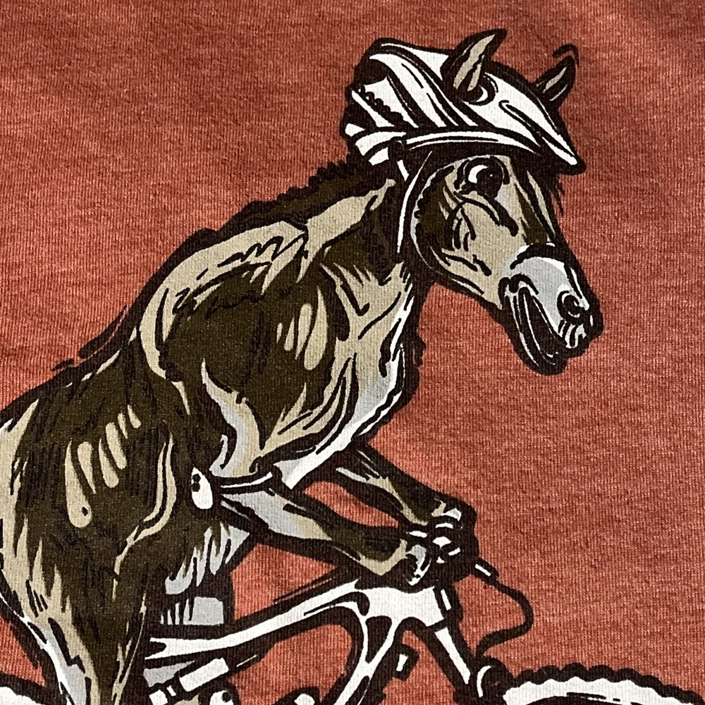This is a men's size small red T-shirt featuring a graphic print of Red Rock Canyon NCA in Las Vegas. The shirt has a crew neck and short sleeves, made of a polyester and cotton knit fabric that is lightweight and easy to care for. The design includes a donkey and bike illustration, with accents of the Wild Tribute 4 The Parks logo, embodying themes of nature, national parks, camping, biking, and the outdoors. This athletic fit shirt is suitable for all seasons and is a souvenir for those who enjoy travel and wilderness destinations.