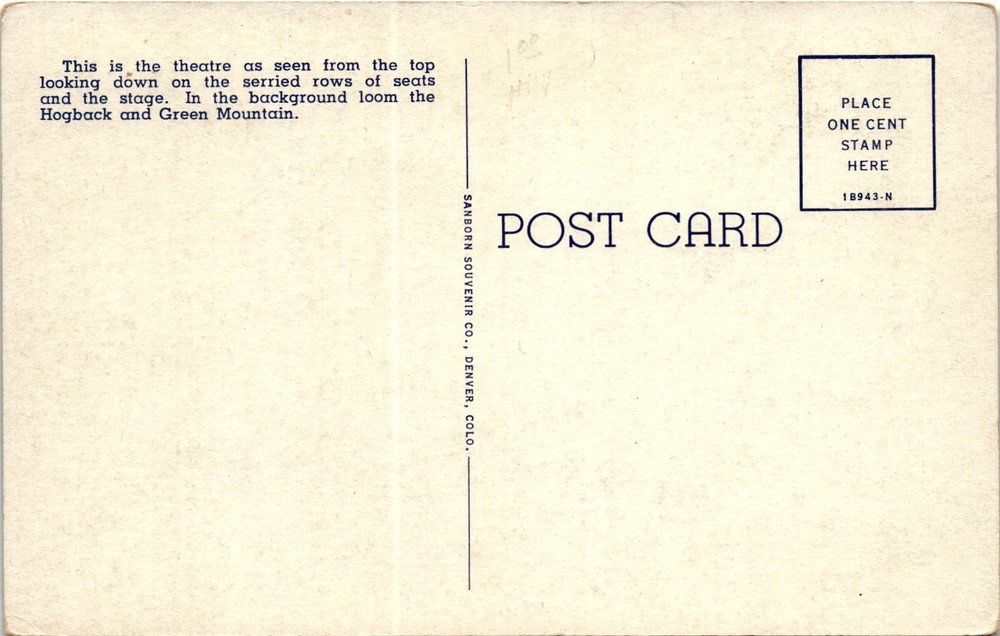 MAKE AN OFFER. THE MORE YOU BUY THE BETTER DEAL I WILL ACCEPT The postcard features an image of the Red Rocks Amphitheatre in the Park of the Red Rocks, part of the Denver Mountain Parks in Colorado. The amphitheater is shown from the top, providing a view of the rows of seats and the stage below, with the Hogback and Green Mountain in the background.