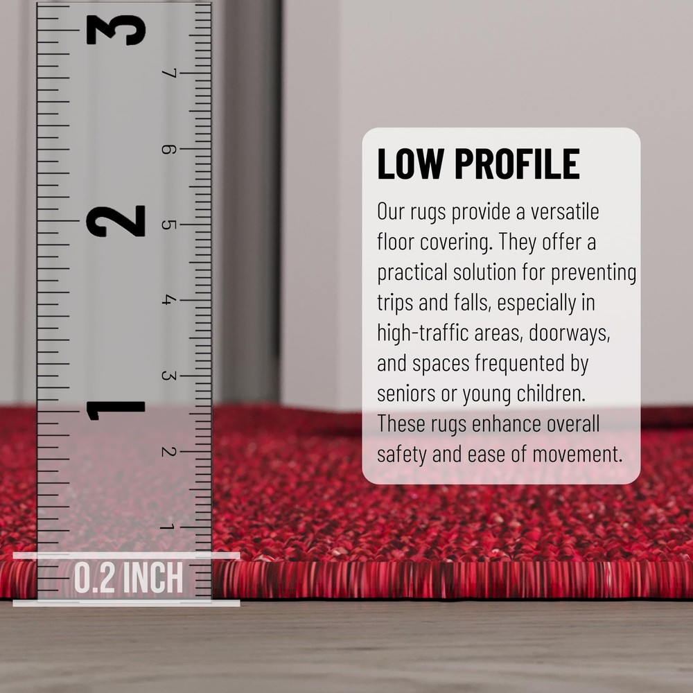 [KEY ATTRIBUTES]: Size: 2'6" x 8' (3' x 8') | Thickness: 0.2 in. | Color: Red [ULTRA THIN]: An ultra thin pile thickness of 0.2 inches offers ideal functionality that is perfect for busy areas, underneath furniture, and in entryways as it will not obstruct doorways. [NONSLIP & STAIN RESISTANT]: Made in Turkey with high quality and stain resistant Polyester material. The rubber backing minimizes slipping. To ensure comfort and additional grip, a separate purchase of a rug pad is recommended. [TRENDY STYLE]: This unique and modern rug features a solid design that will enlighten any room while also adding color and enhancing the look of your home. Its timeless design can be integrated into a variety of home décor styles. [RECOMMENDED ROOM]: This rug will add the finishing touches to your living room, dining room, office, bedroom, foyer/entryway, kitchen, nursery, children’s playroom and finished basement.