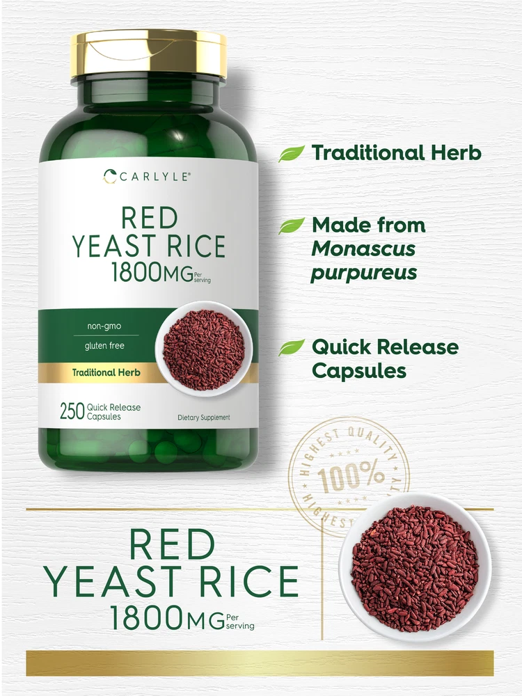 What is Red Yeast Rice? Embedded in Asian nutrition practices for centuries, Red Yeast Rice is a traditional superfood made by fermenting rice in yeast. This produces a dark red rice that is packed with naturally occurring vitamins and nutrients. Red Yeast Rice is commonly used in Chinese tradition for cooking and now can also be received in supplement form from bulk powder, tablets, liquid, gummies, pills and more! Carlyle Red Yeast Rice: At Carlyle, our Red Yeast Rice is a highly innovative gluten-free and non-GMO supplement, delivering 1,600 mg of Red Yeast Rice per serving in quick-release capsules. We put our ingredients to the test, ensuring exceptional purity and potency, always giving you the best quality you deserve. Enjoy Carlyle Red Yeast Rice and get exceptional value today with our 250-capsule supply! Rooted in Wellness: Our expertise in sourcing the purest ingredients combined with advanced technologies makes us proud to deliver premium, honest supplements at the best value. Carlyle Red Yeast Rice is a testament to our commitment to excellence, made with powerful ingredients rooted in wellness. Thanks for choosing us in your pursuit of living healthy! WARNING: Do not use if you are pregnant, may become pregnant, or are breast feeding because using this product may cause birth defects. If you are taking any medications or have any medical condition, consult your doctor before use. Avoid this product if you have liver disease. Discontinue use and consult your doctor if any adverse reactions occur including muscle pain or weakness, rash or gastrointestinal discomfort. Not intended for use by persons under the age of 18. If seal under cap is damaged or missing, do not use. Keep out of reach of children. Store in a cool, dry place.