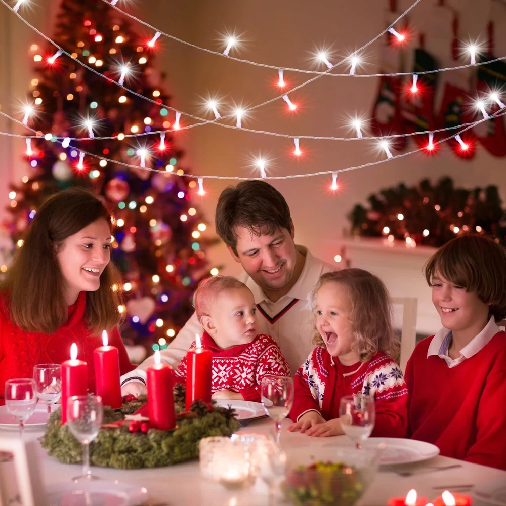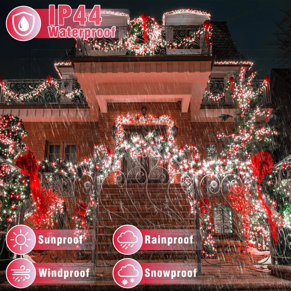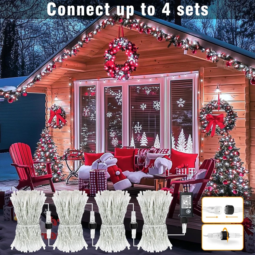 Christmas Lights Outdoor Indoor Decorations 8 Lighting Modes & Timer: The Christmas lights outdoor has 8 different lighting modes, short press the button on the adapter to switch mode. Long press the button until it turns green, timer enabled, the led lights will automatically cycle on for 6 hours a day and off for 18 hours. Waterproof & Durable: The Christmas tree lights is IP44 waterproof and sun-resistant, this allows the led twinkle lights to be used outdoors for years without damage. But please note that the adapter is not waterproof, please do some waterproof protection. Be applied anywhere: This outdoor Christmas lights can be used indoors and outdoors anywhere you want to decorate, such as tree, wedding, party, handrail, deck, window, wall, Christmas decorations, bush, house, patio, porch, bistro, commercial center etc. Plenty of lights will bring a warm and cozy atmosphere. End to end connectable: The end of the led lights has an extendable plug, so these led fairy lights can plug into each other, so if you have more than one strand you will just need one wall plug in. Then all outdoor Christmas lights will be controlled by a plug, and the modes of all twinkle lights for Christmas tree will be synchronized. Safe to use: LED lights use 29 V low voltage that is lower than human body safe voltage for safe use, definitely no risk of electric shock, it is safe for children and pets. All Christmas lights comply with UL testing standards, and the LED beads are low consumption and energy saving, no overheat after long time using, no risk of fire.