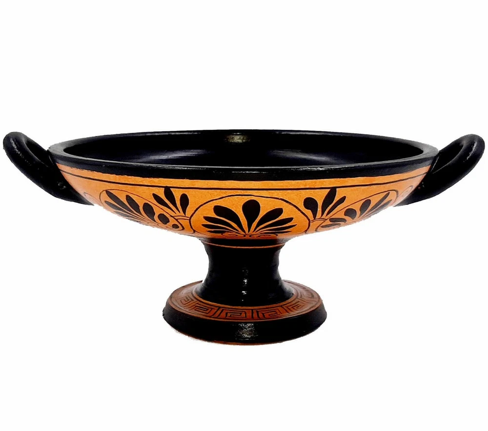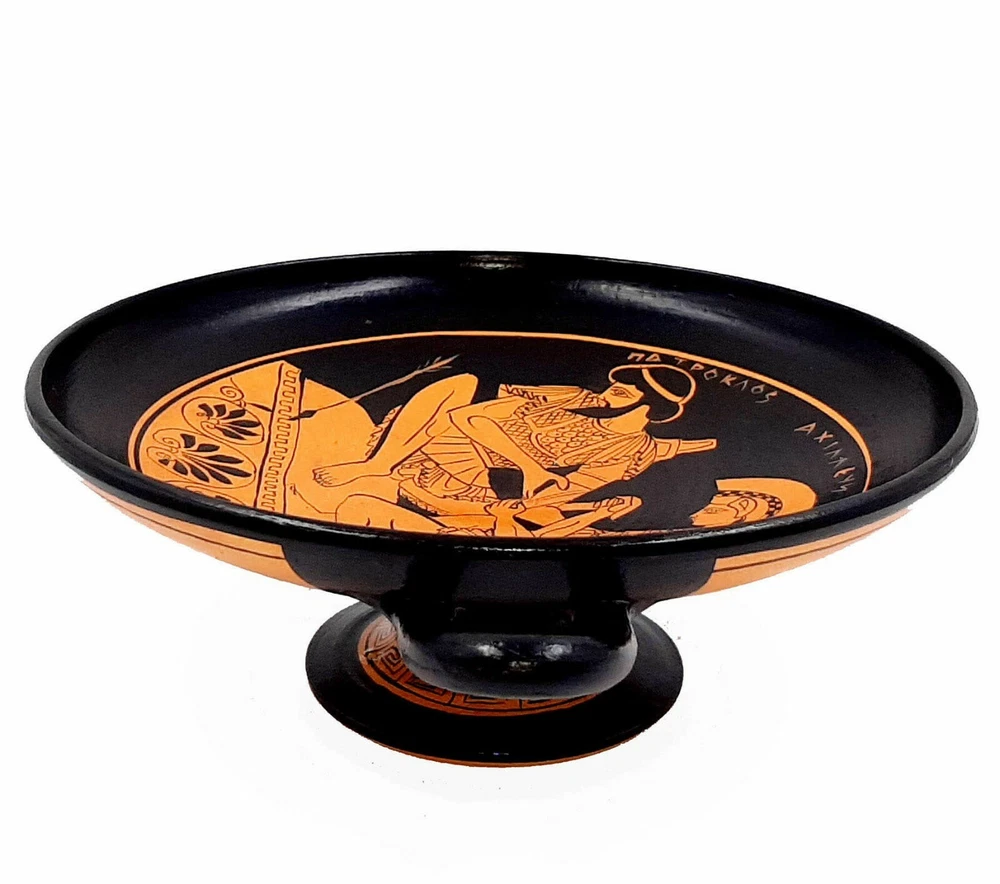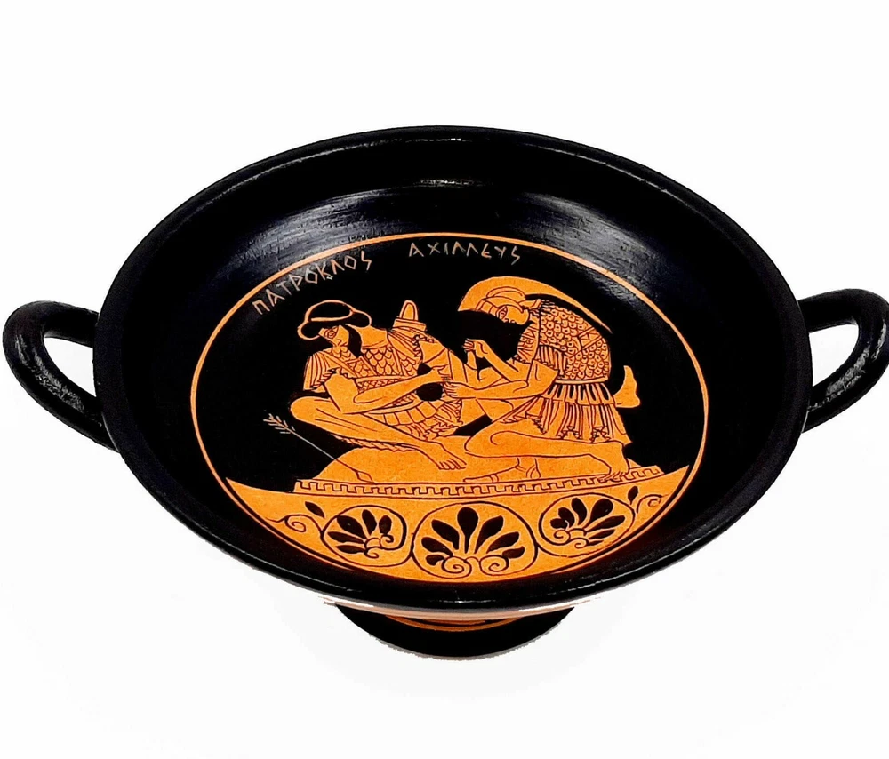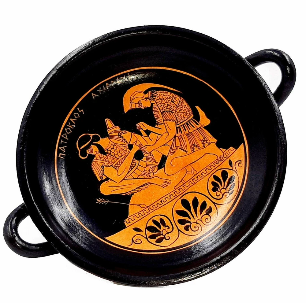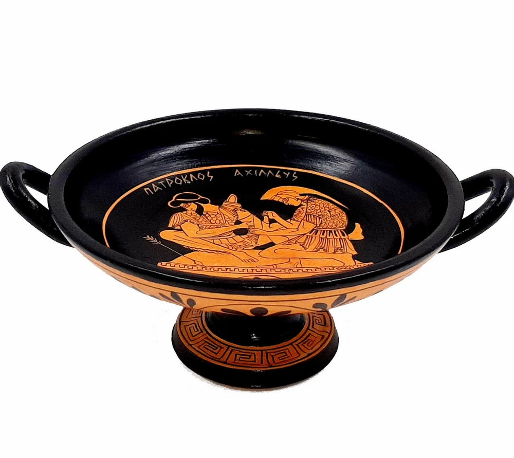 Enhance your decor with a Red figure Kylix from Ancient Greece. In the pottery in Ancient Greece kylix (or cylix) is the most common type of wine-drinking cup. It has a broad, relatively shallow, body raised on a stem from a foot and usually two horizontal handles disposed symmetrically. The main alternative wine-cup shape was the kantharos, with a narrower and deeper cup and high vertical handles. Red-figure vase painting is one of the most important styles of figural Greek vase painting. It developed in Athens around 520 BC and remained in use until the late 3rd century BC.It replaced the previously dominant style of black figure vase painting within a few decades. Its modern name is based on the figural depictions in red colour on a black background, in contrast to the preceding black-figure style with black figures on a red background. Achilles tending the wounded Patroclus.Achilles and Patroclus, are one of the most celebrated male warrior pairs in Greek literature after the Trojan War. Achilles is a young Greek warrior in Homer’s Iliad who possesses superhuman strength and ability as he was born from a nymph and a mortal. He is known for his only weakness being in his heel as his mother dipped him in the river Styx as an infant and held him by his heel. Patroclus is a warrior who grew up as a role model and companion to Achilles as appointed by Achilles’ father. Net weight: 0,7 kgr(1,6lbr), Height:9cm (3,51in) ,Diameter:16cm(6,24in) HAND MADE AND HAND PAINTED IN GREECE / SAFE PACKAGE This product is accompanied by a certificated that are HAND MADE from the start to finish .From the moment being clay and gets up on the wheel, the banking in the furnace, the background creation,the strip the design, the decoration and the finish.We strive to capture and disseminate worldwide the style and culture of our ancestors . The Philosophy of the Company is to create customers that are fully satisfied with the qualityy of our work, but also with our professionalism and consistency,with the aim of buying again and again.We have been shipped small and large orders at all over the world for many years since 1986. So we have the experience to take great care of the packaging. We use techniques that the vases travel very safely. We are next to each customer for any markings or clarification. So dont hesitate to contact with us ,before or after the order. FREE TRACKING NUMBER We need 1-3 business days to ship from Greece,and we will send you,immediately the tracking number of your shipment.About the Delivery time we have: FREE AND FAST SHIPPING DELIVERY TIME IN EUROPE: 1-6 Business days with DHL DELIVERY TIME WORLDWIDE: 2-7 Business days with DHL This item is only for decoration.Not for use!