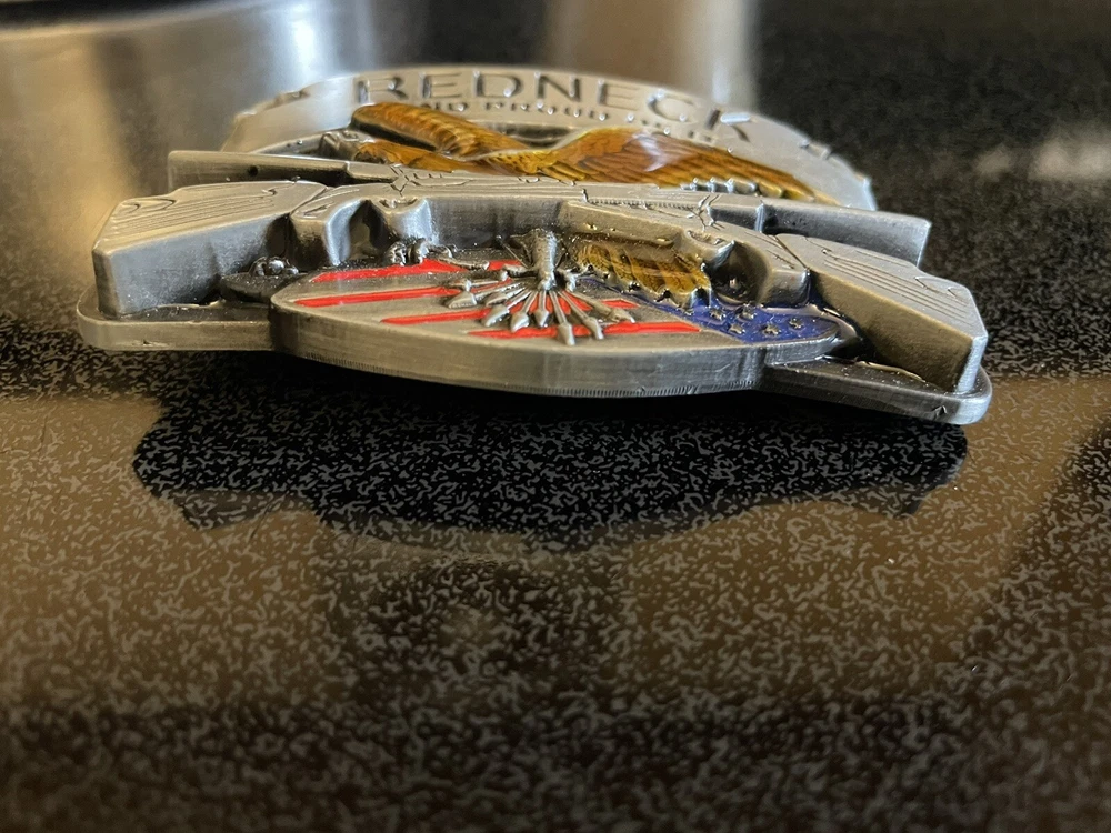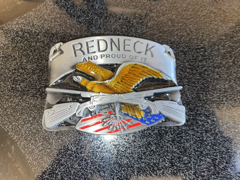 Redneck and proud of it belt buckle It is about 3 1/2 inches wide and 2 1/2 inches tall. It is brand new, never been worn. Thank you for looking!