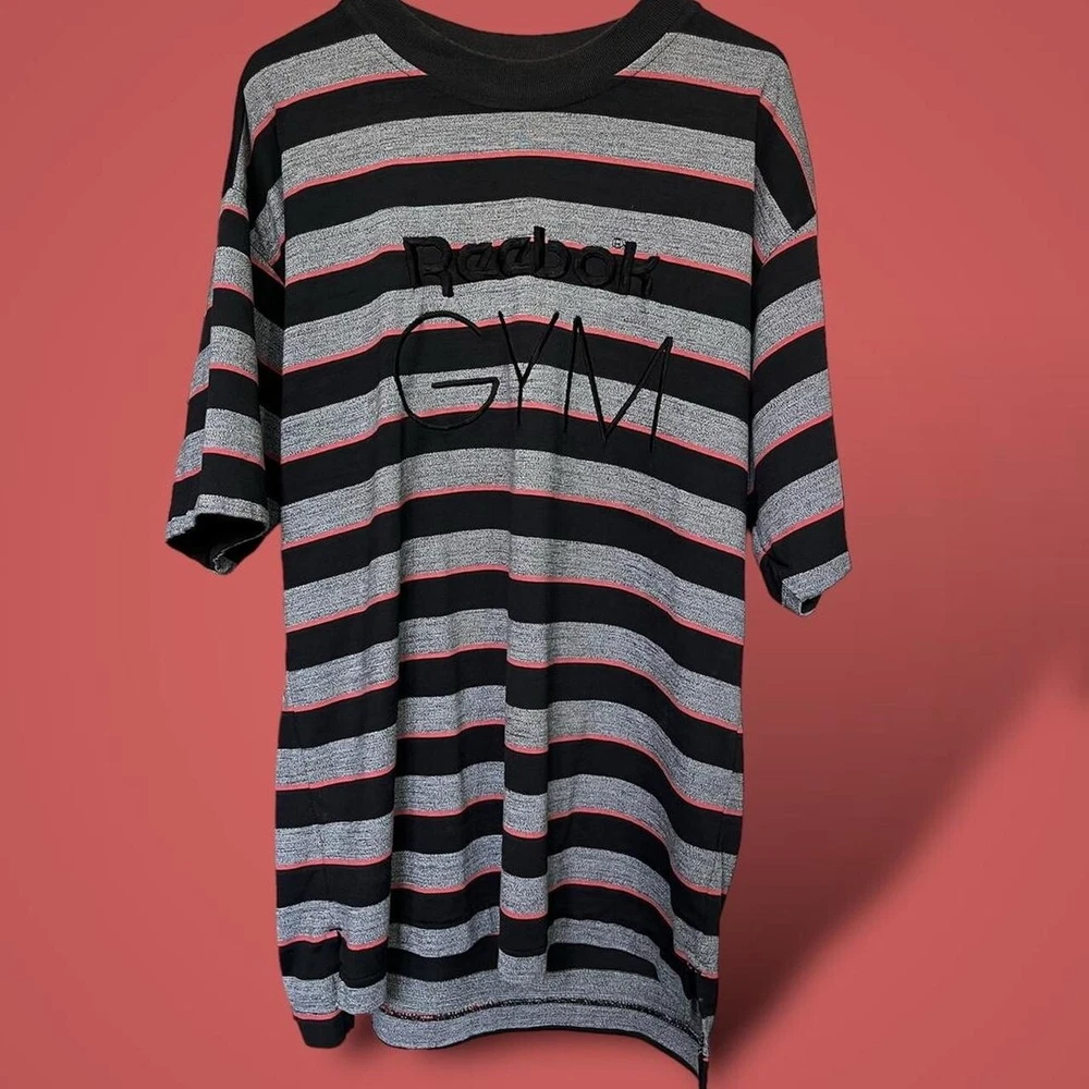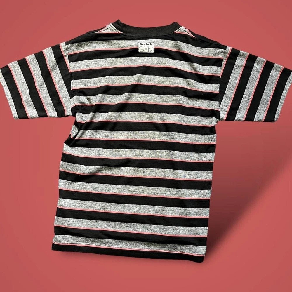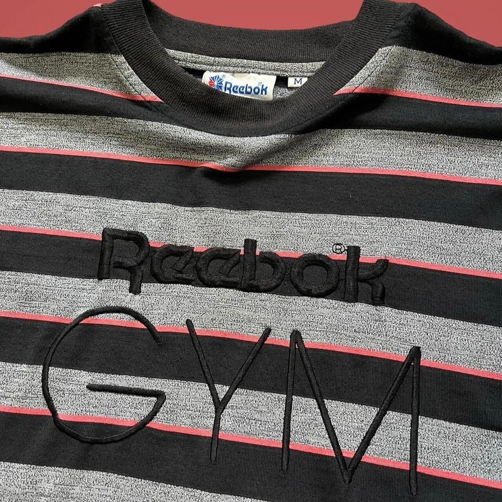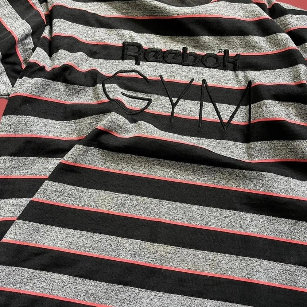 Reebok embroidered heavyweight t shirt | striped grey black 💡 good preloved condition / light general wear 💡 embroidered front 💡 heavyweight cotton/ polyester blend fabric 📐 size M p2p 21" l28" boxy fit